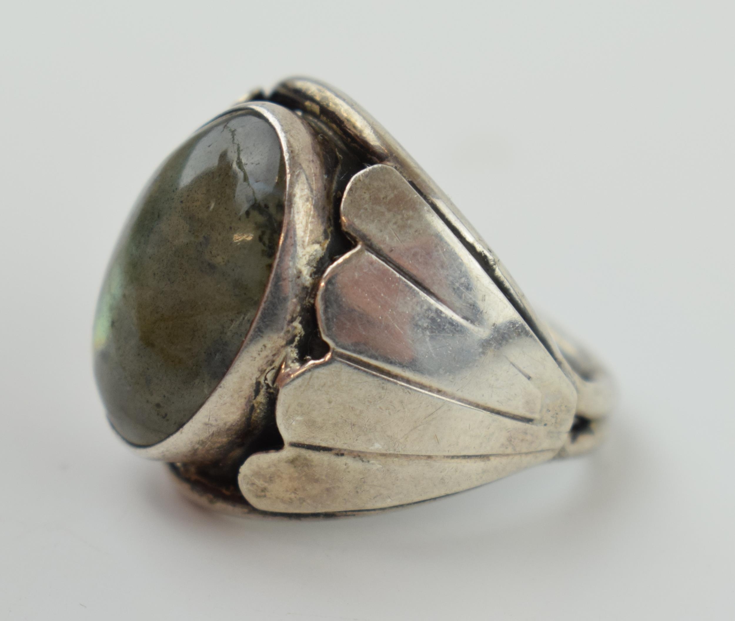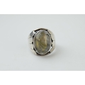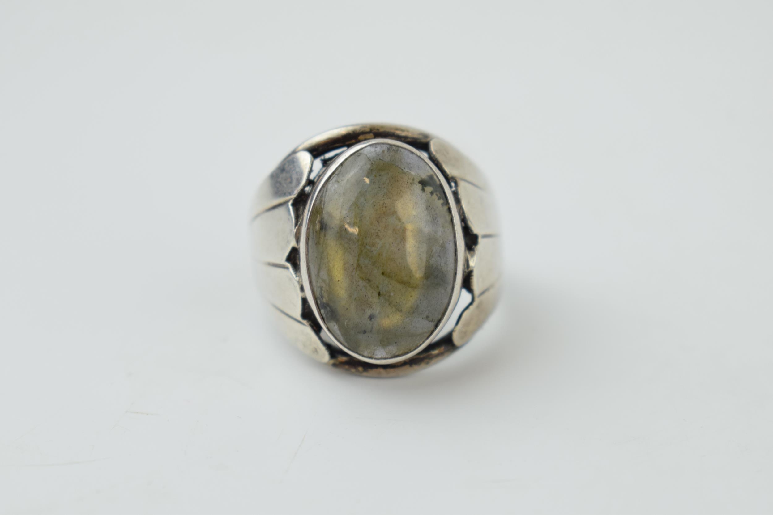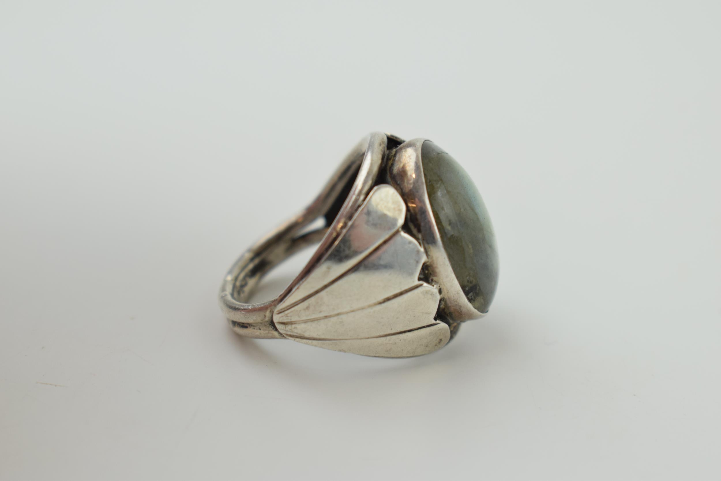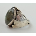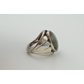 A silver ring with oval moonstone. Ring size R. (Gross weight 10.5 grams).