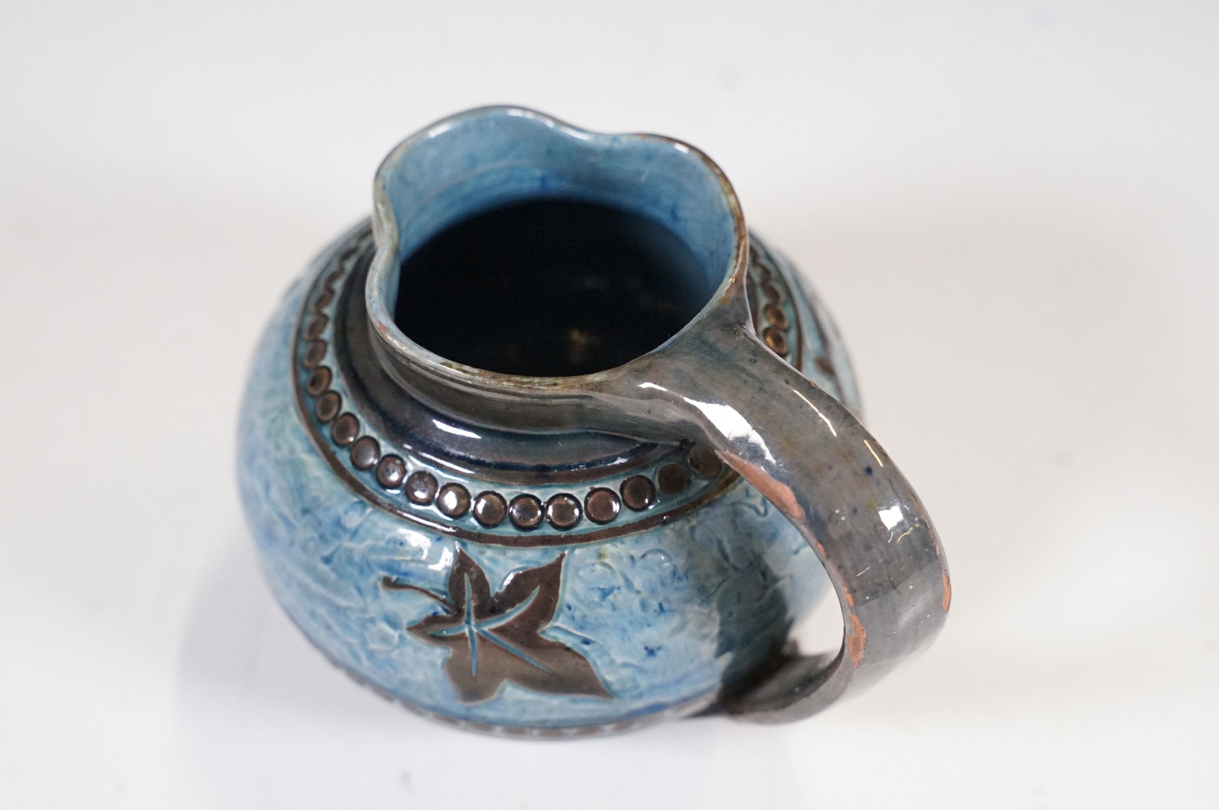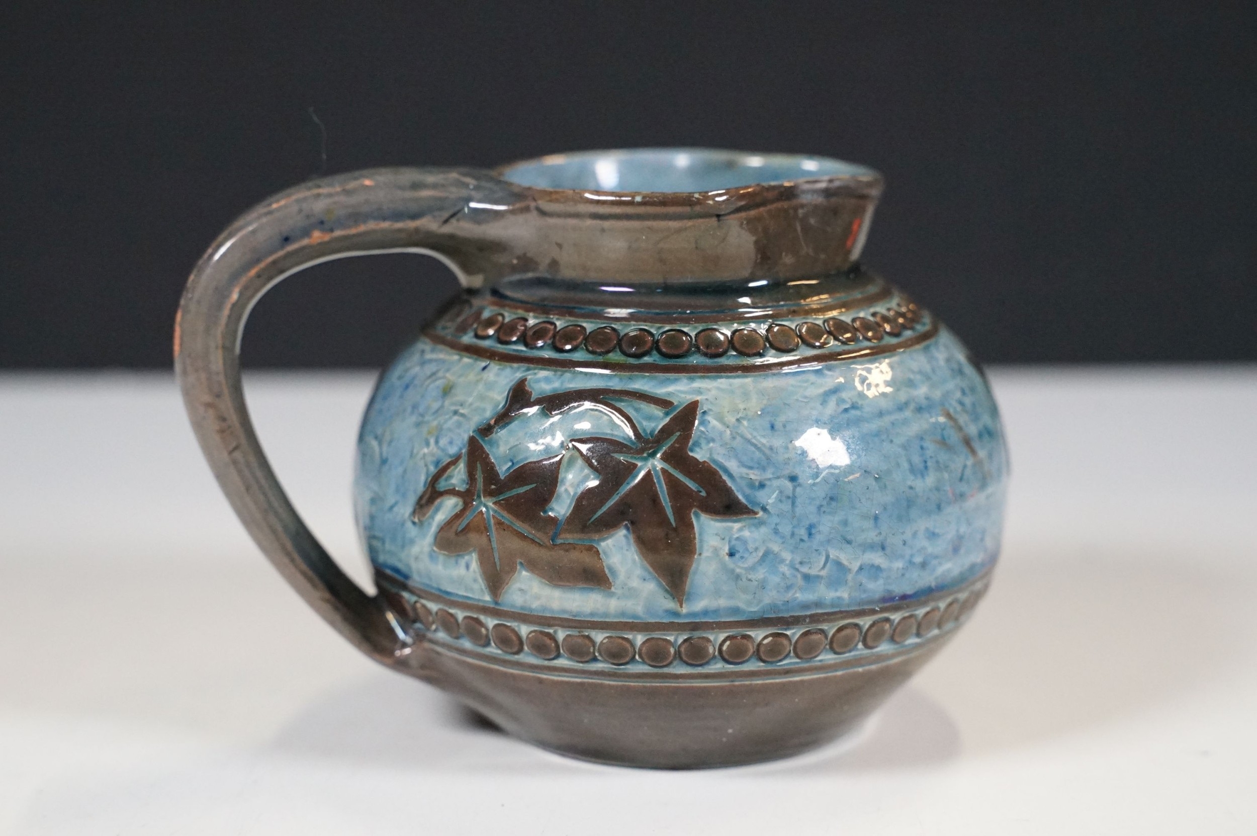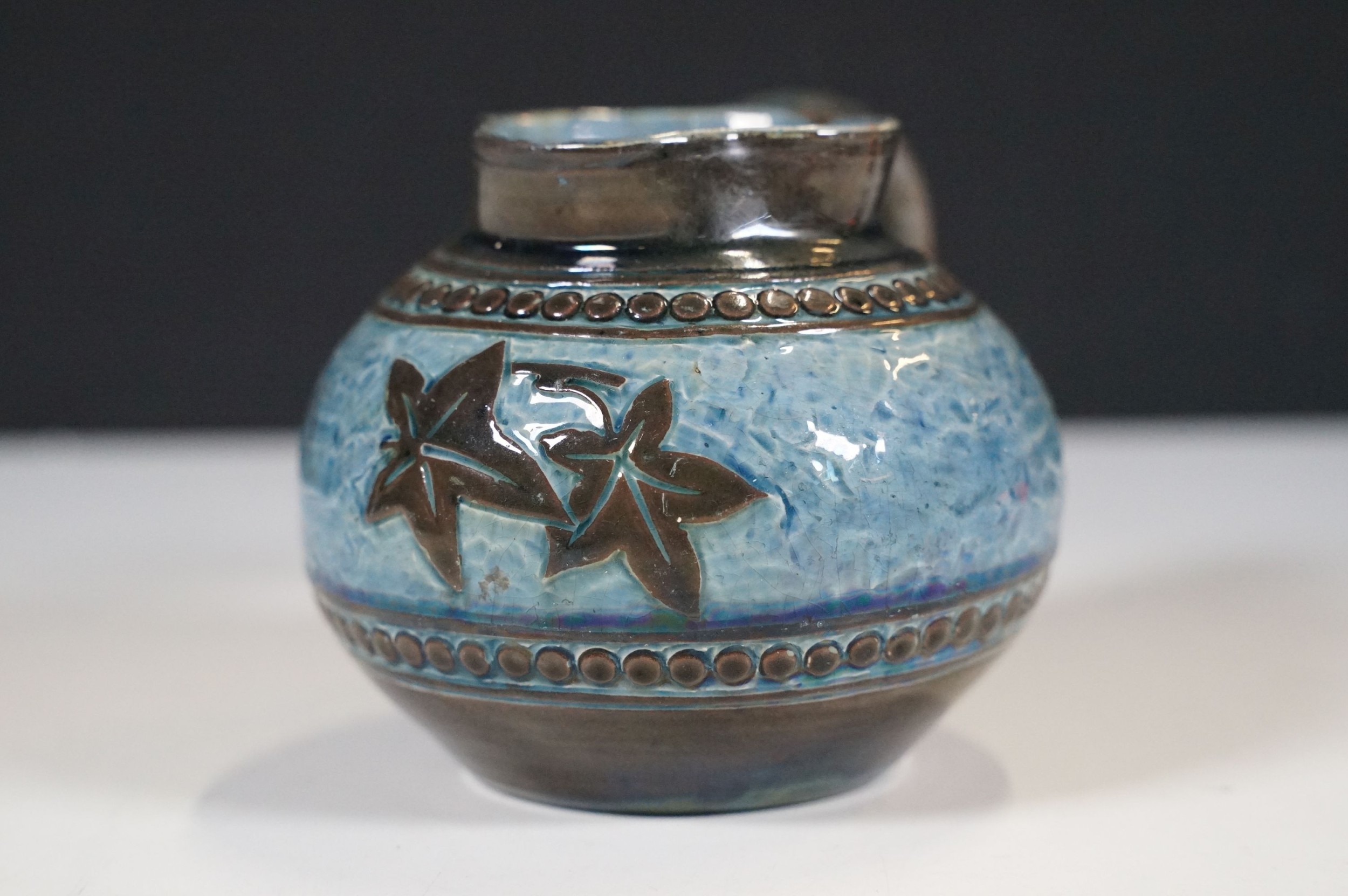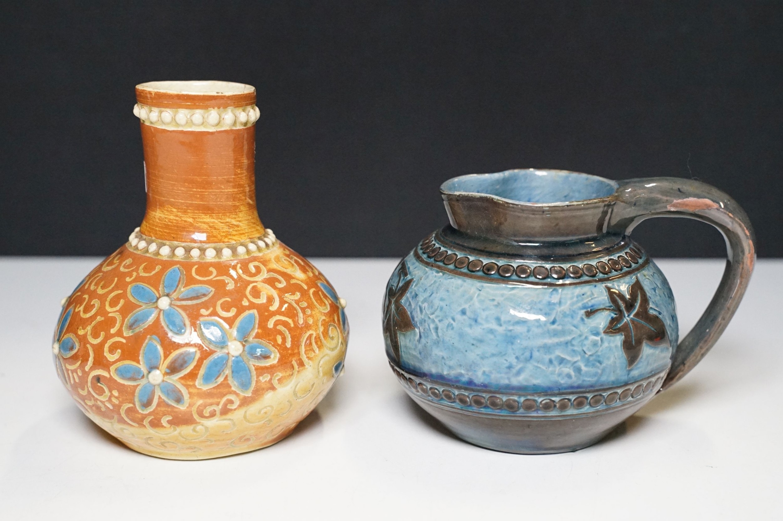 Two 19th Century Brannam pottery pieces - C H Brannam pottery 1885 orange ground and blue flower detail bud vase together with an 1886 jug with ivy leaf decoration and a blue glaze finish (2)
