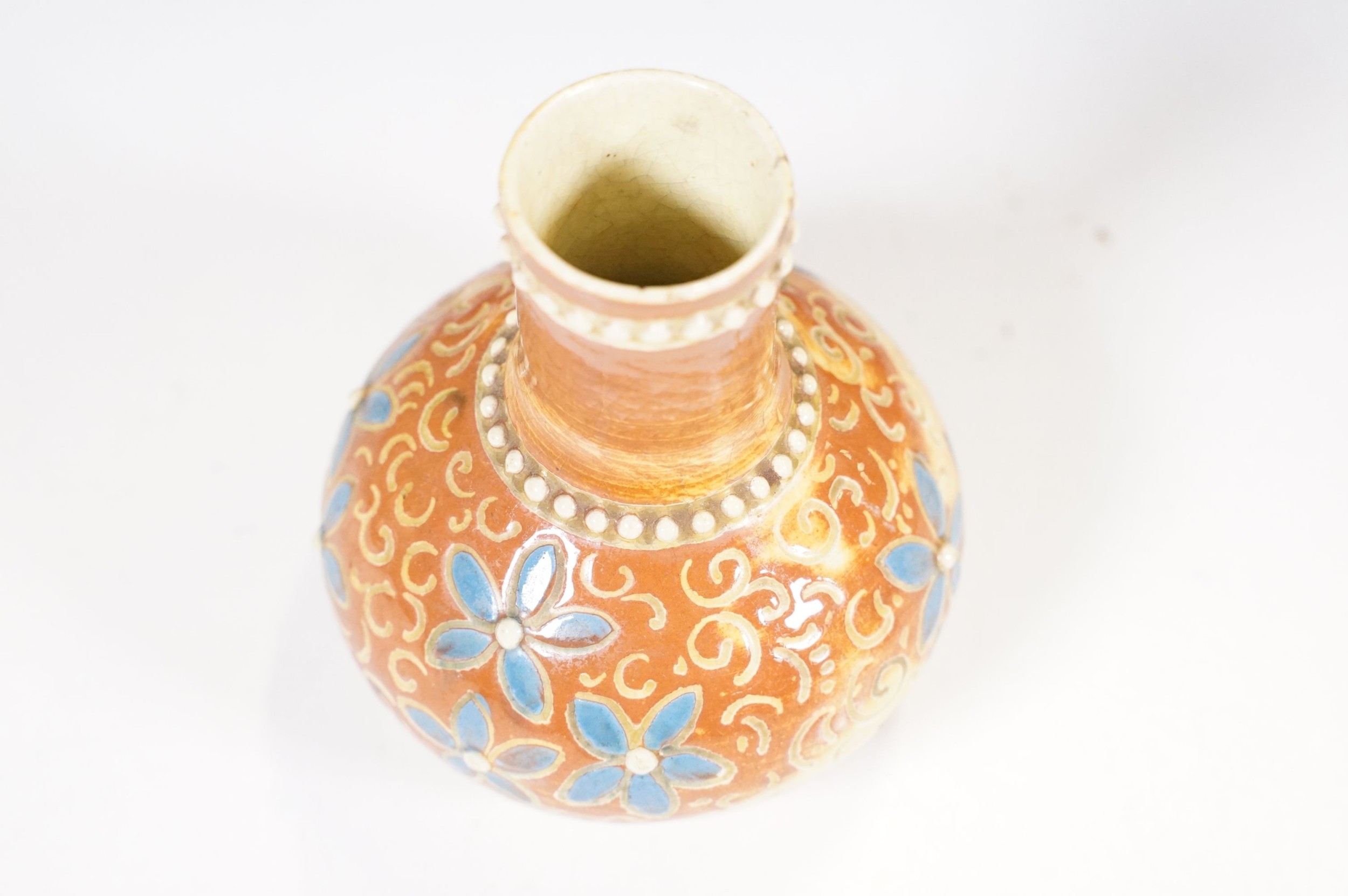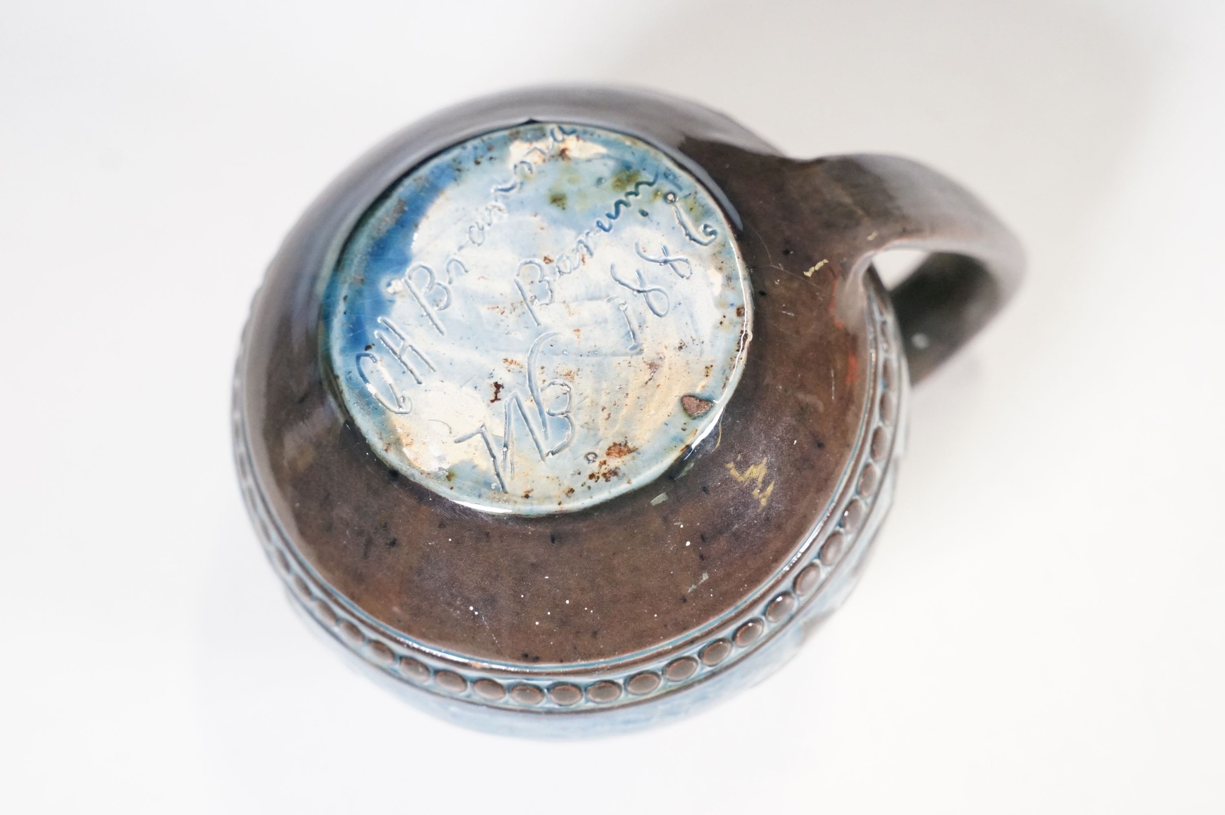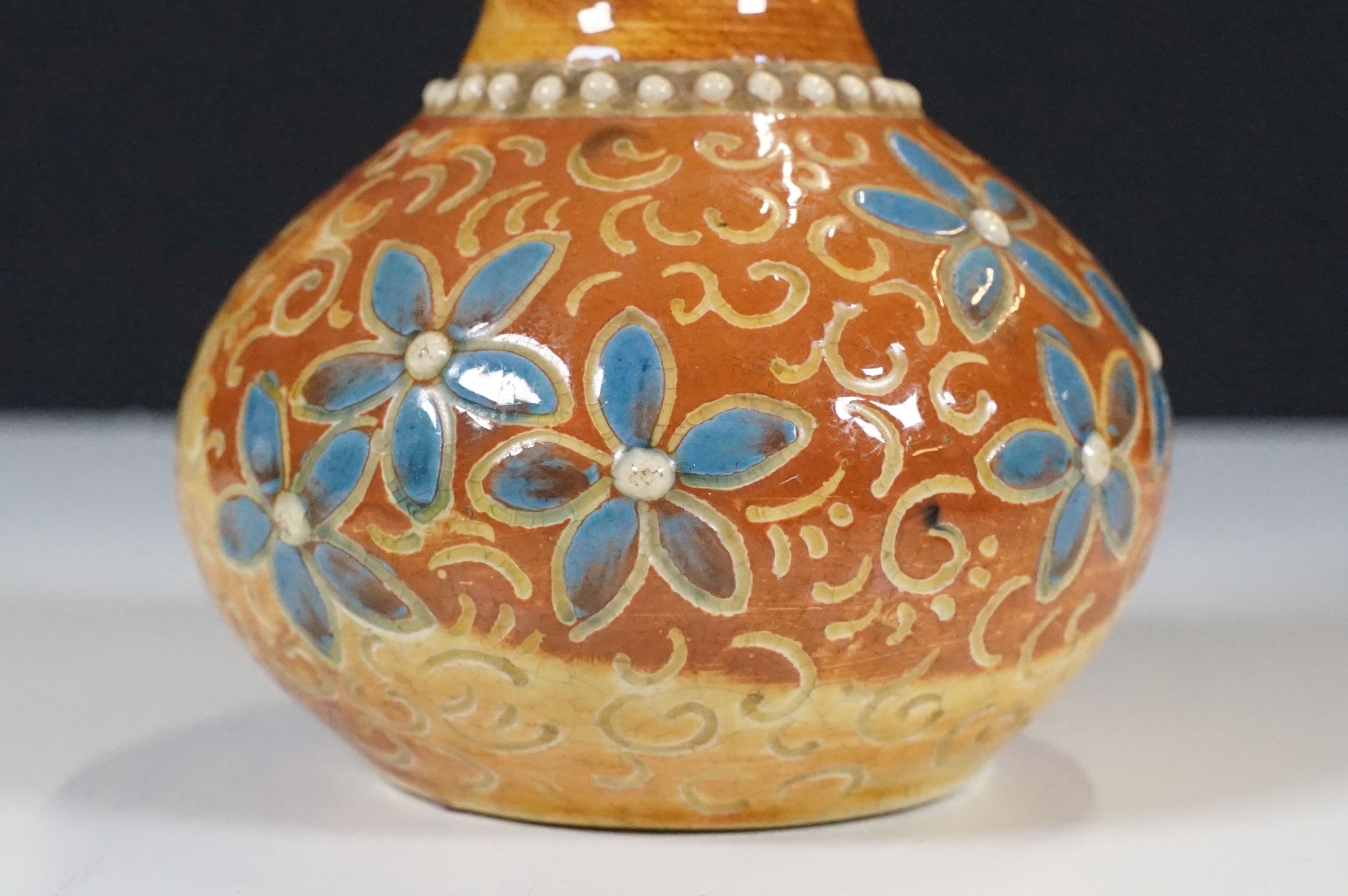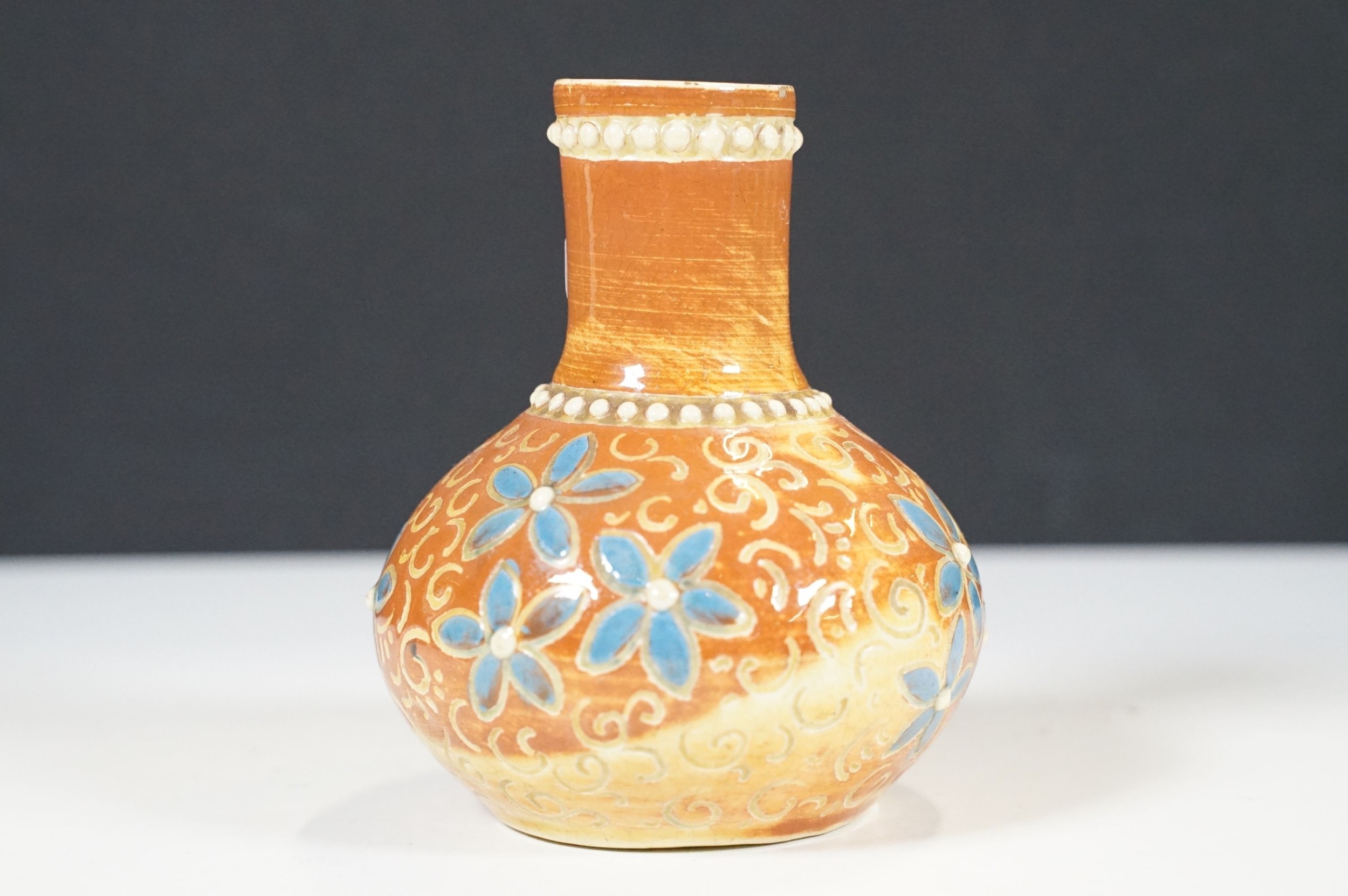 Two 19th Century Brannam pottery pieces - C H Brannam pottery 1885 orange ground and blue flower detail bud vase together with an 1886 jug with ivy leaf decoration and a blue glaze finish (2)