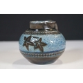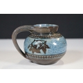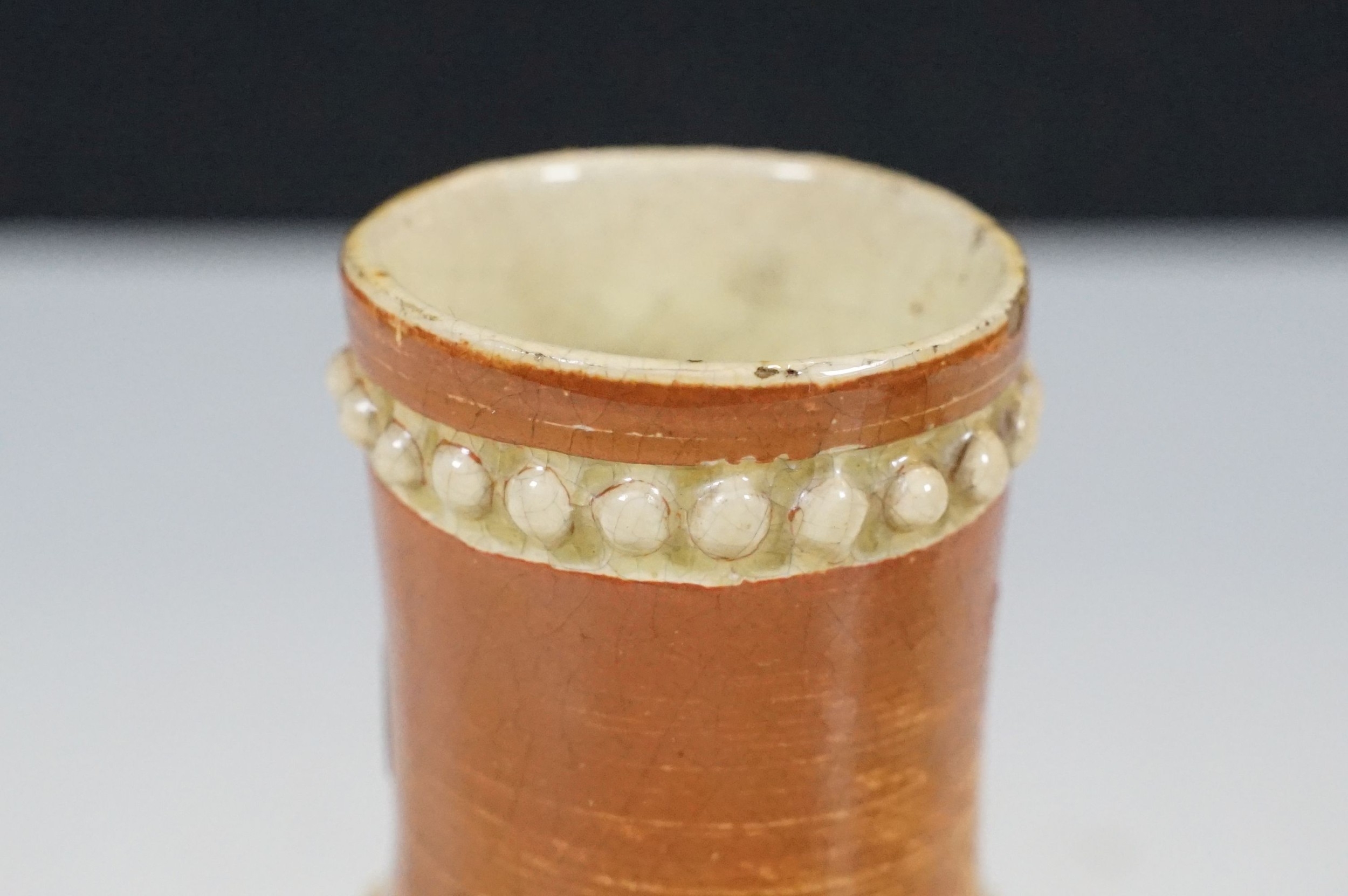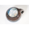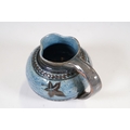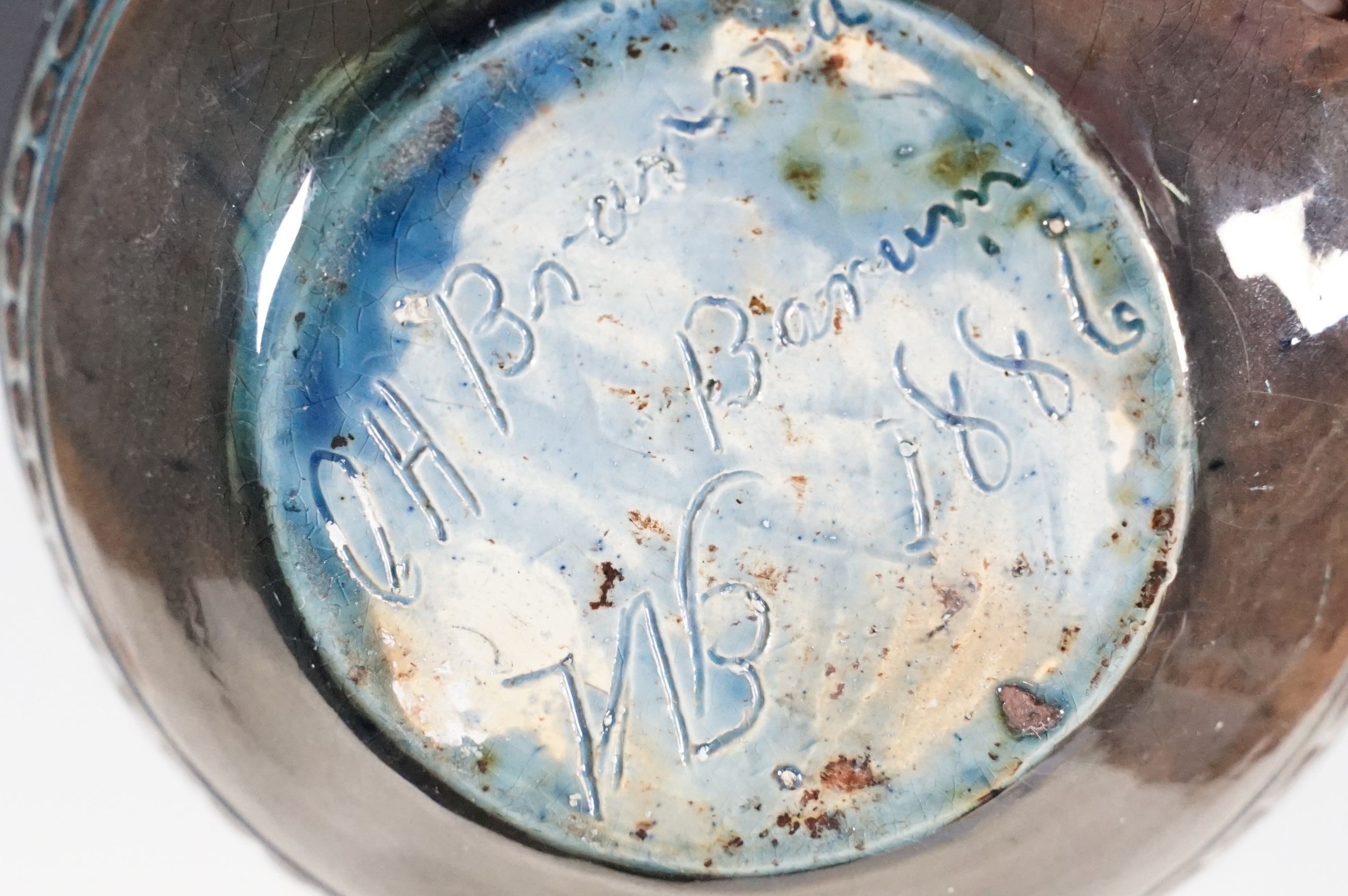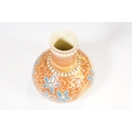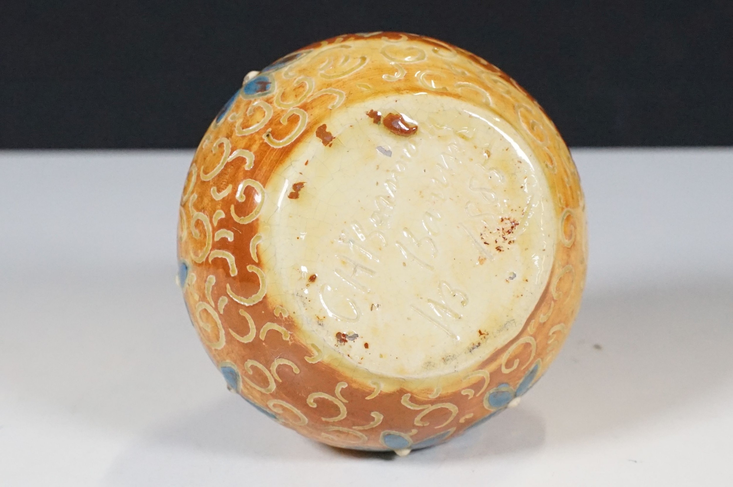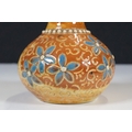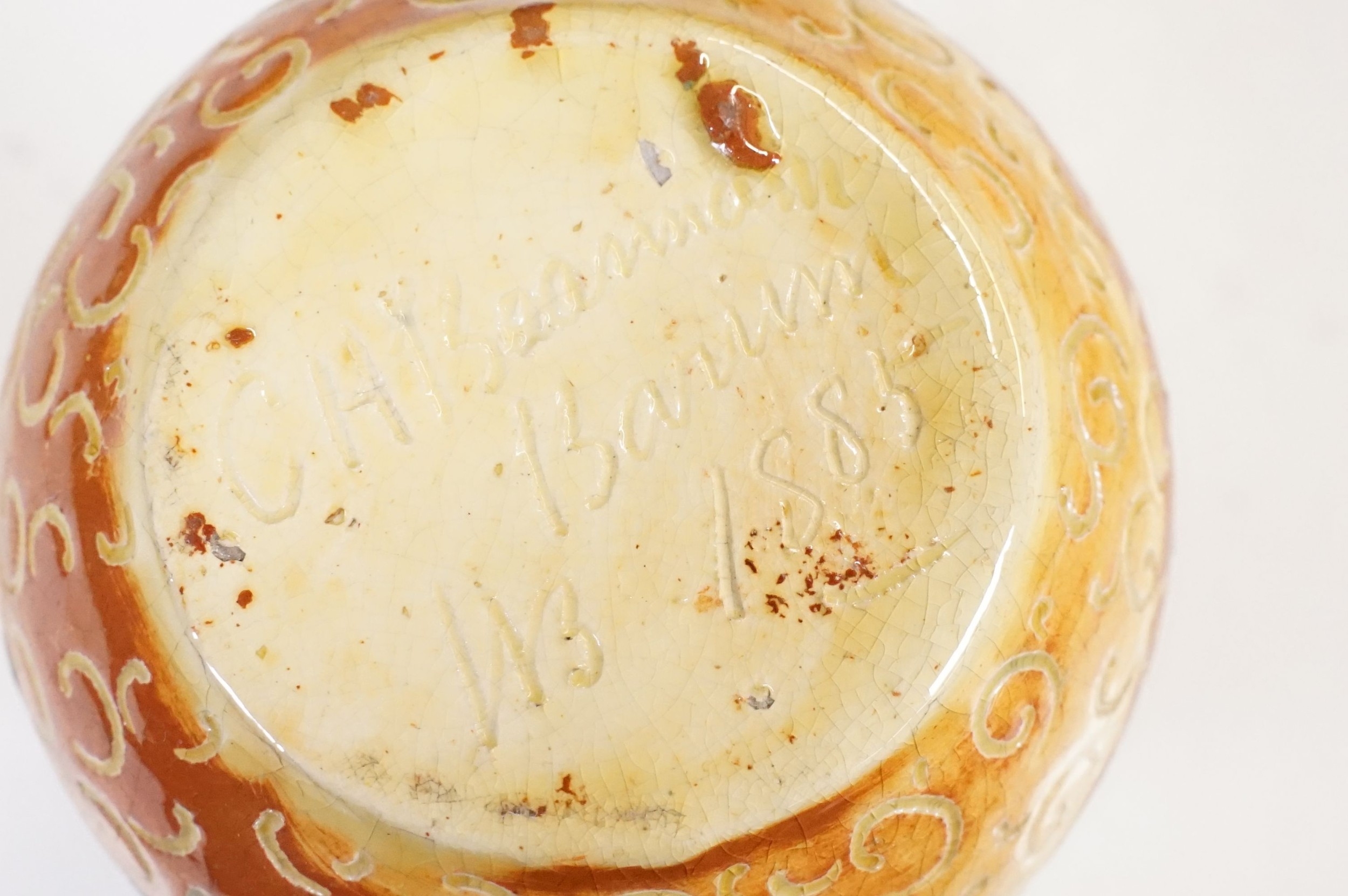 Two 19th Century Brannam pottery pieces - C H Brannam pottery 1885 orange ground and blue flower detail bud vase together with an 1886 jug with ivy leaf decoration and a blue glaze finish (2)