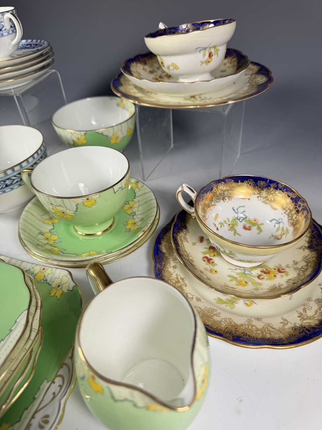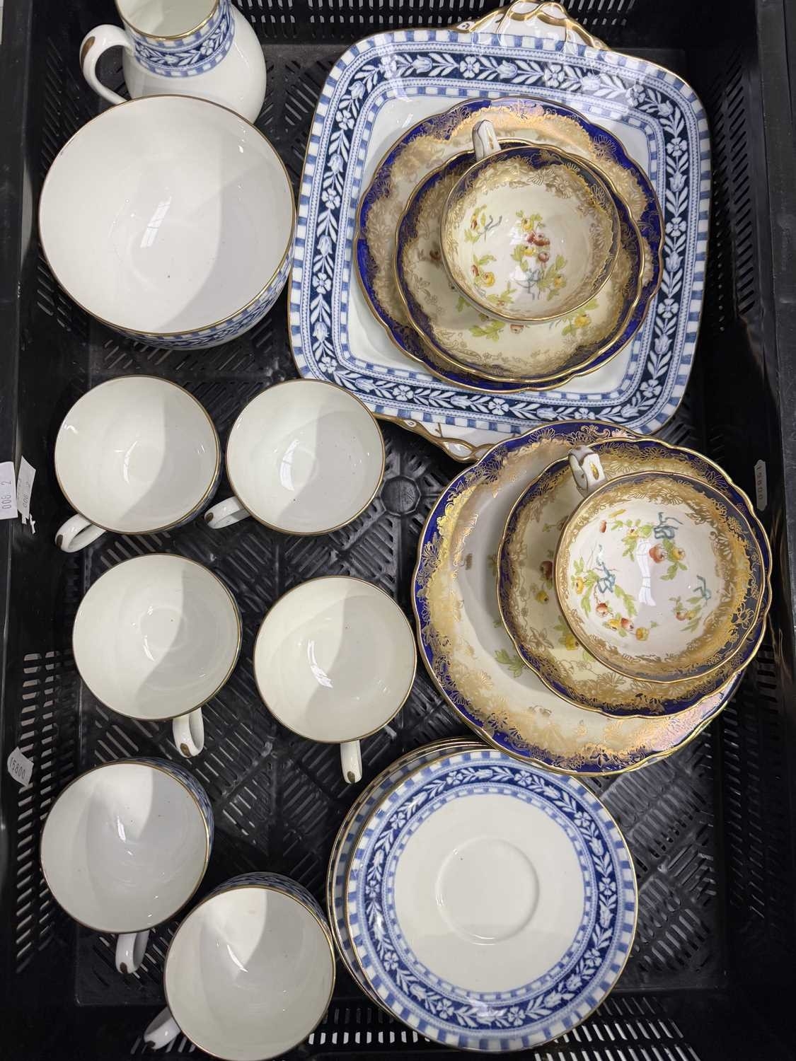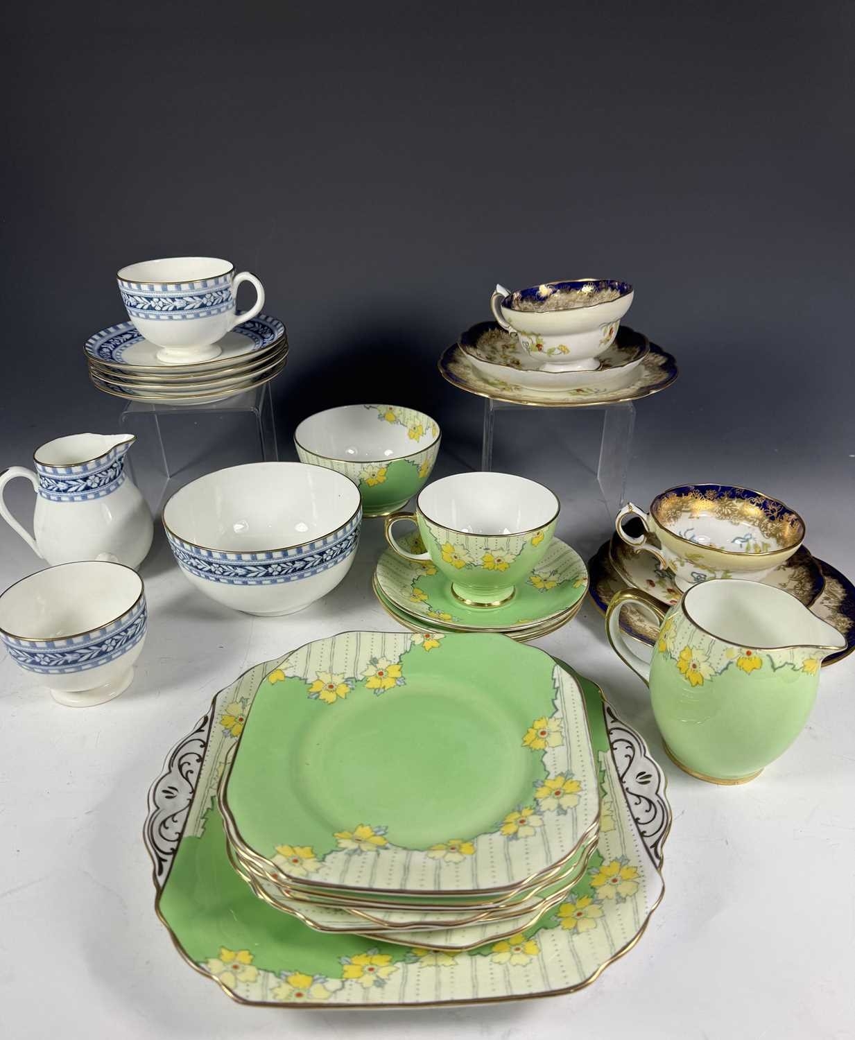 A Wedgwood part tea service, 'Talbot' pattern, with blue printed leafy border, sugar bowl, jug, cups and saucers, tea plates, cake plate, marks to base, together with a Radford's Art Deco, 'Fenton' pattern, green and yellow flowered part tea service and two Hammersley & Co tea trios, pattern no. 13503 (2 trays)