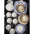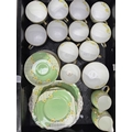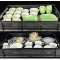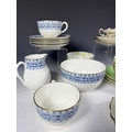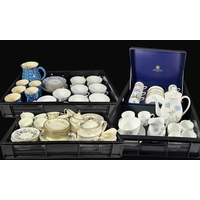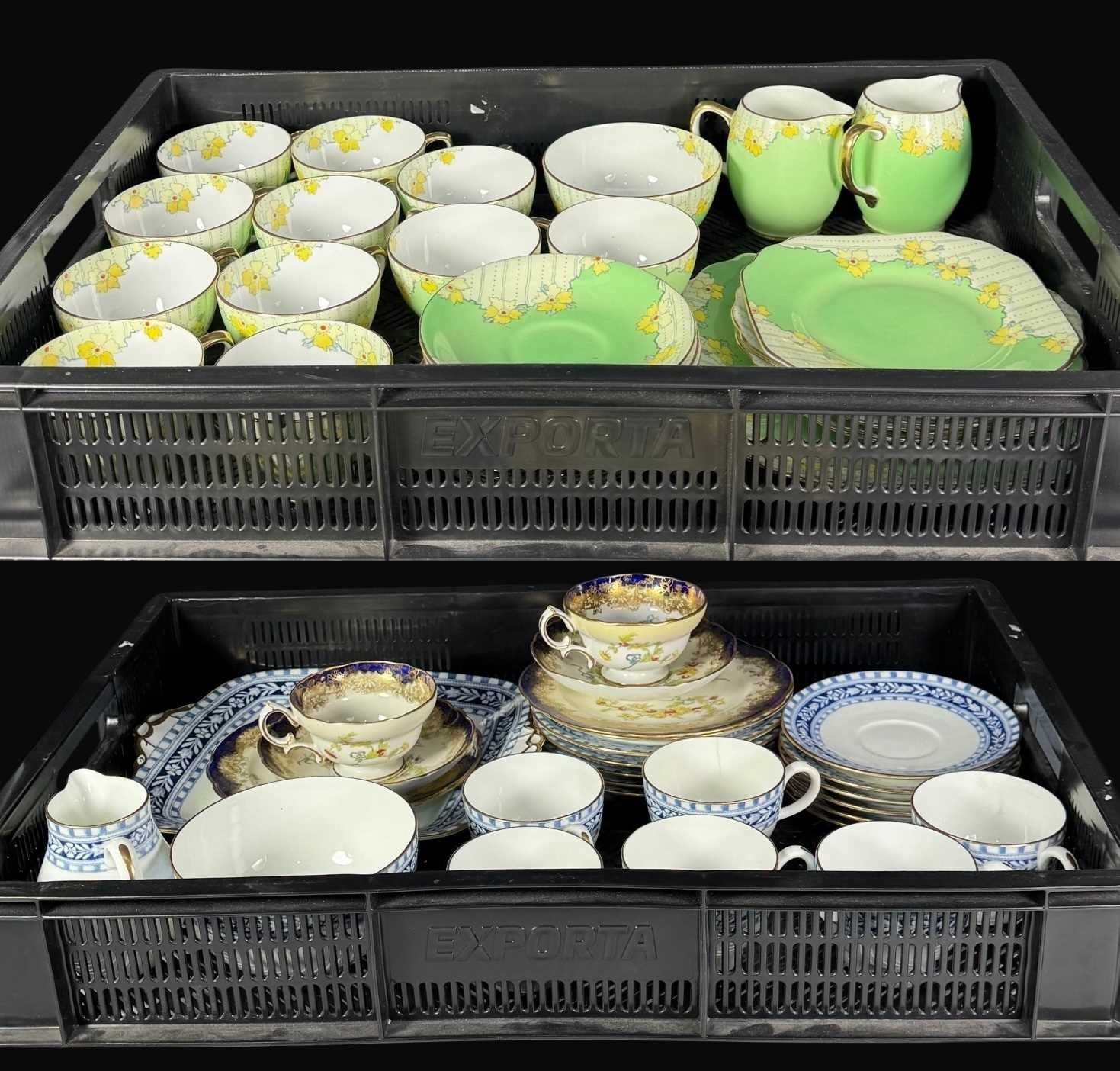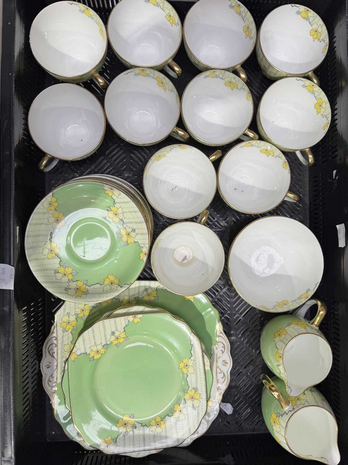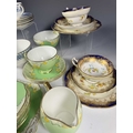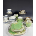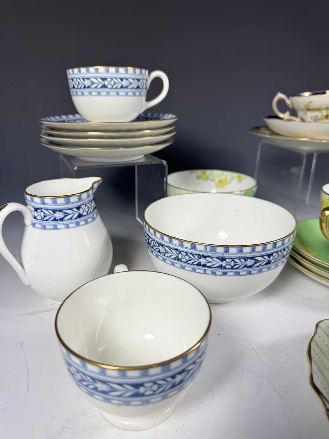 A Wedgwood part tea service, 'Talbot' pattern, with blue printed leafy border, sugar bowl, jug, cups and saucers, tea plates, cake plate, marks to base, together with a Radford's Art Deco, 'Fenton' pattern, green and yellow flowered part tea service and two Hammersley & Co tea trios, pattern no. 13503 (2 trays)