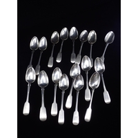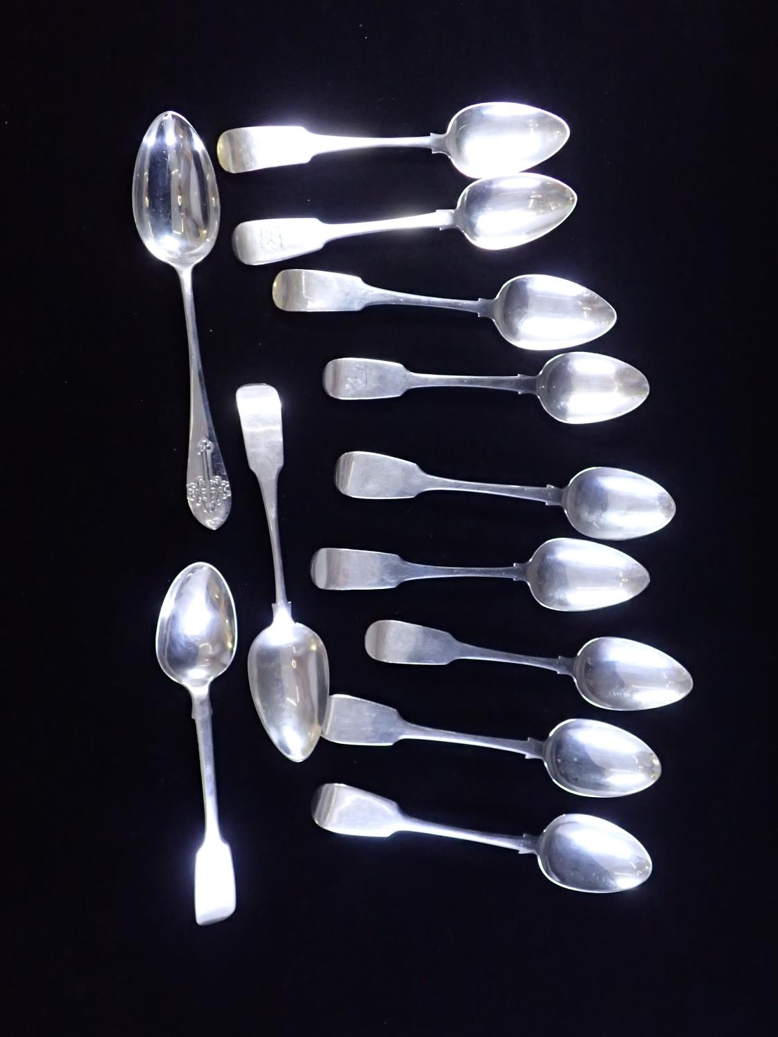 A collection of silver dessert spoons, total weight approx. 336 grams (15 Irish, 2 English)