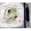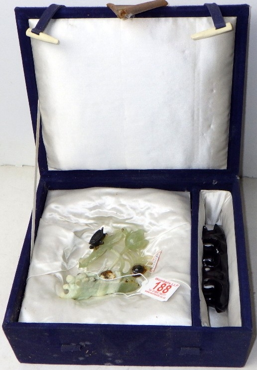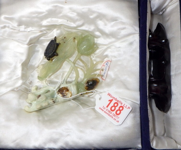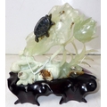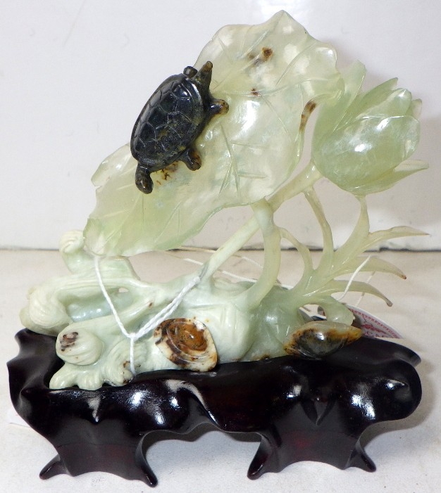 A circa 1960s / 1970s Chinese jade carving depicting a turtle on foliage, presented on a wooden stand