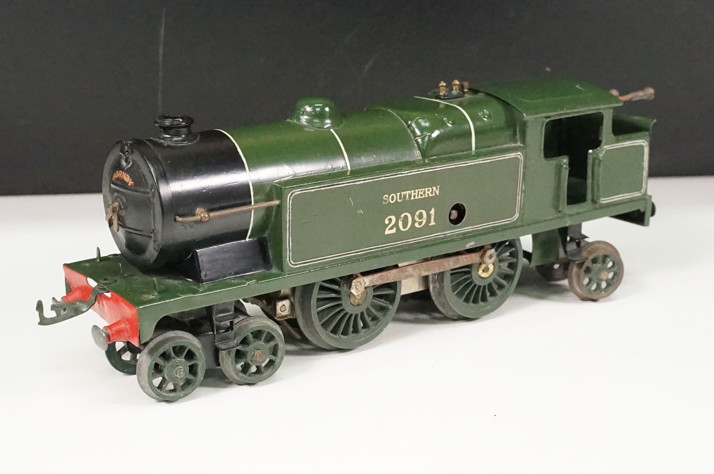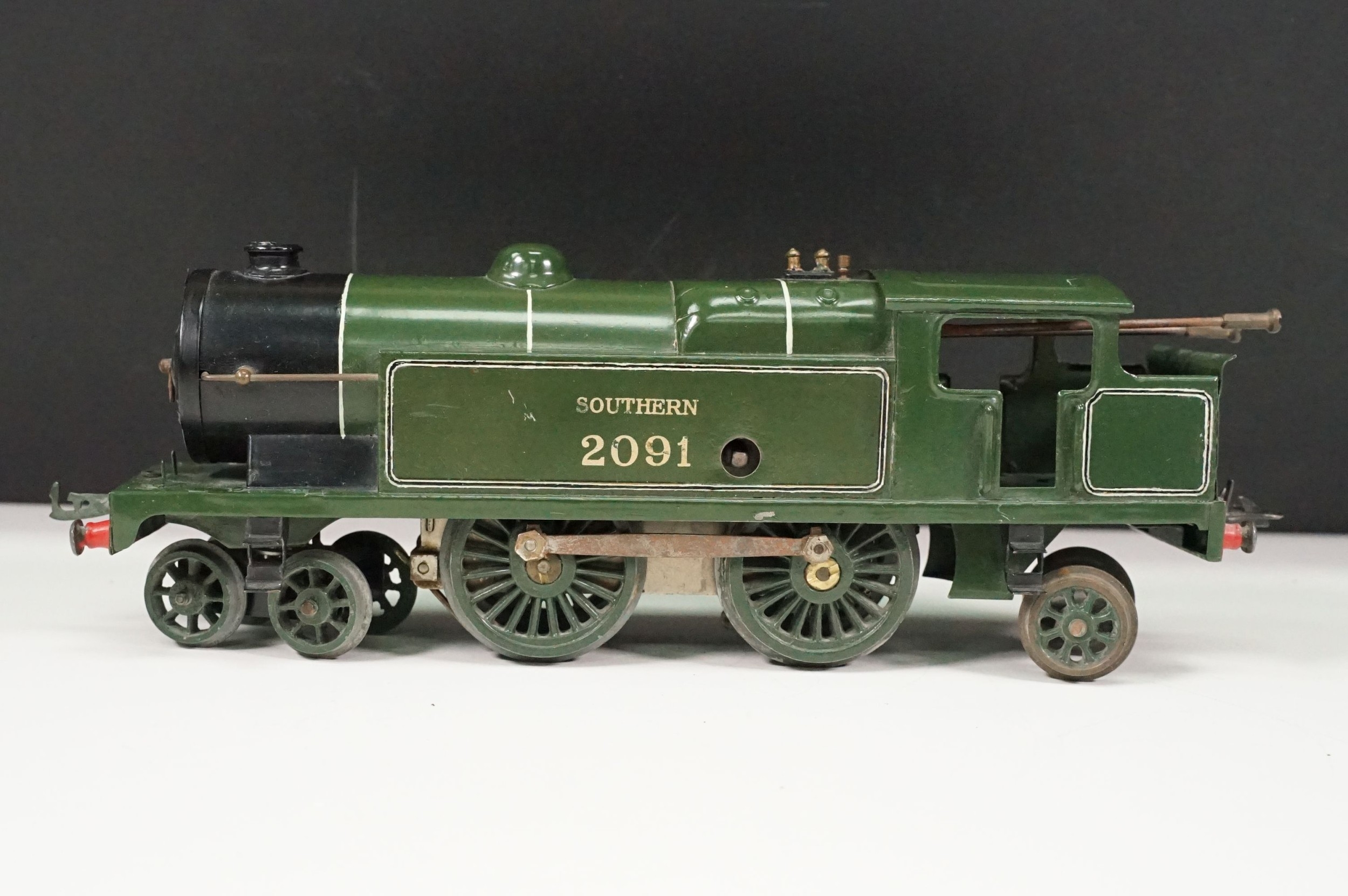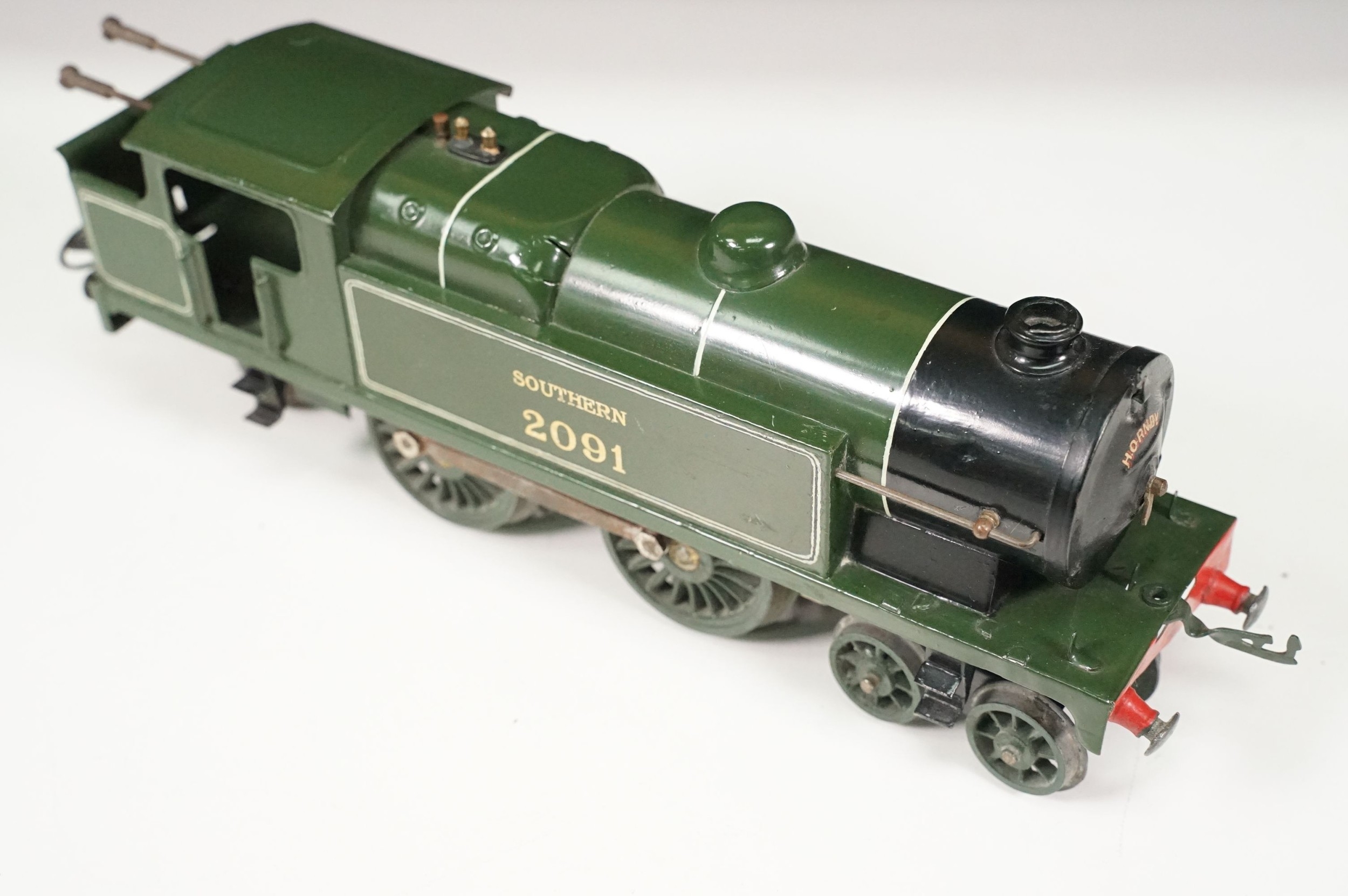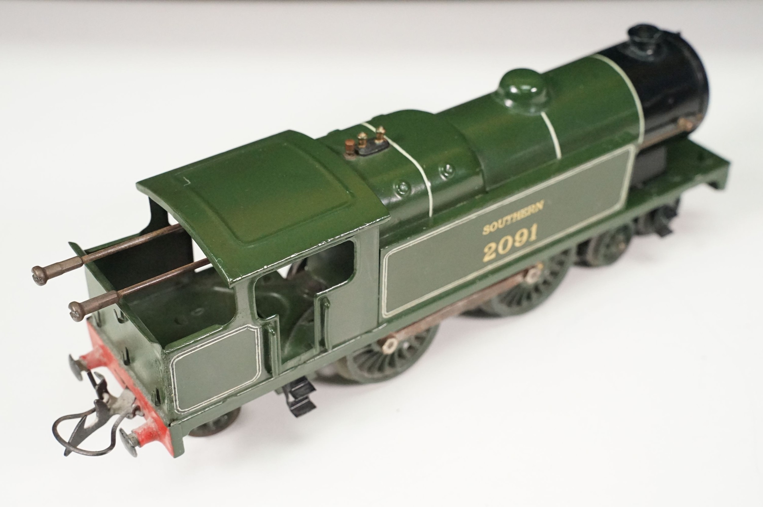 Hornby O gauge clockwork Southern 2091 4-4-2 locomotive in green, gd overall condition with some paint wear