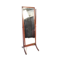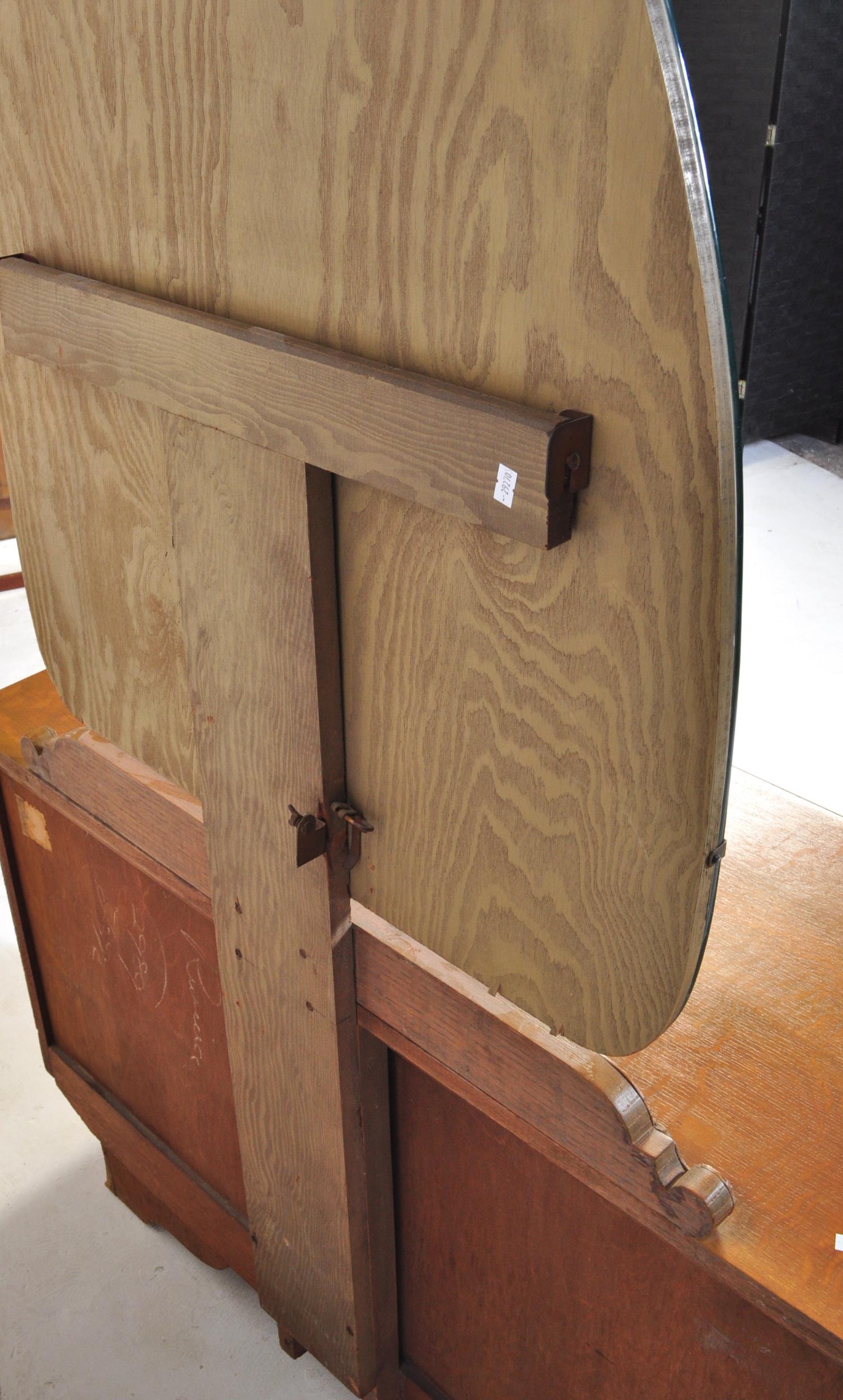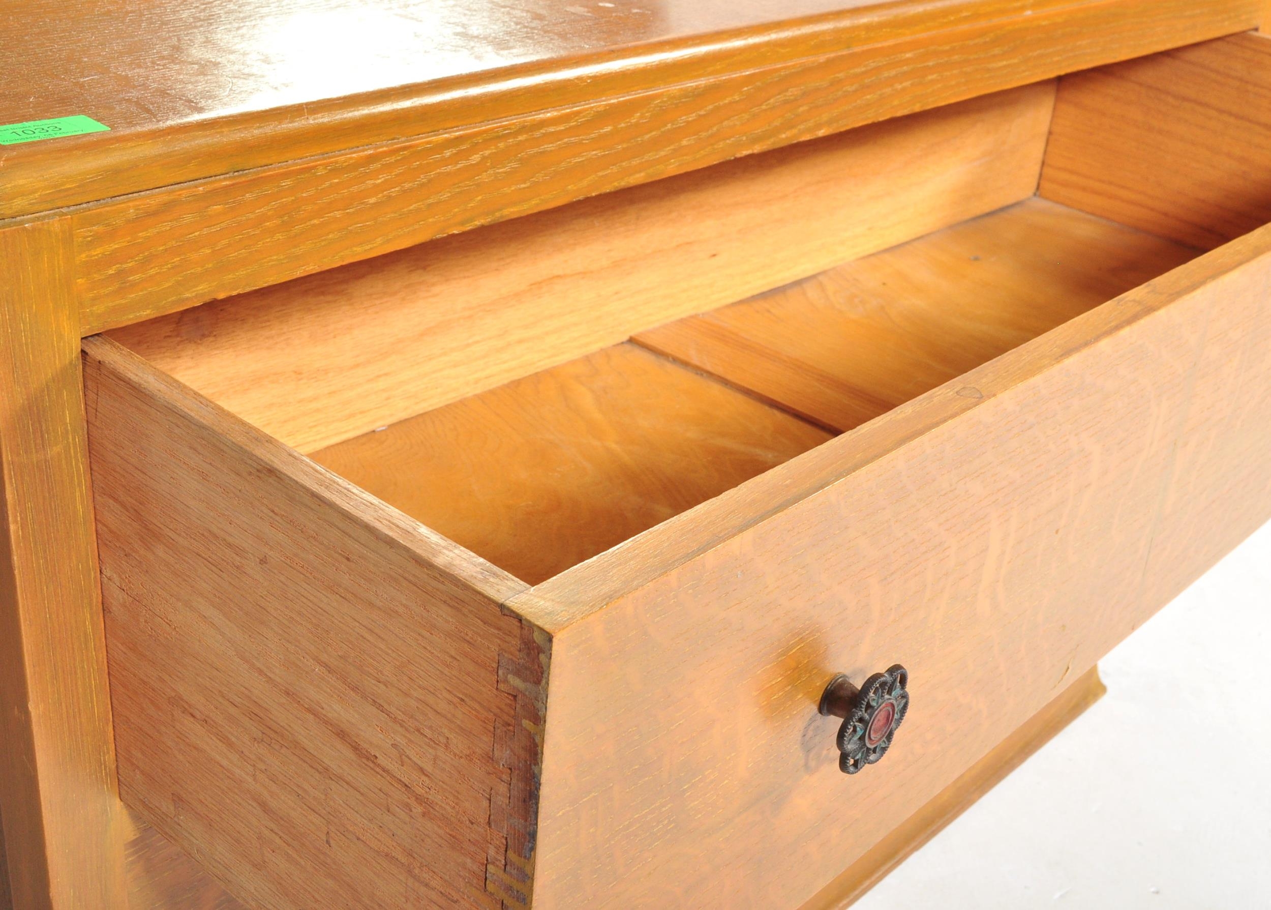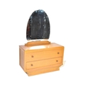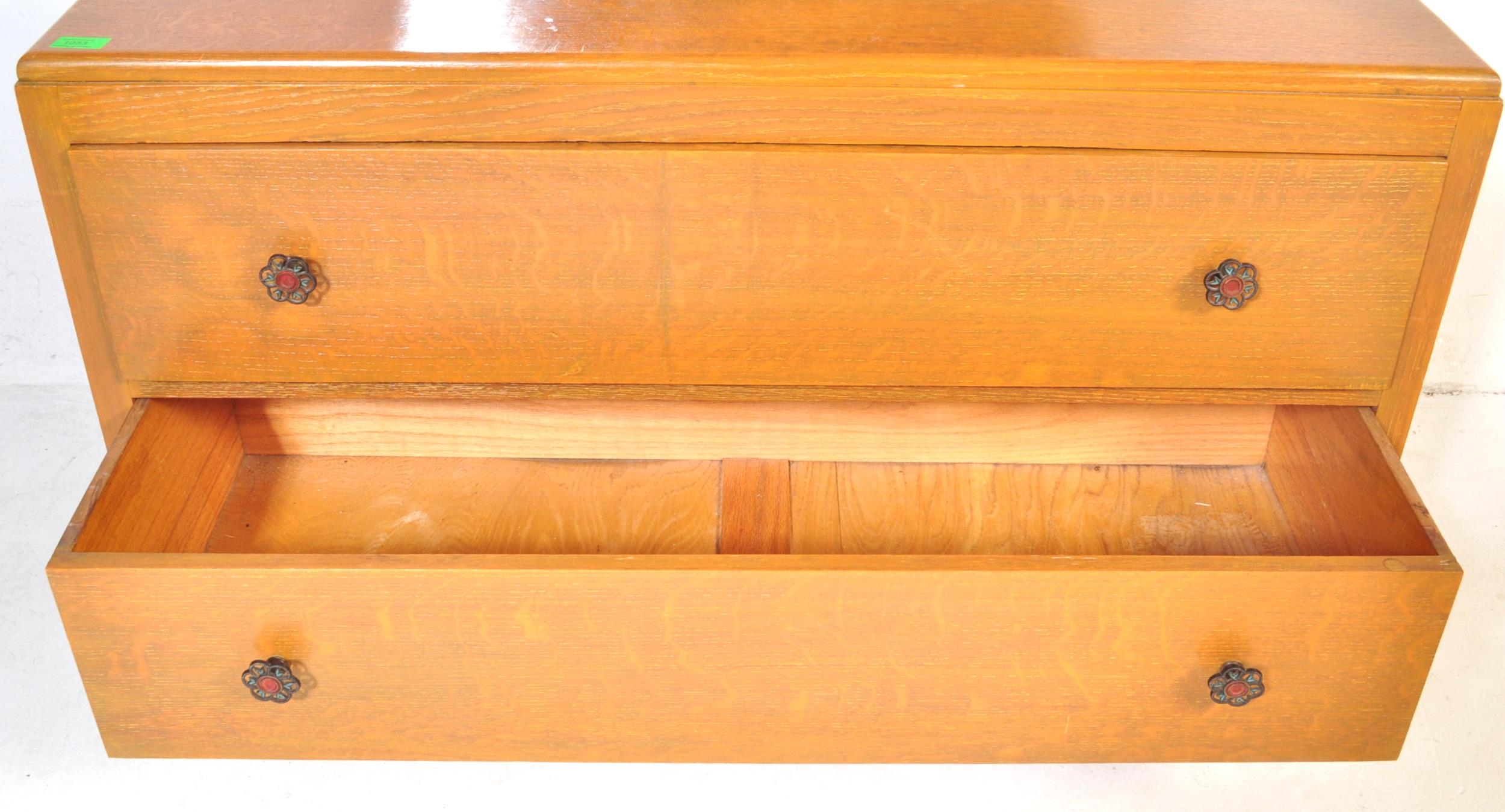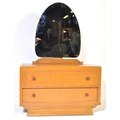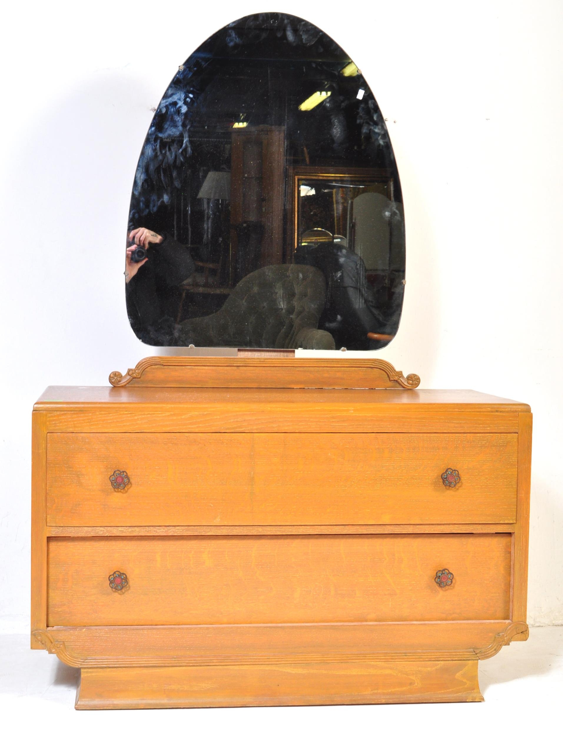 A vintage 20th Century Art Deco oak dressing chest of drawers with shaped mirror. Rectangular form with scrolled gallery back with a bank of two full length drawers with floral metal pulls on a smaller plinth base. Measures approx.