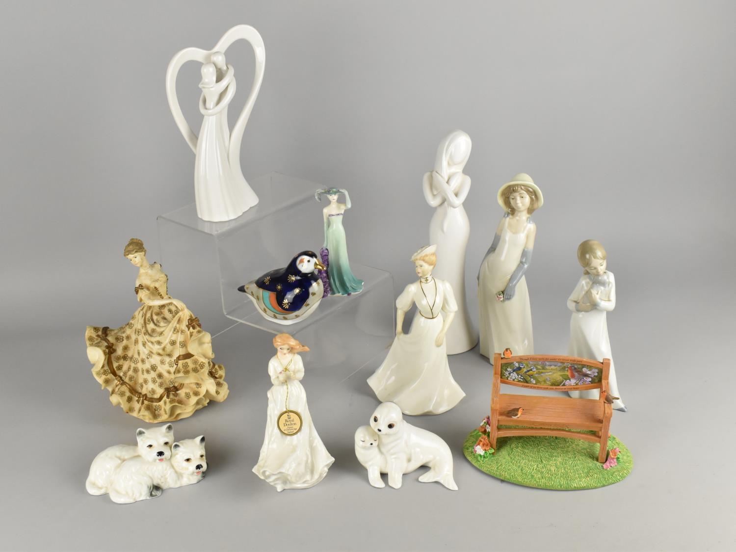 A Collection of Various Ceramic and Resin Ornaments to Comprise Nao Girl, Royal Doulton 'Thank You', Dog and Seal Groups, Bradford 'Until We Meet Again' Remembrance Bench Ornament