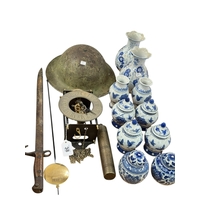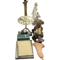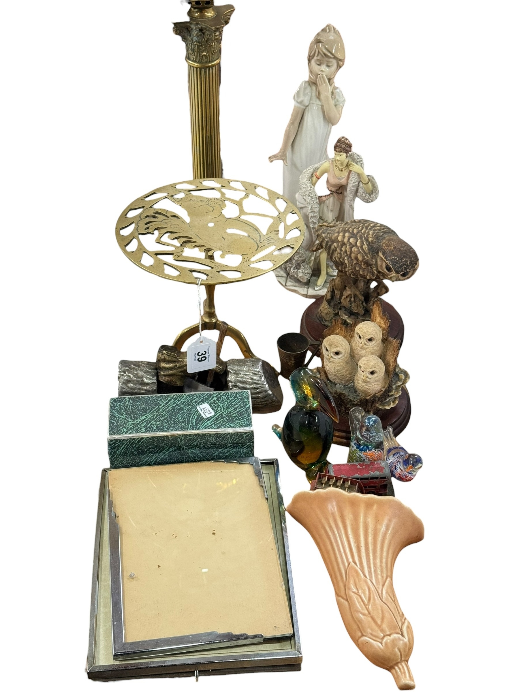 Corinthian column brass oil lamp, brass trivet, two Border Fine Arts Owls, pottery wall pocket, etc.