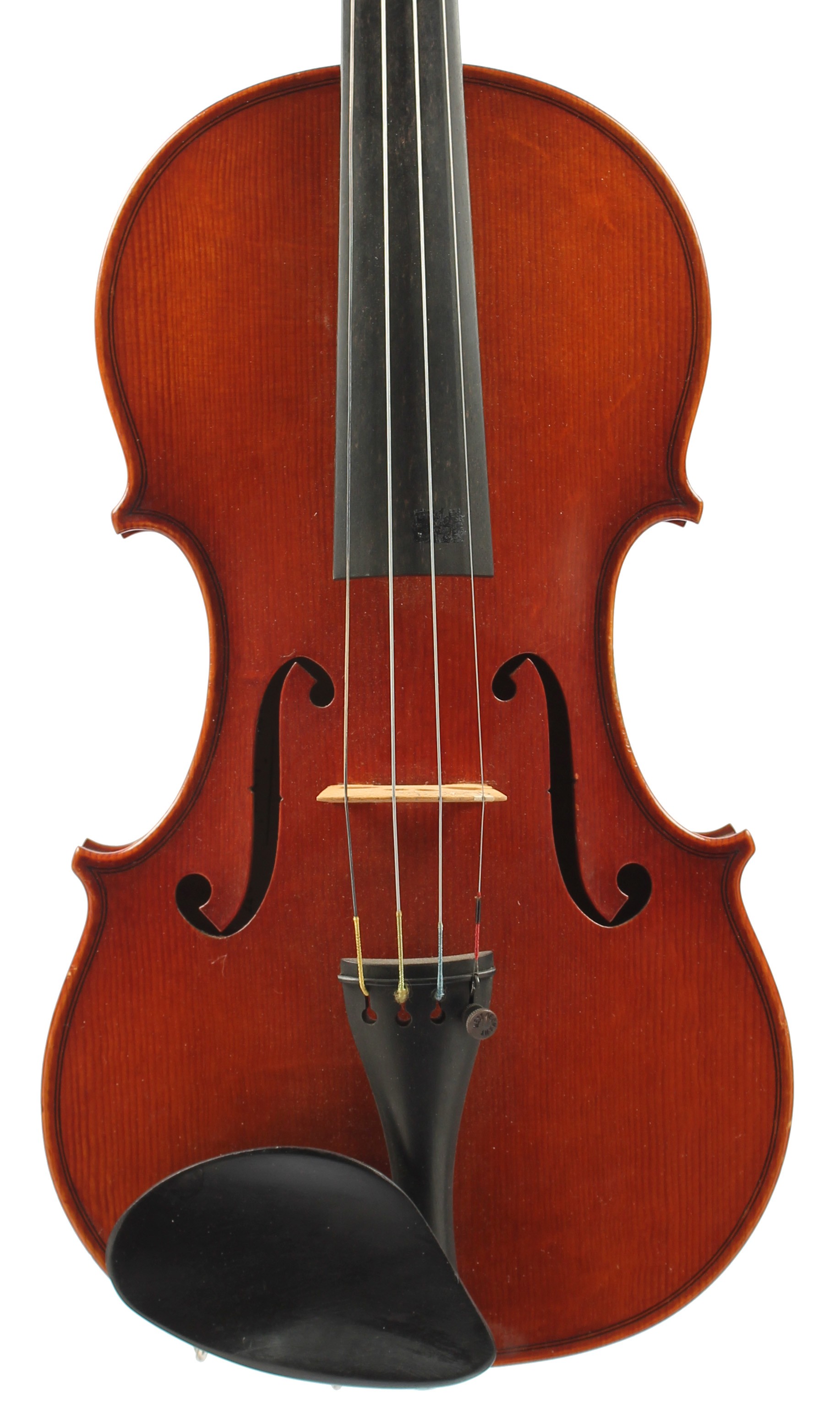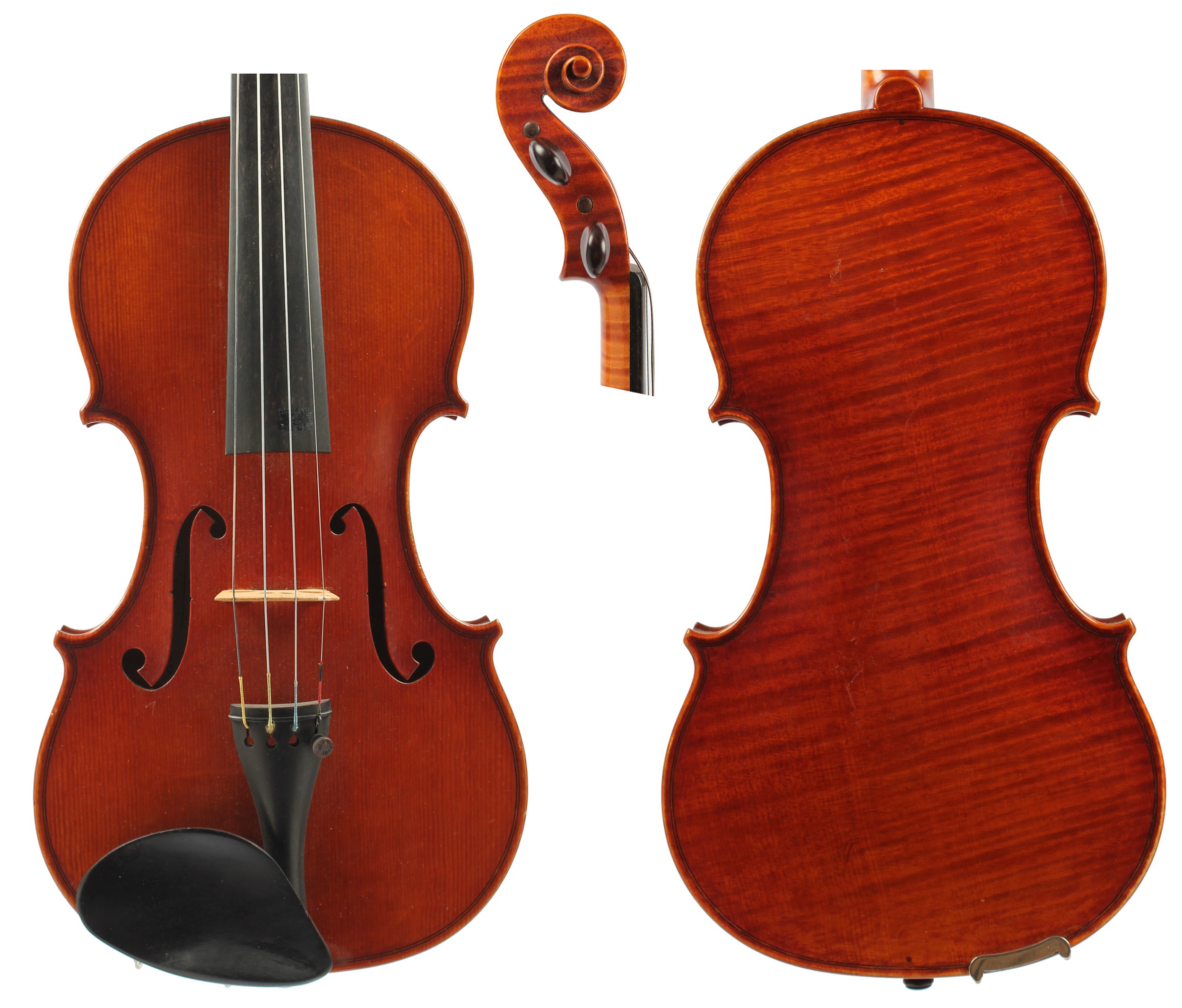 Modern English violin by and labelled Glen A. Collins, Luthier, Newark 1977, bearing the name 'Jubilee' inscribed on the label, the one piece back of medium/broad curl with similar wood to the sides and head, the table of a medium width grain and the varnish of a light reddish-brown colour on a golden ground, 13 7/8", 35.20cm