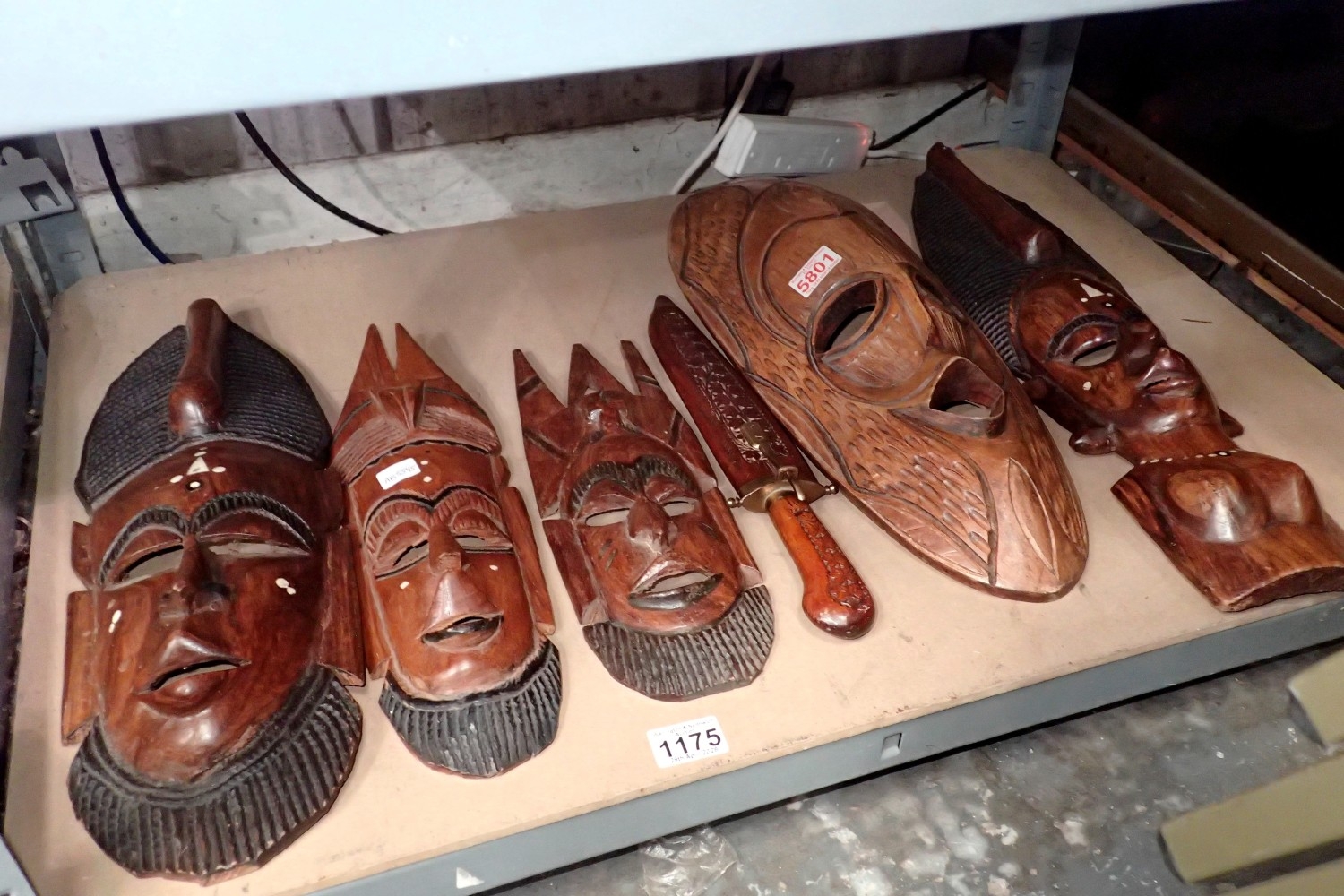Five African wall masks and a wooden Indian style knife. Not available for in-house P&P