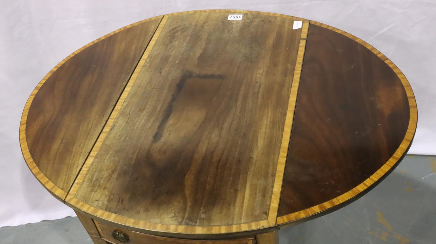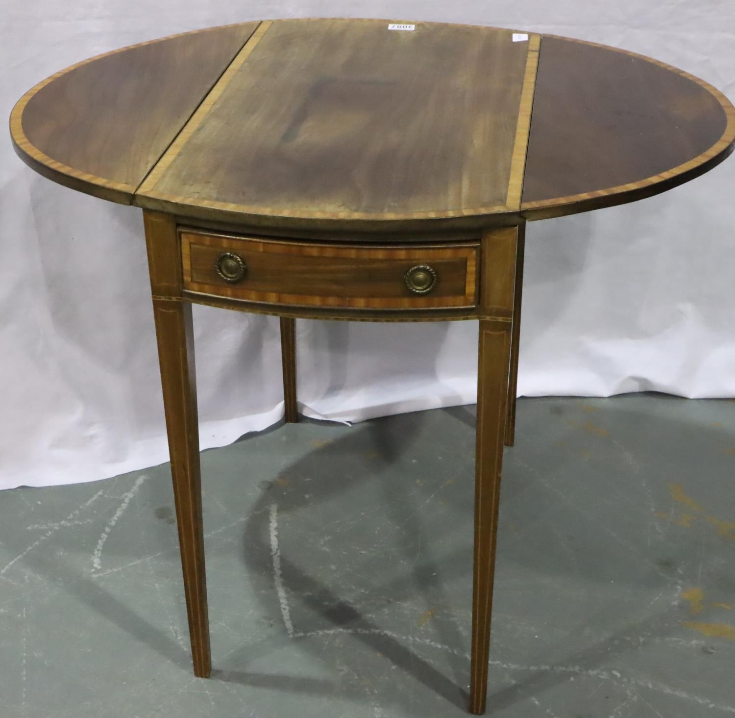 Edwardian inlaid walnut drop leaf tea table, having a single drawer and raised on tapering supports, 94 x 74 x 71 cm. Not available for in-house P&P, contact Paul O'Hea at Mailboxes on 01925 659133