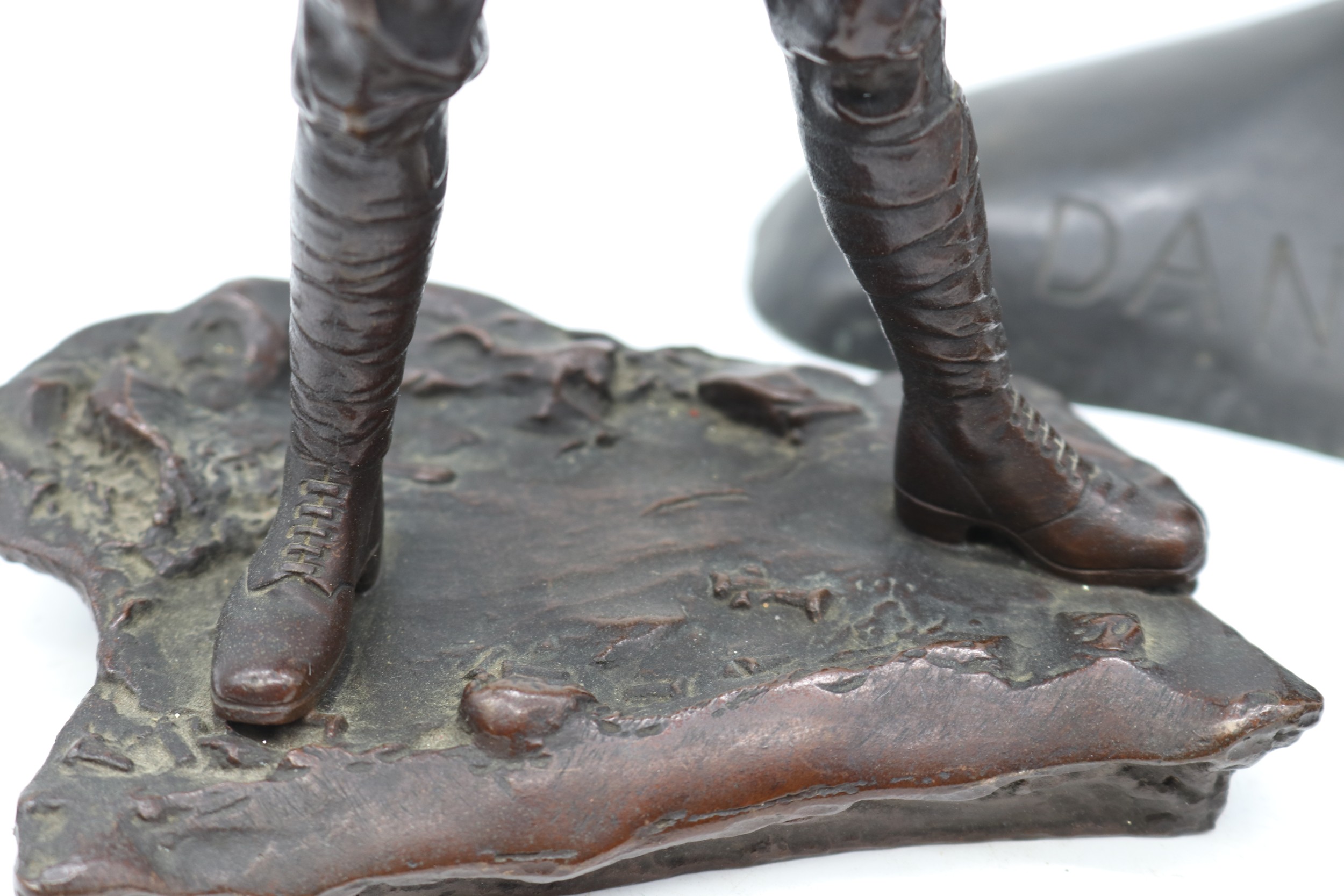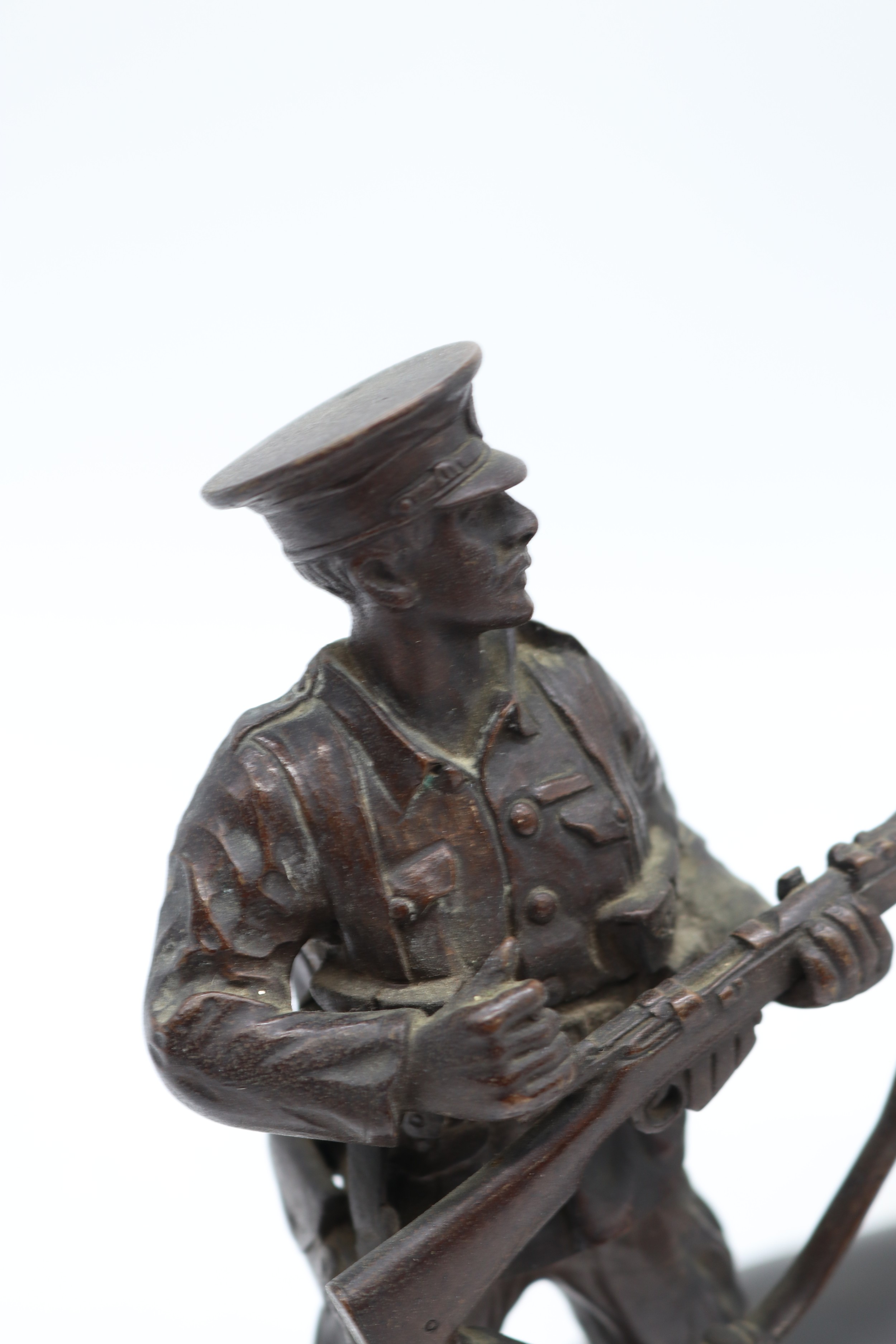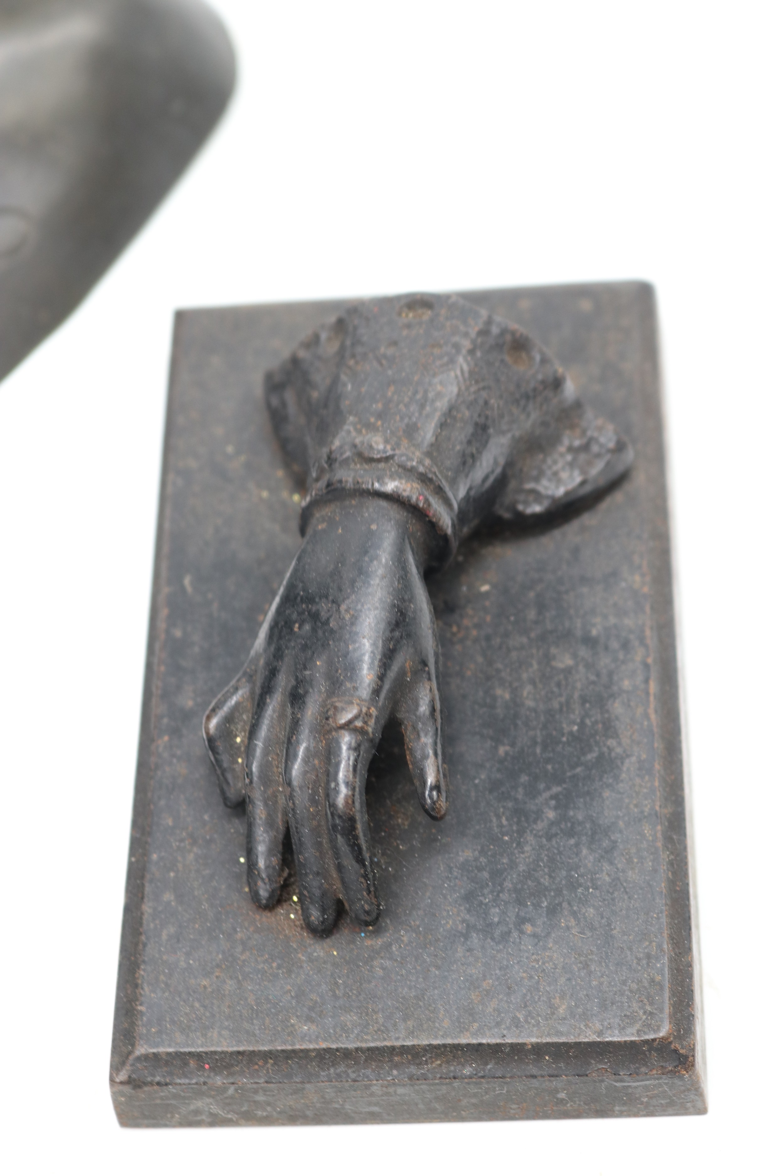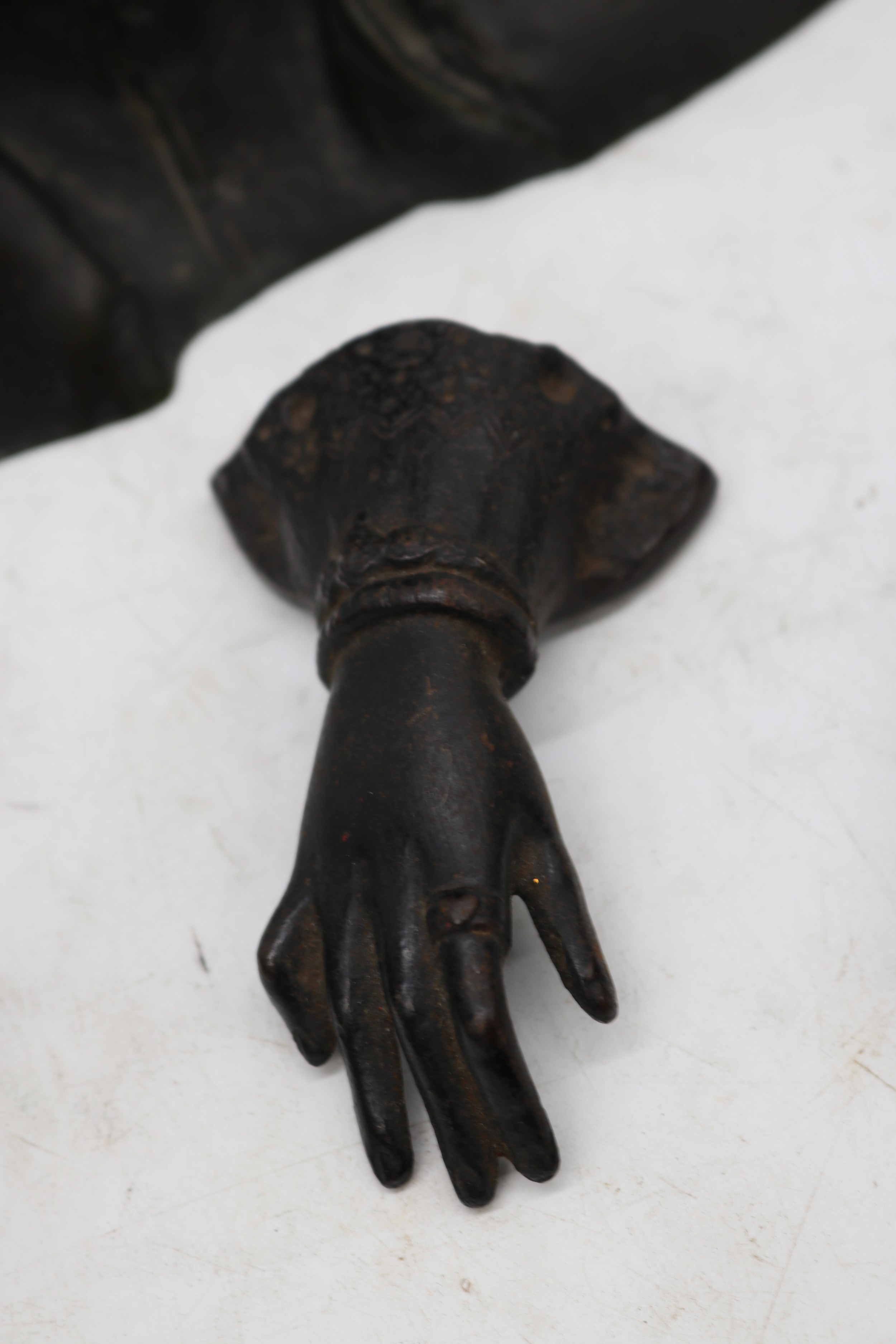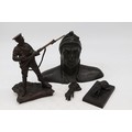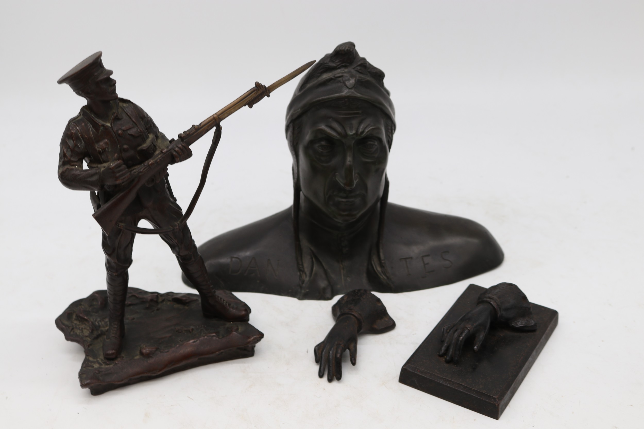 Bronzes, cast bronze First World War soldier, hollow bronze 'dantes' bust, and bronze hand on on plinth and bronze hand (4)