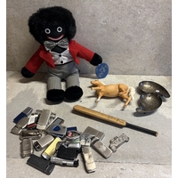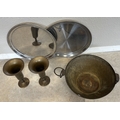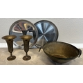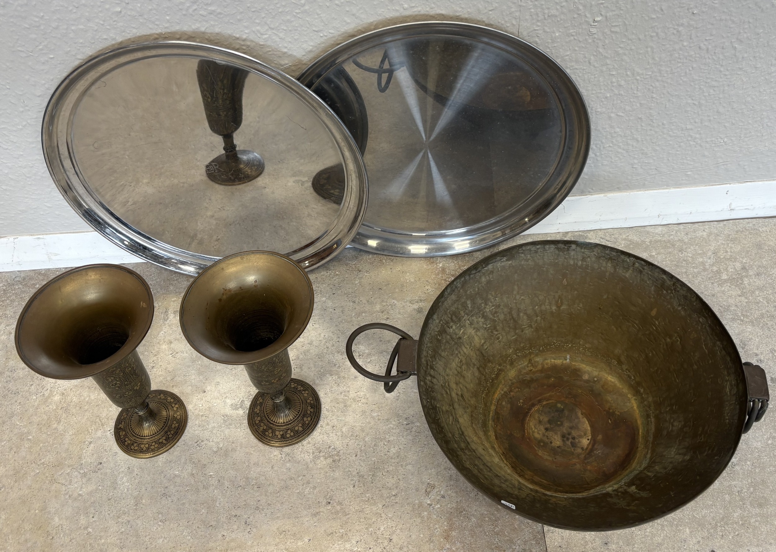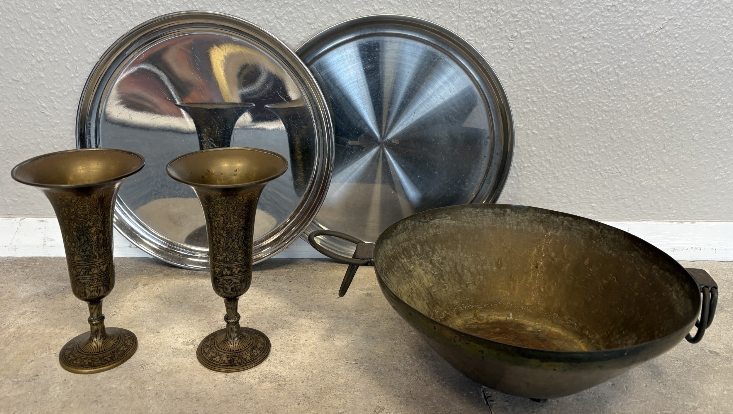 A pair of 20th Century stainless steel Military trays with Elizabeth II sypher together with a three-legged copper bowl and a pair of Persian style brass vases. Est. £20 - £30.