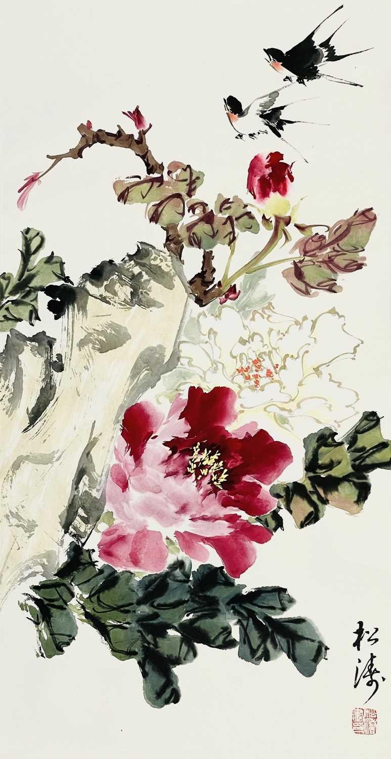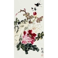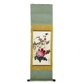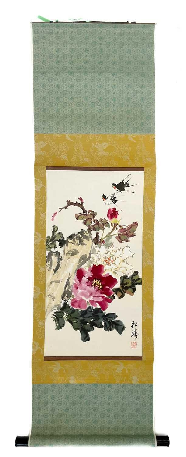 A Chinese painted hanging scroll, signed, early-mid 20th century. With birds and floral sprays, length 150cm, width 45cm, image length 66.5cm, width 35cm.
