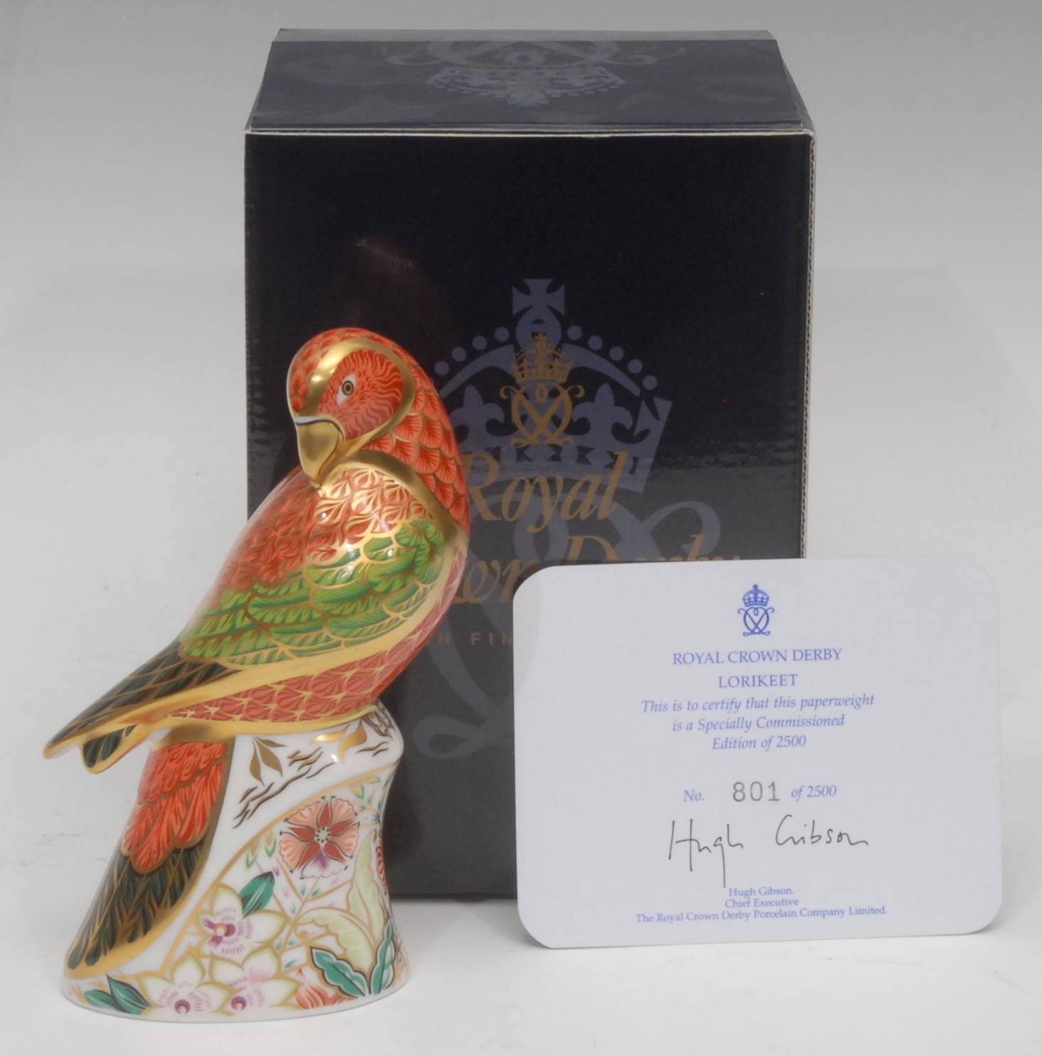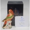 A Royal Crown Derby paperweight, Lorikeet, specially commissioned, limited edition 801/2,500, gold stopper, 16cm, printed mark in red, certificate, boxed