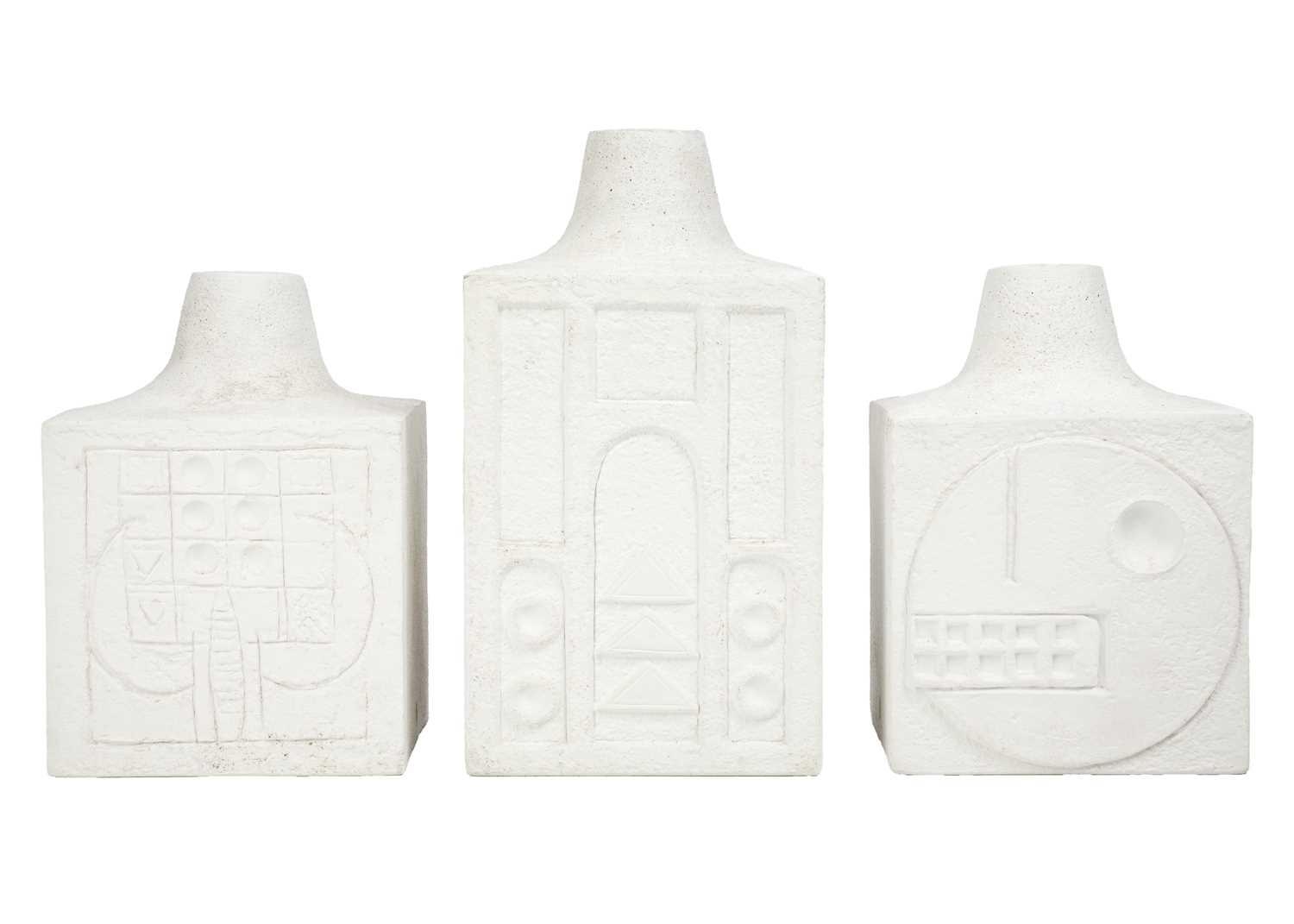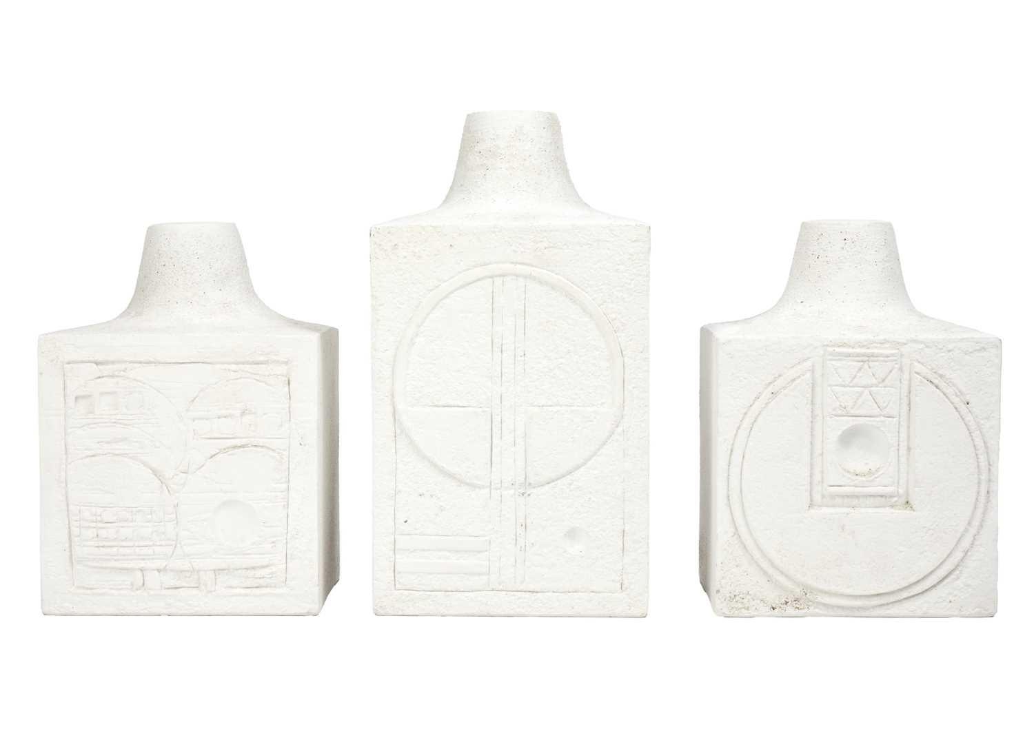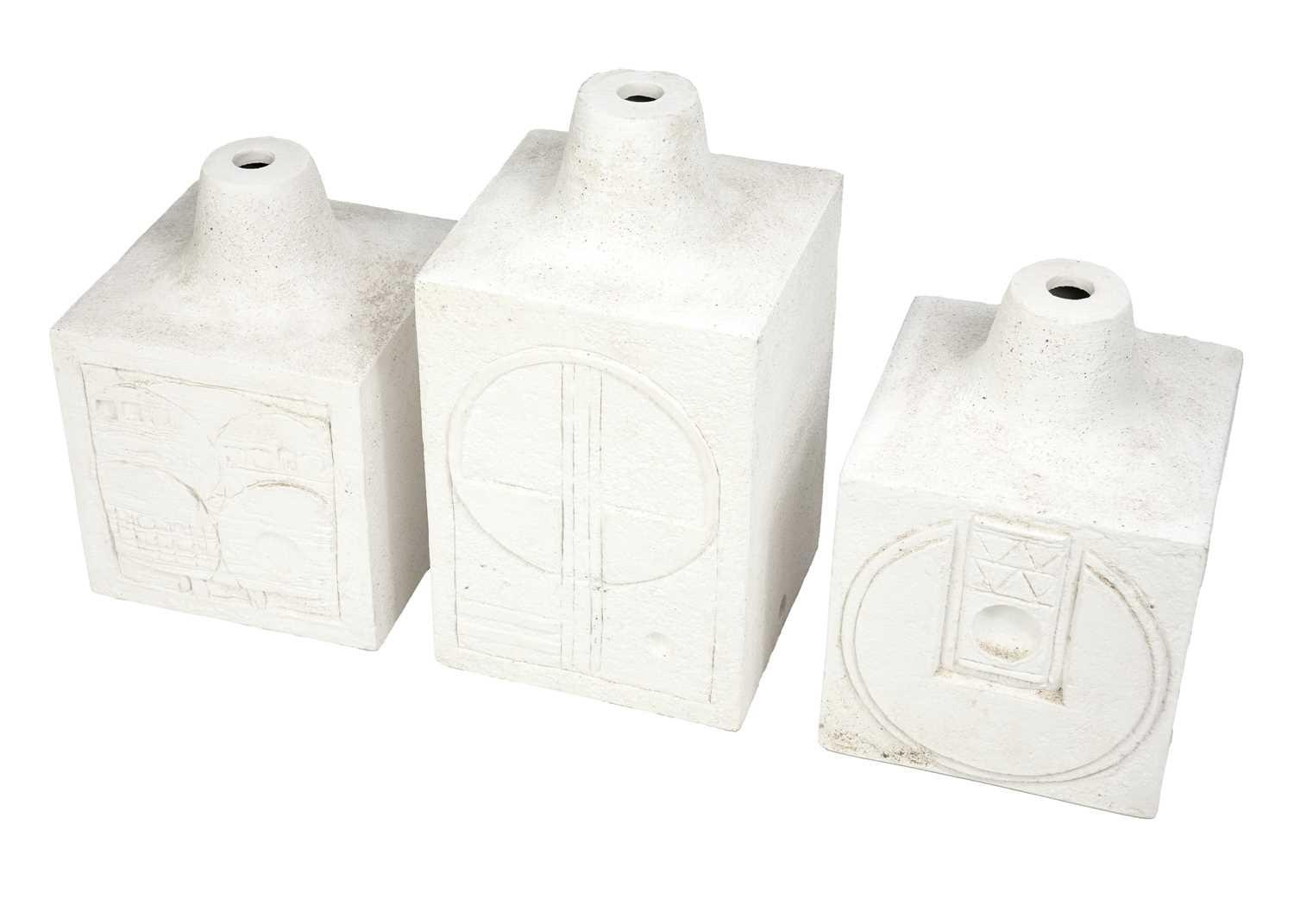 A Troika biscuit pottery table lamp base. Height 24cm together with two Troika biscuit pottery cube table lamp bases. (3) Bought from a storage barn in Carnyorth in the '80s by Peter Swanson. The following is taken from Ben Harris's and Lawrence Illsey's book 'troika 63-83' page 162. "Leslie was desperate for money and also sold all the unglazed biscuit ware that was left" "Some were put into storage in a barn at Carnyorth but disappeared when a mineshaft opened, swallowing half the barn and moulds."