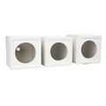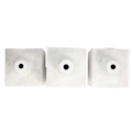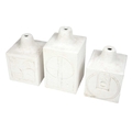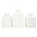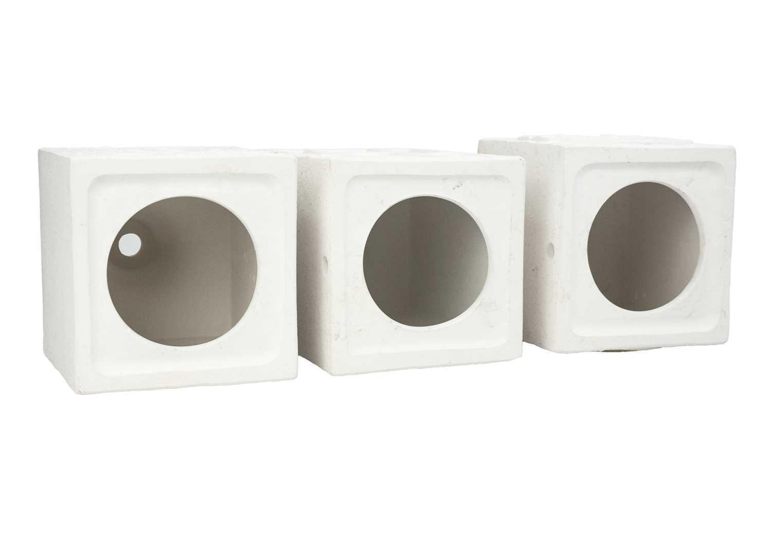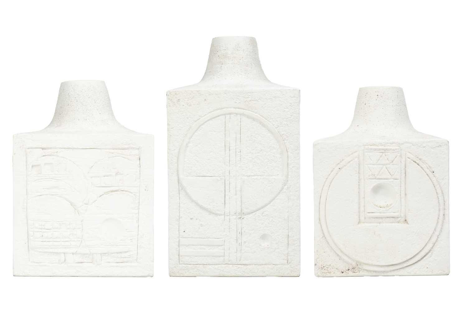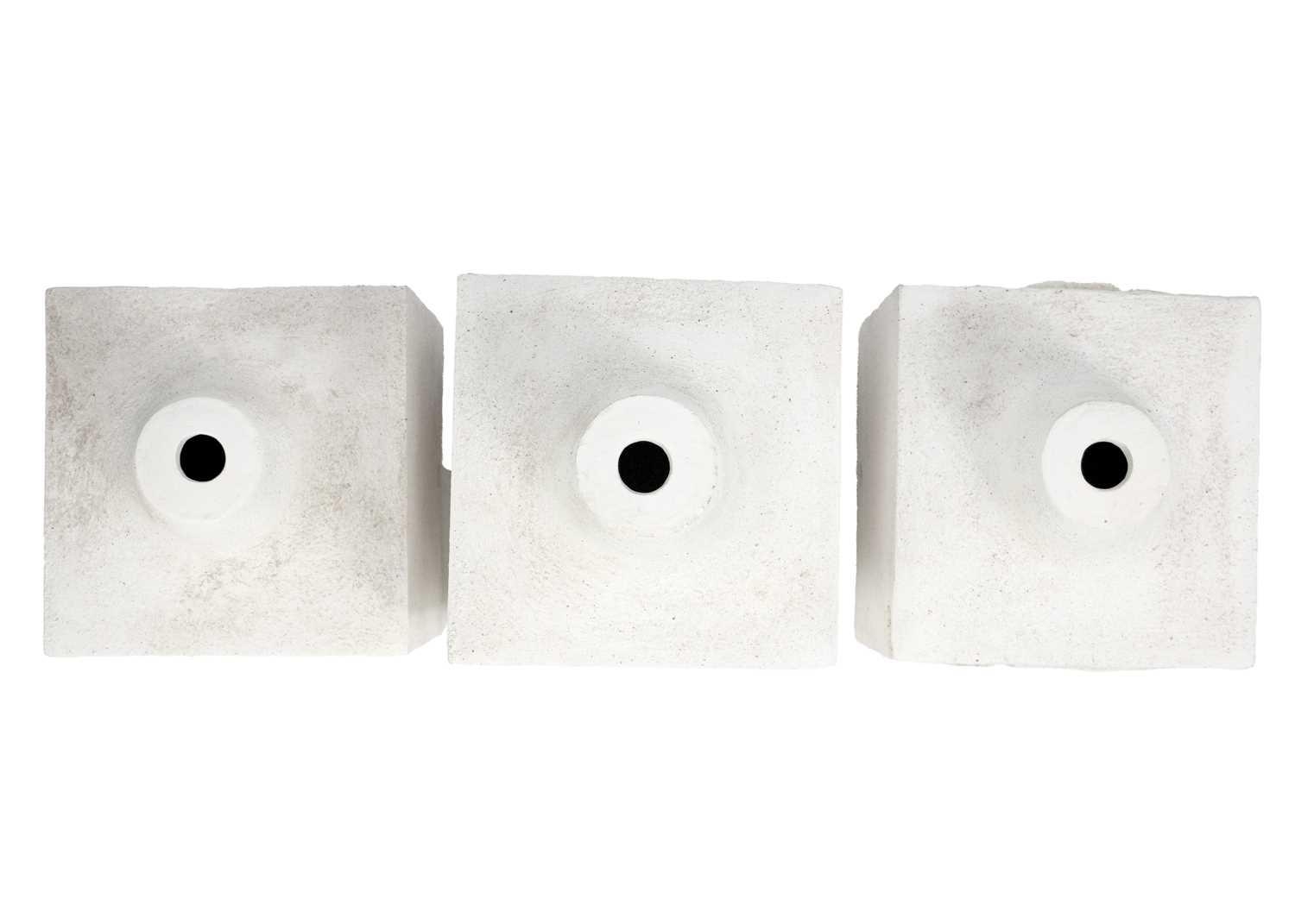 A Troika biscuit pottery table lamp base. Height 24cm together with two Troika biscuit pottery cube table lamp bases. (3) Bought from a storage barn in Carnyorth in the '80s by Peter Swanson. The following is taken from Ben Harris's and Lawrence Illsey's book 'troika 63-83' page 162. "Leslie was desperate for money and also sold all the unglazed biscuit ware that was left" "Some were put into storage in a barn at Carnyorth but disappeared when a mineshaft opened, swallowing half the barn and moulds."