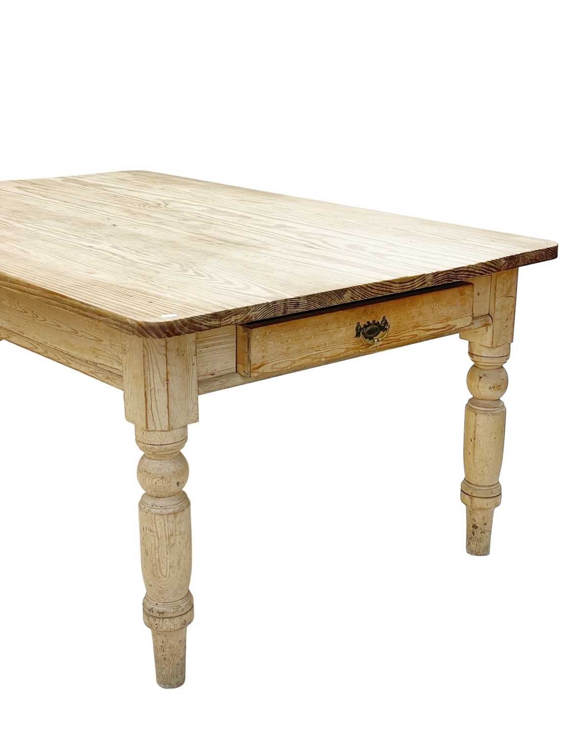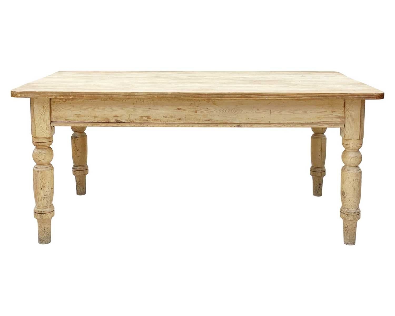 A large late Victorian pine kitchen table. Fitted an end drawer, raised on turned legs, height 77cm, width 173cm, depth 111cm.