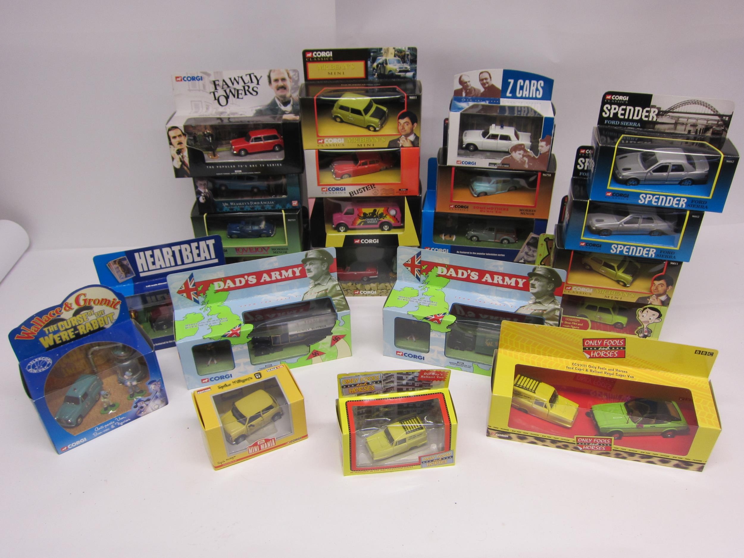 A collection of twenty-two boxed Corgi diecast TV and Film related diecast vehicles and sets to include 09002 Dad's Army, 18501 Dad's Army, 96012 Spender (x2), HPT0434001 Harry Potter, 01801 Buster, 00802 Fawlty Towers, CC01701 Heartbeat, 96757 Lovejoy, 96758 Some Mothers Do 'Ave 'Em, 96011 Mr Bean's Mini (x3), CC82224 Mr Bean, 04438 Mr Bean, CC01601 Last of the Summer Wine, 00502 Z Cars, CC82279 Spike Milligans Mini, CC80502 Wallace & Gromit, CC87501 Charlies Angels and CC99111 Only Fools and Horses, together with a Lledo Only Fools and Horses Reliant Van (23)