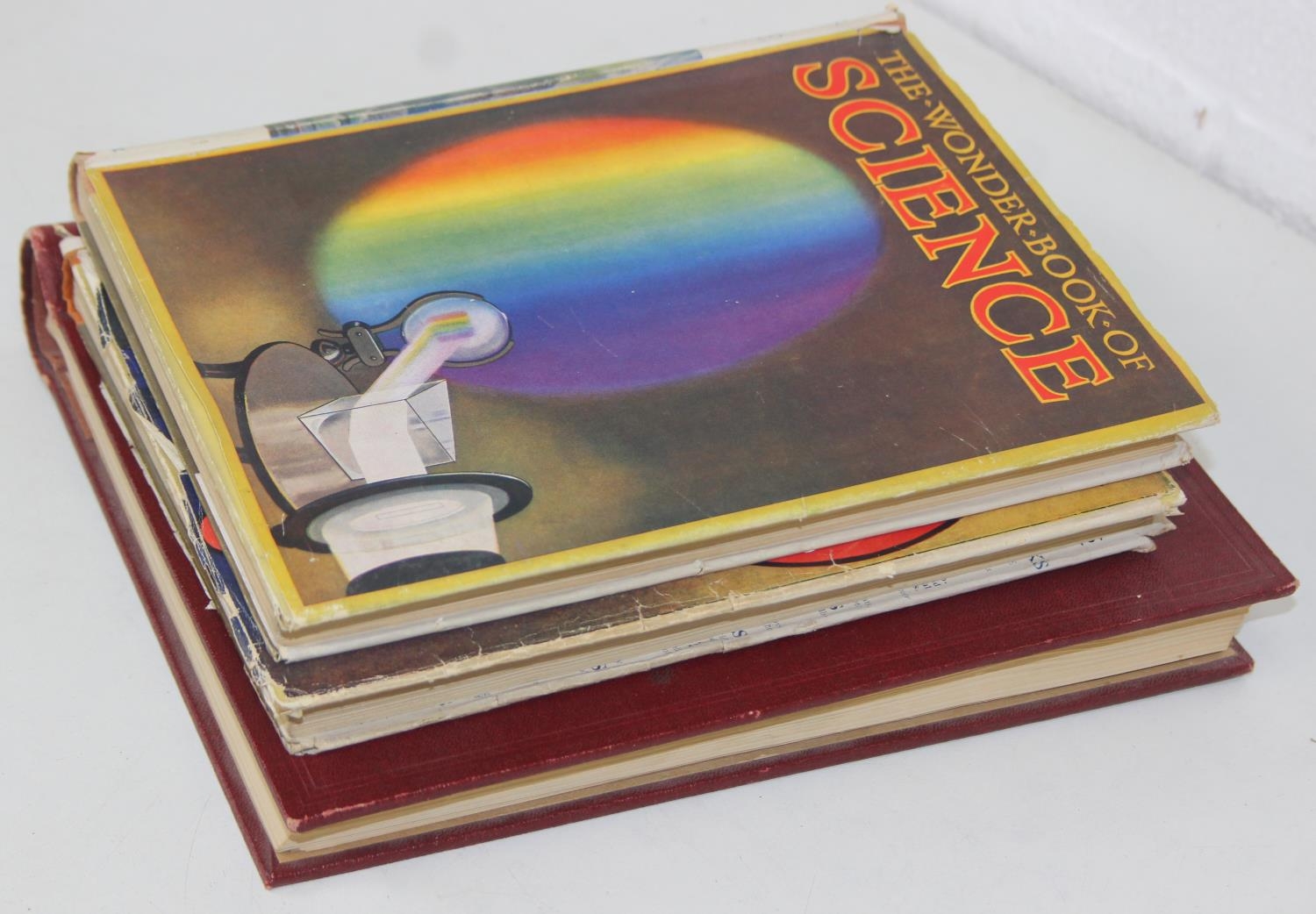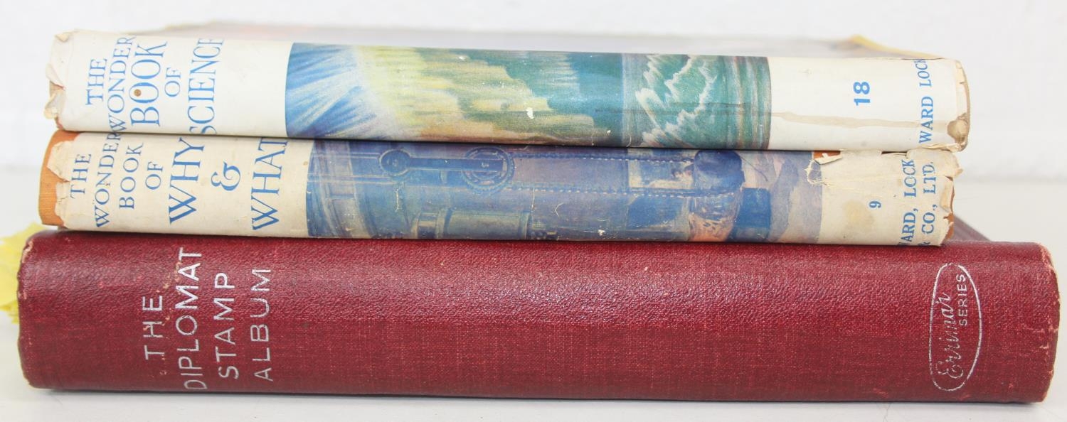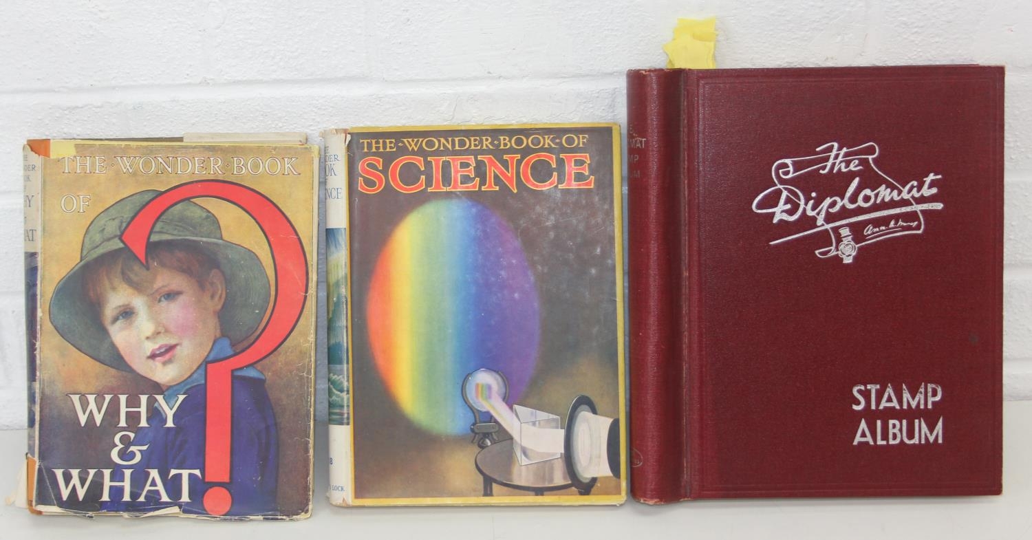 A mid-century Diplomat stamp album with a large qty of assorted mixed world stamps and two vintage Wonder Books, Science & Why & What [3]