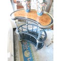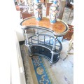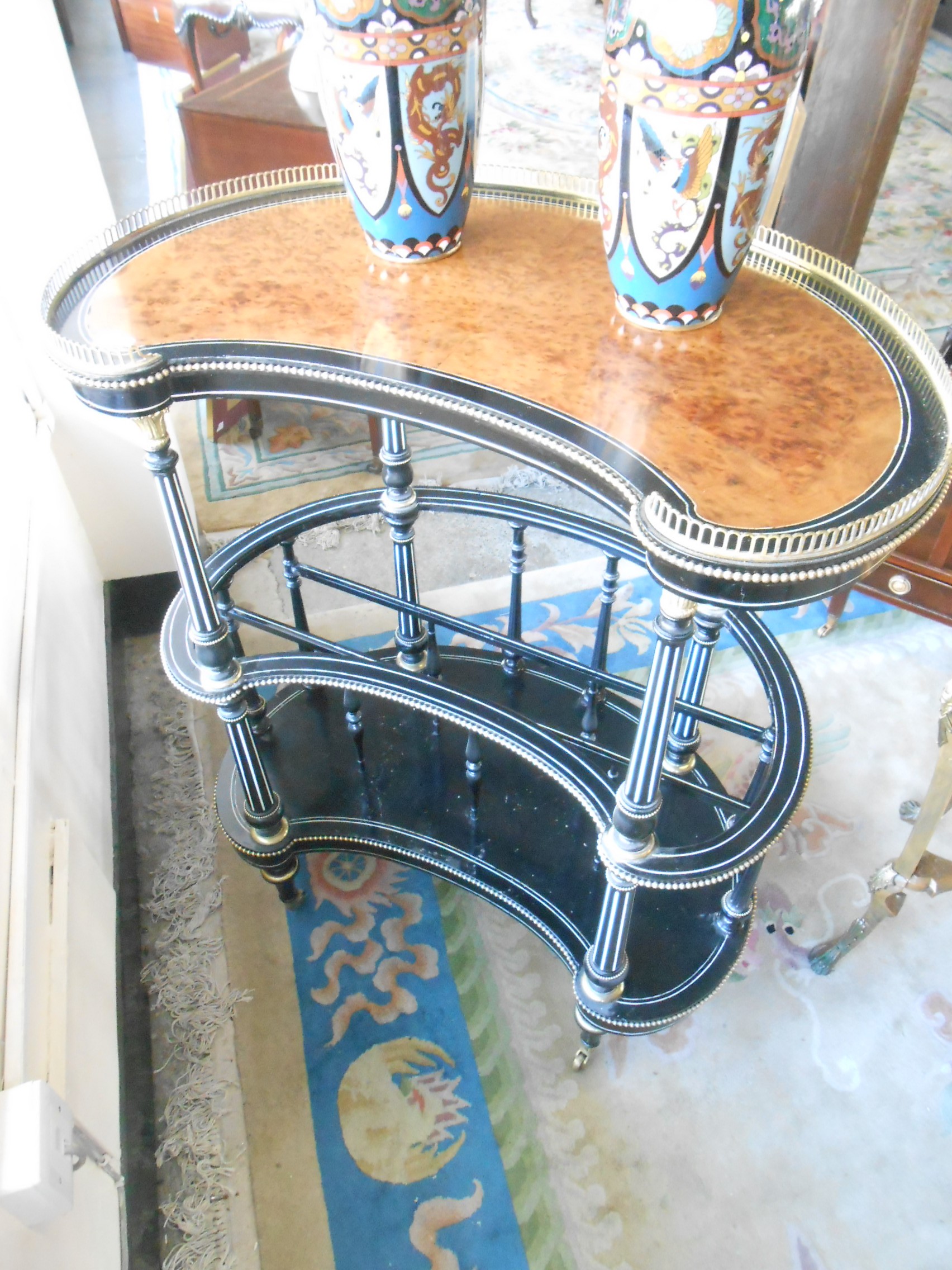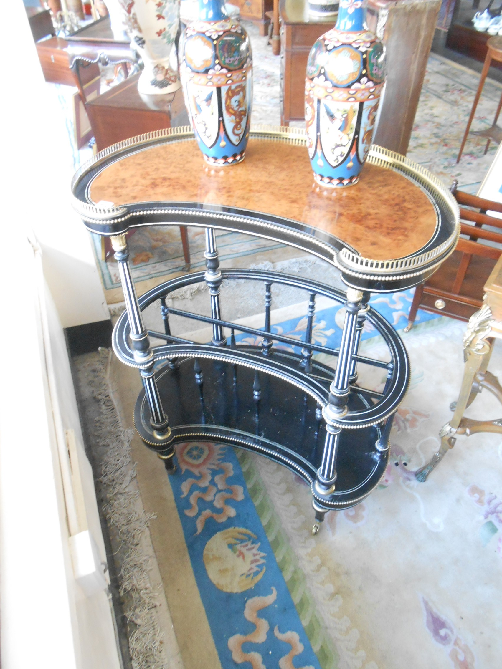A Victorian amboyna and ebonised music Canterbury of kidney form, with fluted supports, on turned legs and brass castors - 34in. wide