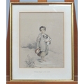 Girl on a Path Holding a Dog and a Jug, pencil drawing heightened with white,