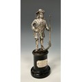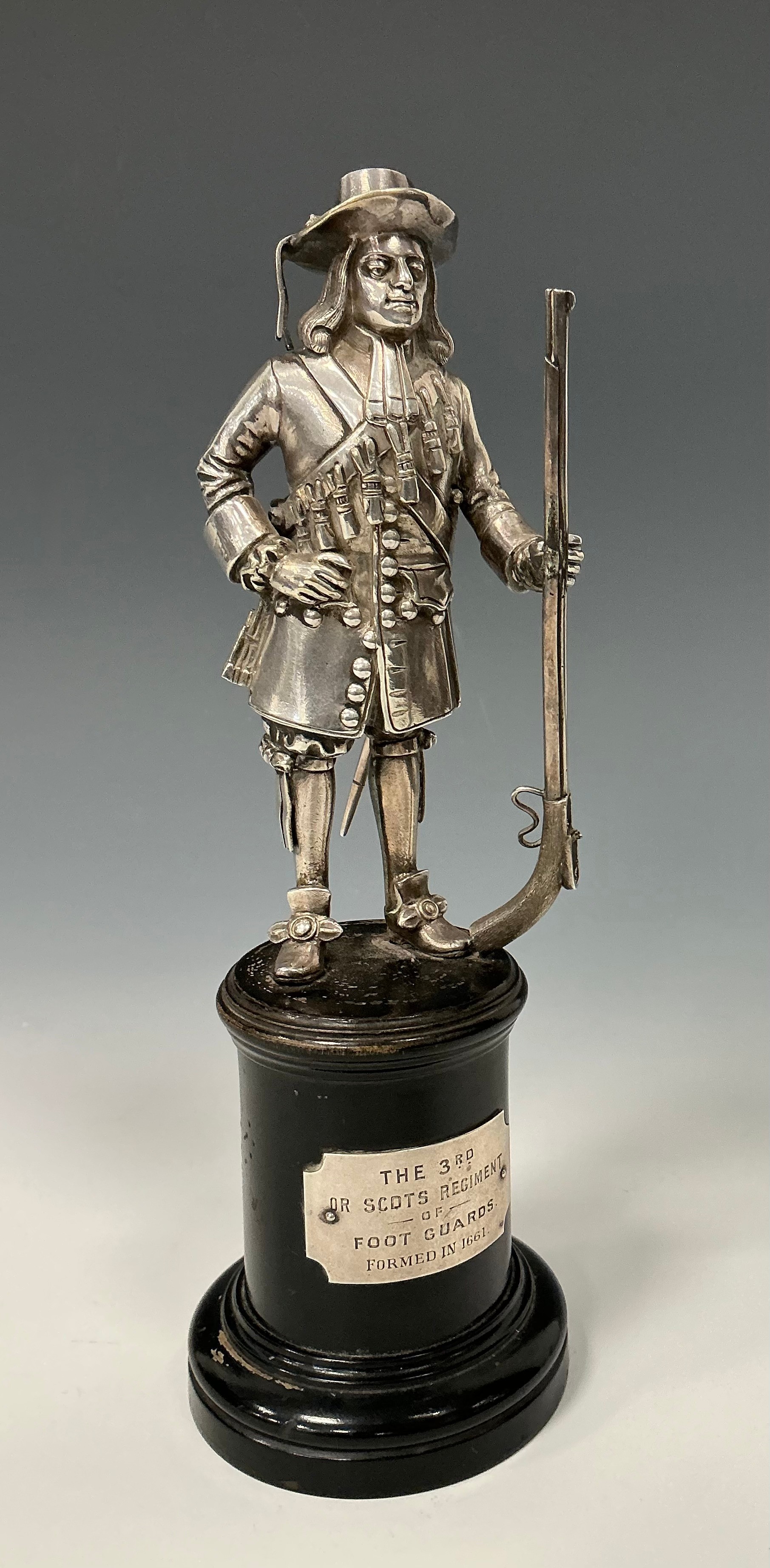 Scottish Military Interest - an early 20th century silver plated figure, of a 17th century infantryman, he stands, with musket at his side, the ebonised plinth with cartouche inscribed The 3rd Or Scots Regiment of Foot Guards, Formed in 1661, 23cm high overall