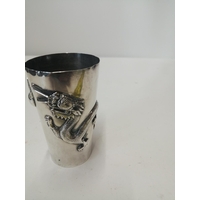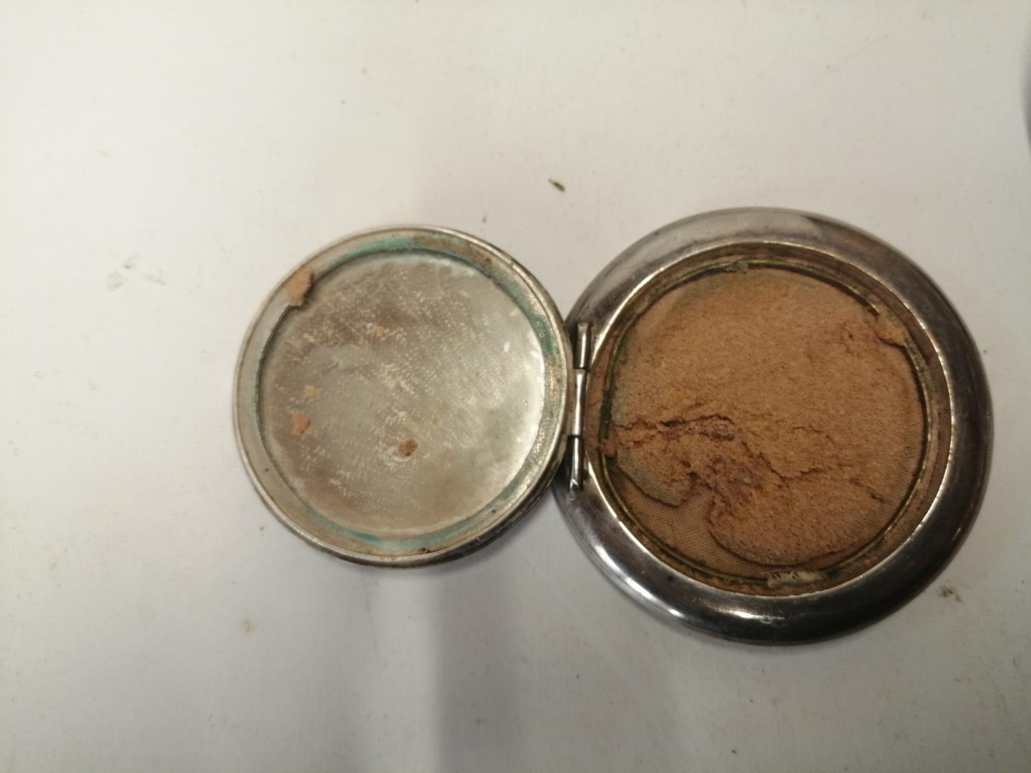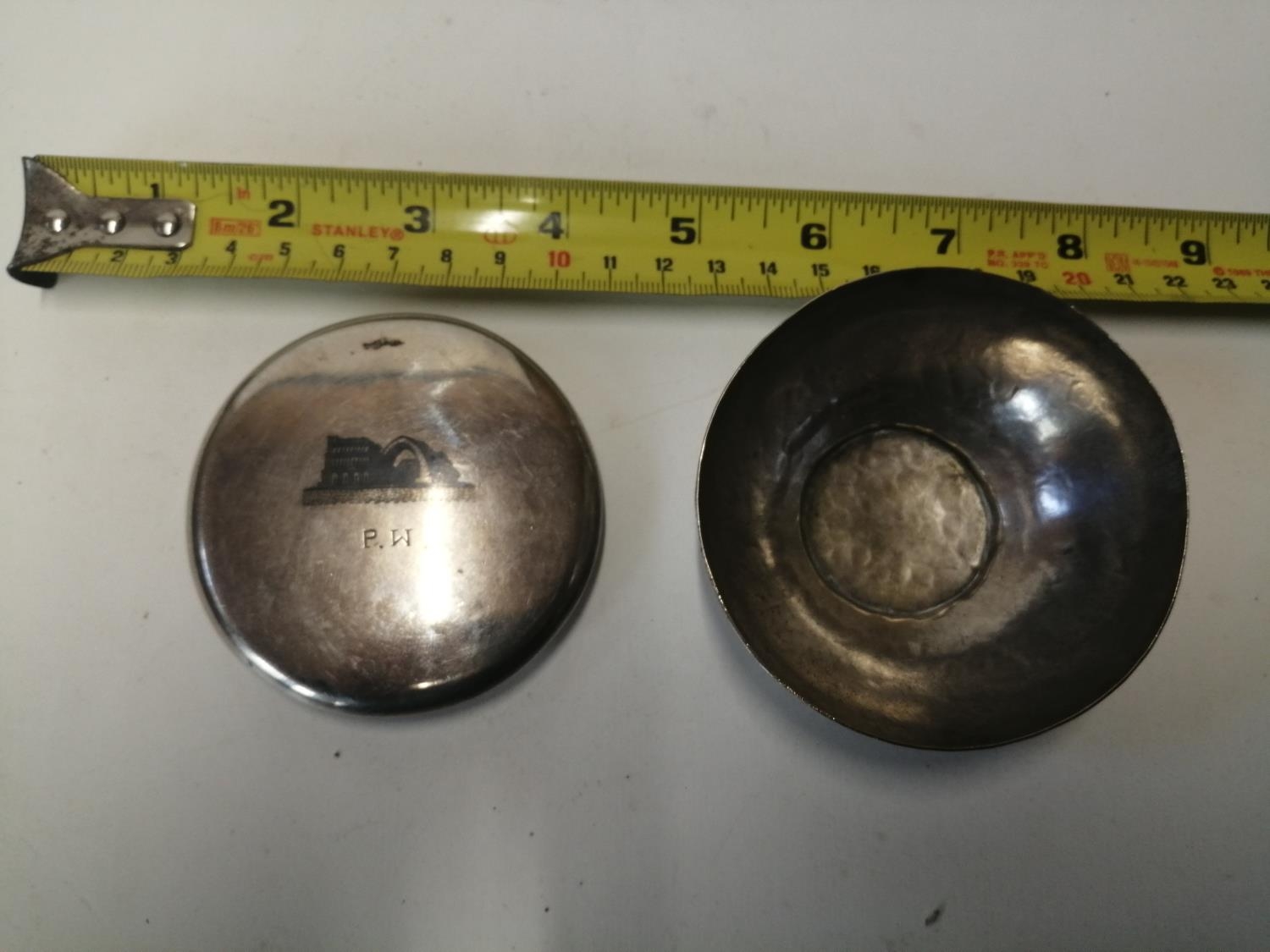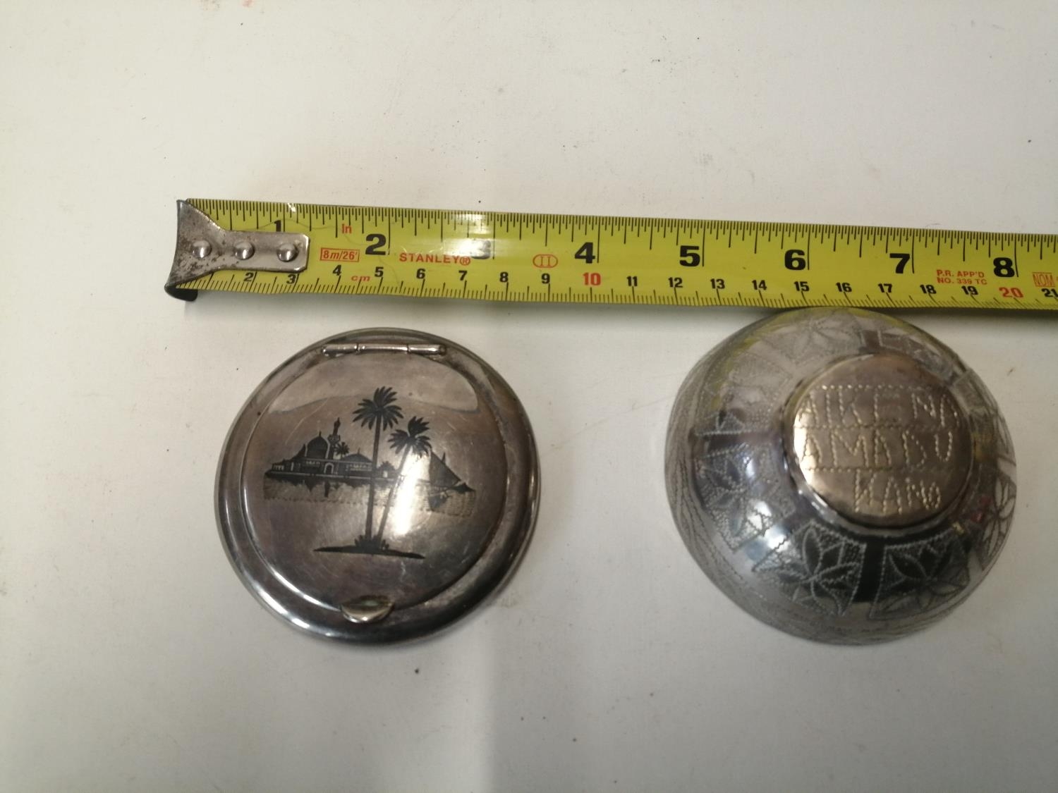 Unmarked Egyptian silver niello work powder compact and base metal bowl