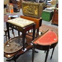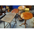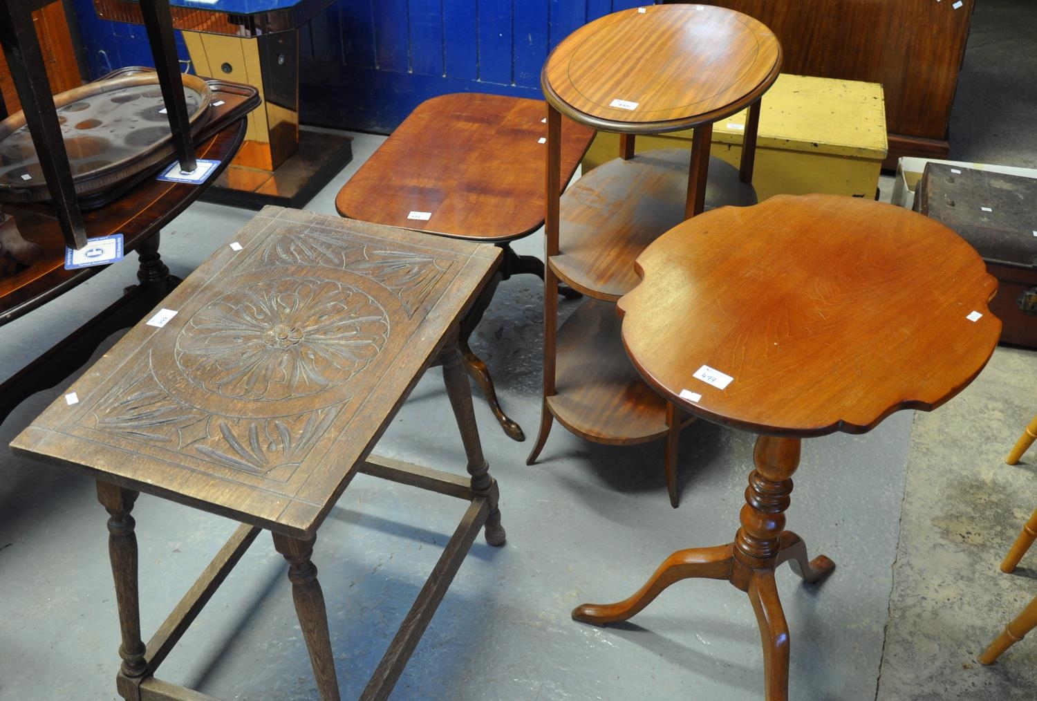 Edwardian mahogany three tier whatnot of oval form, together with a carved oak side table, an Edwardian style tripod table and another. (4)