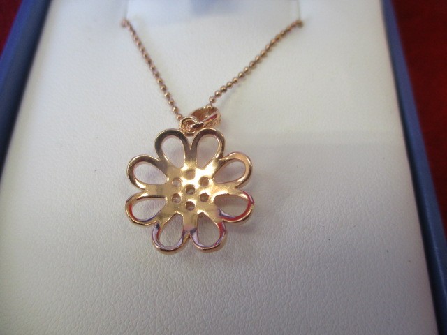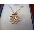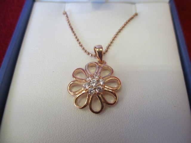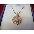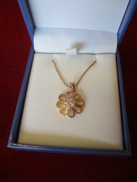 STERLING SILVER (ROSE GOLD) PLATED CHAIN AND FLOWER PENDANT WITH DIAMANTE CENTRE, BOXED