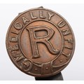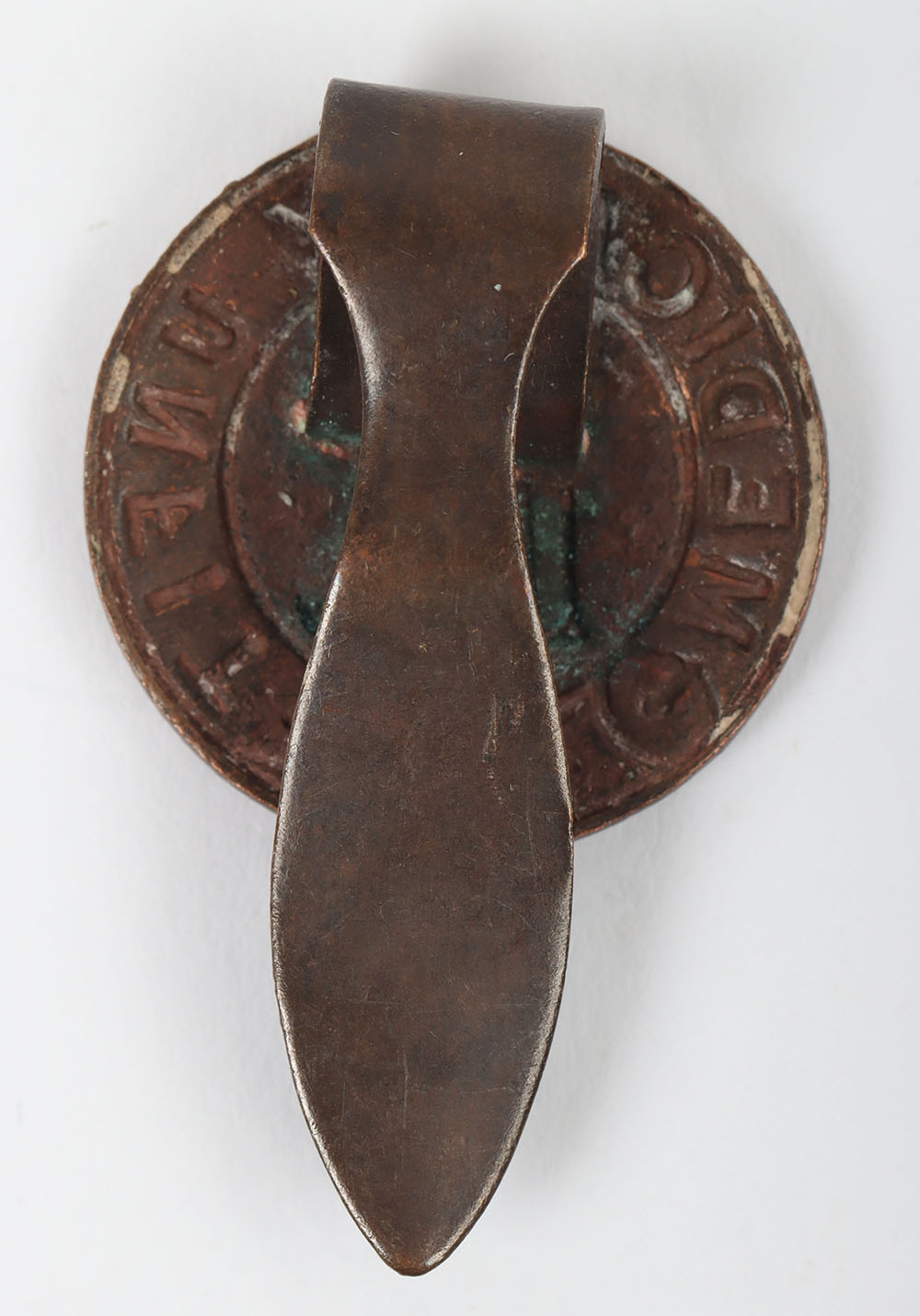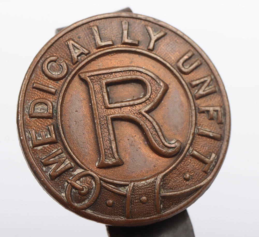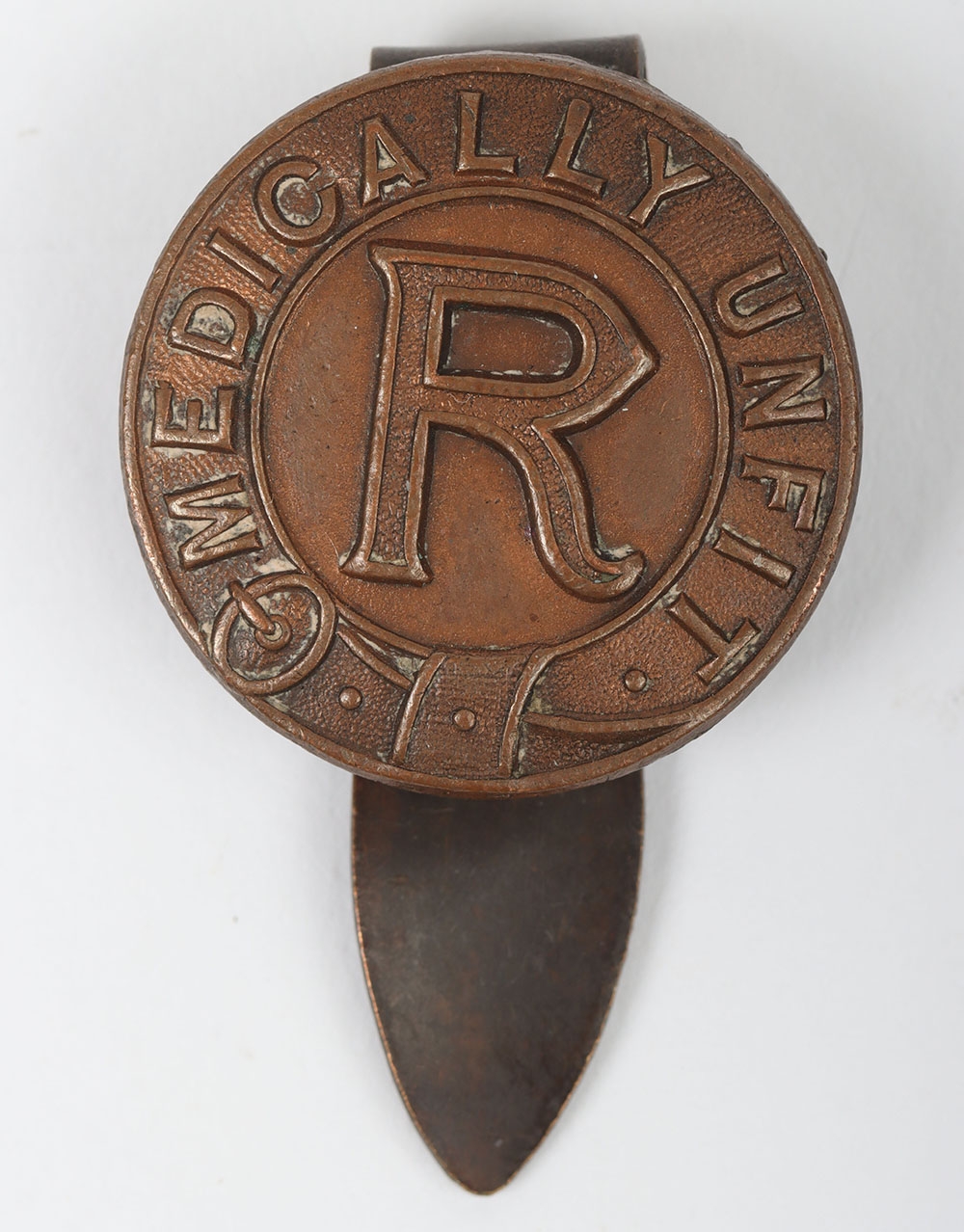 WW1 Medically Unfit Lapel Badge, interesting brass circular badge with strap ‘MEDICALLY UNFIT’ and ‘R’ to the centre. Blade slider fitting to the reverse.