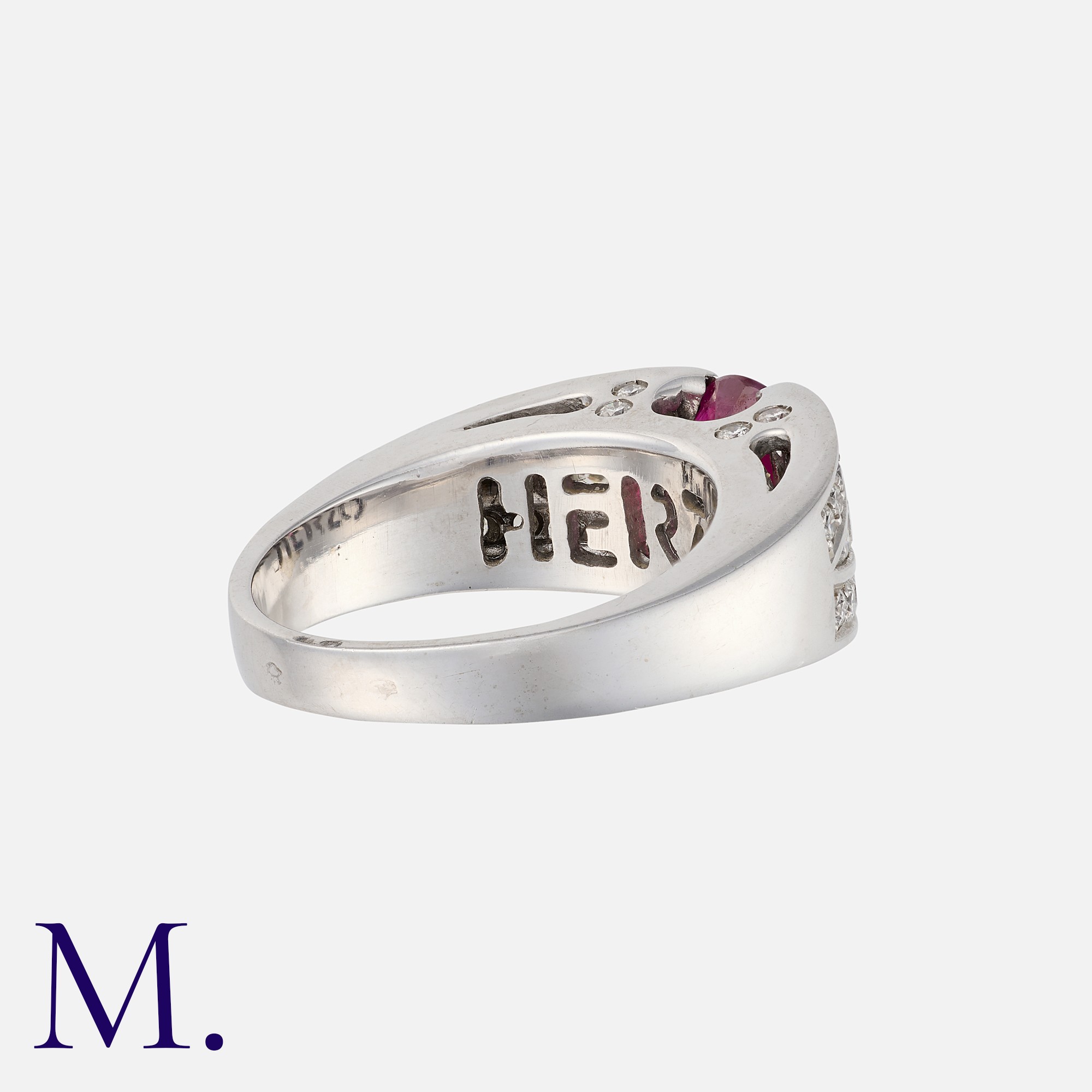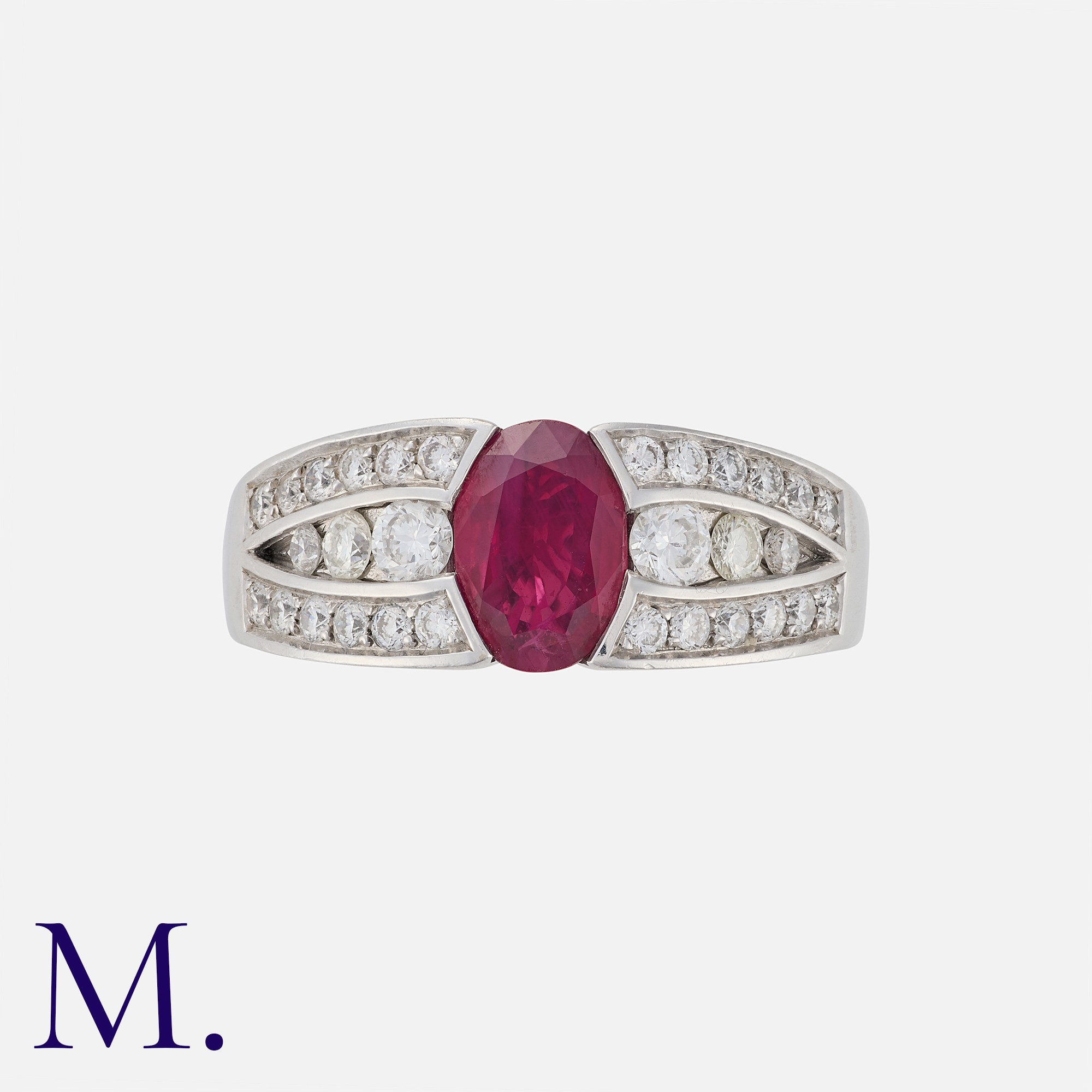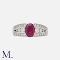 A French Ruby and Diamond Ring in 18K white gold, set with an oval cut ruby weighing approx. 1.2ct with round cut diamonds to the shoulders weighing approx. 0.40ct. French marks for 18ct gold.