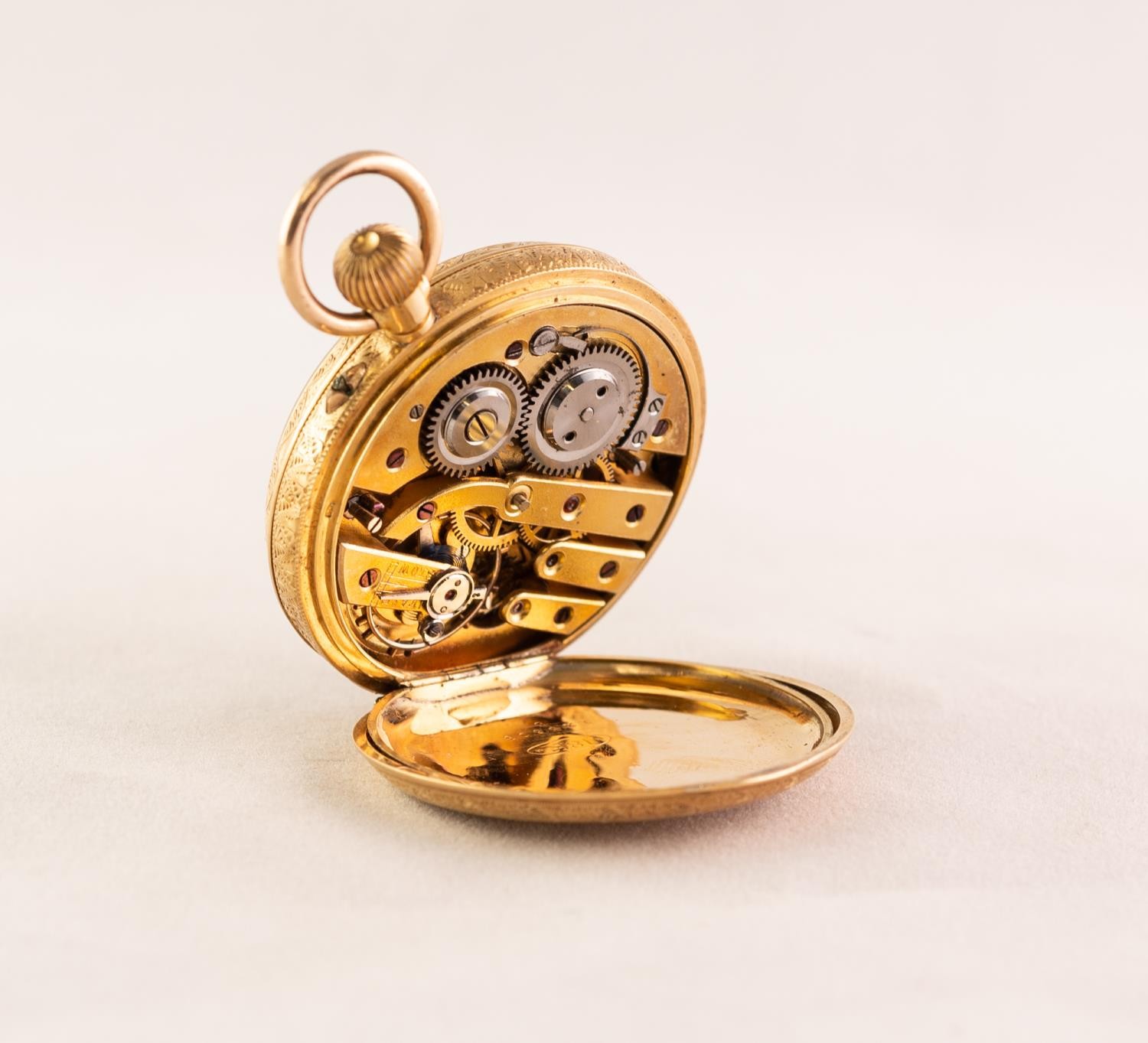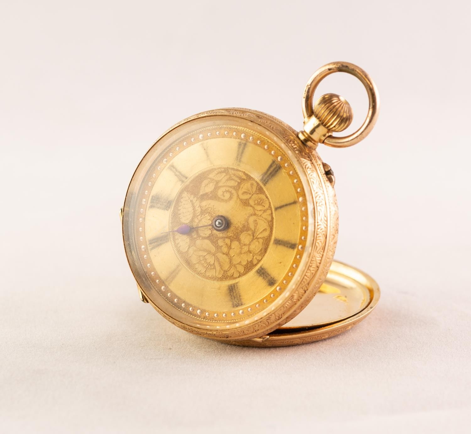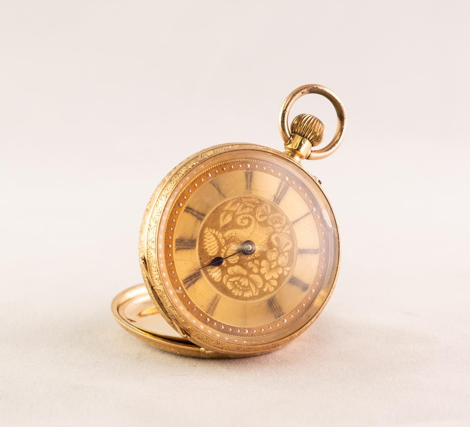 EARLY 20th CENTURY SWISS 18K GOLD CASED LADY'S KEYLESS OPEN FACE FOB WATCH, with engraved case, gross weight 39.5 gms