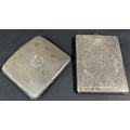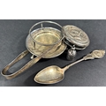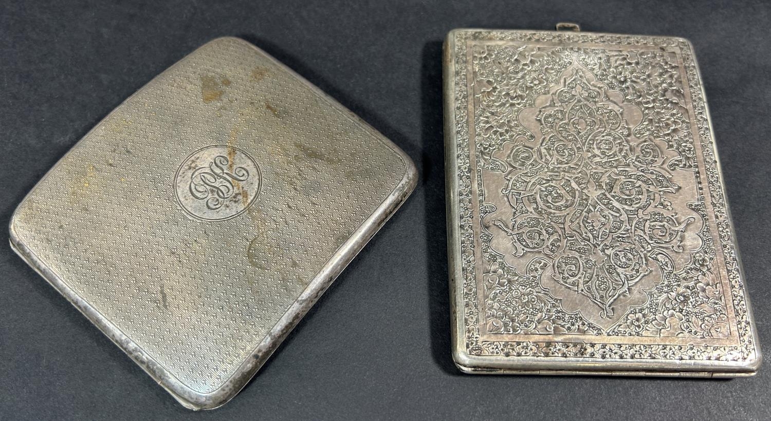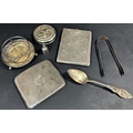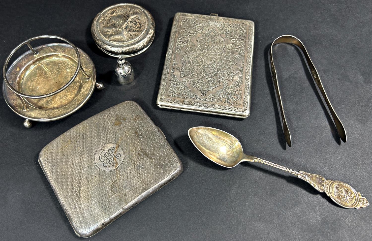 A richly engraved silver cigarette case, a curved cigarette case, sugar tong, teaspoon, two silver caps and a silver bottle stand, 10 ozs approximately