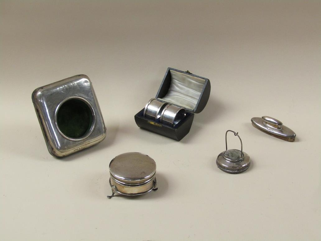 COLLECTION OF SMALL ITEMS OF SILVER INC. WATCH BOX , STAND, NAIL BUFFER, RING BOX, 2 NAPKIN RINGS