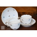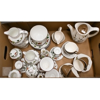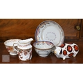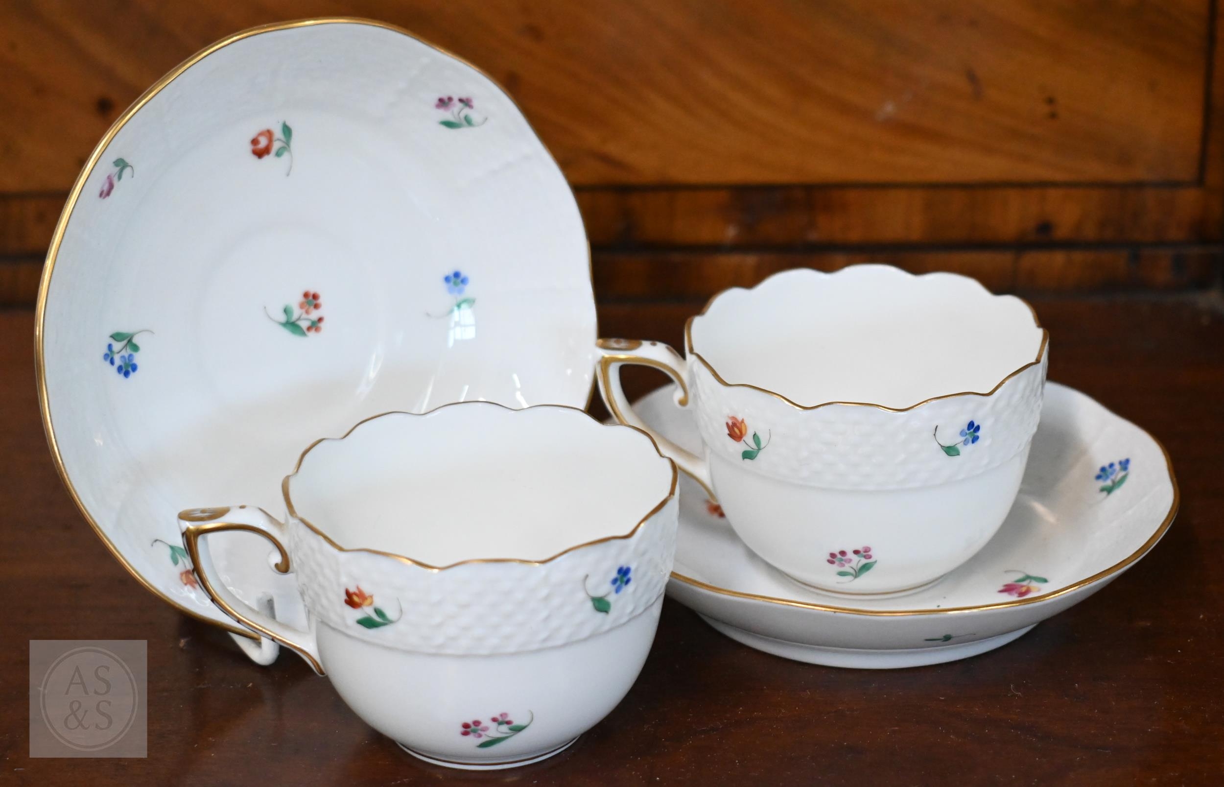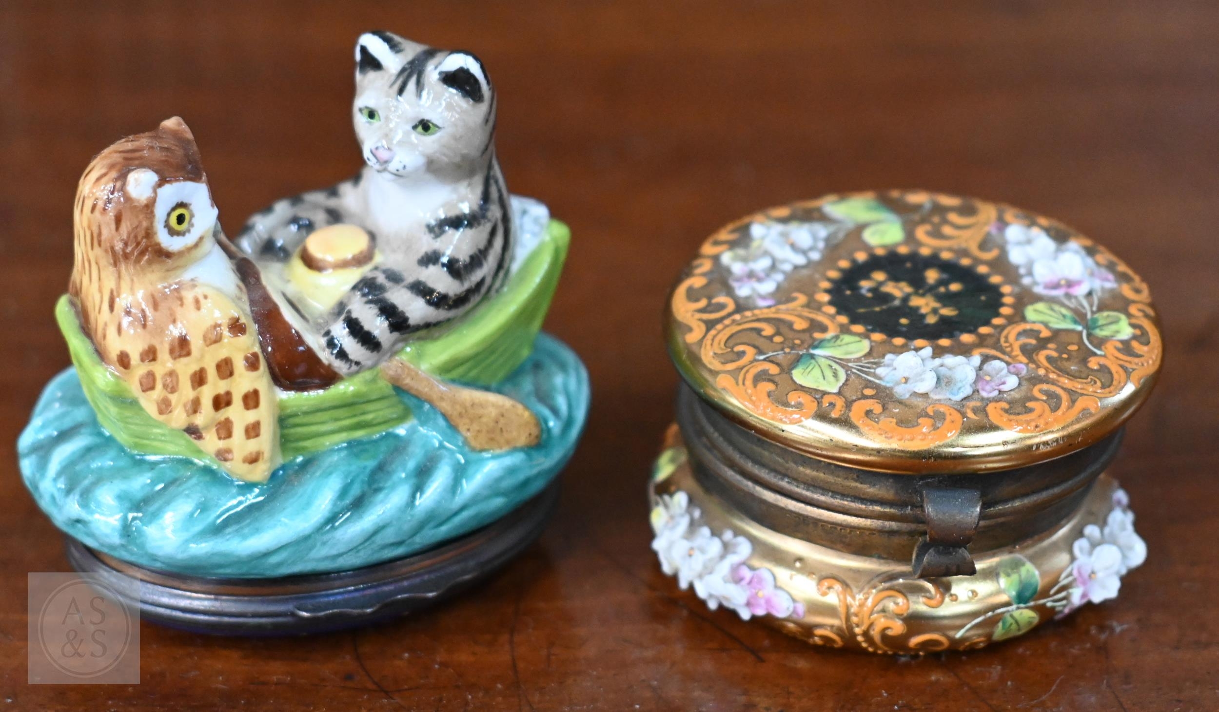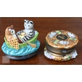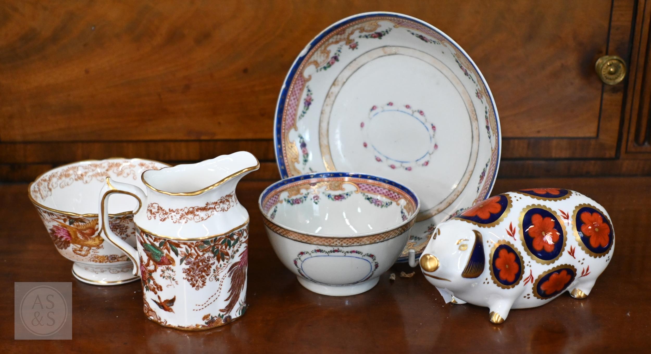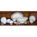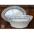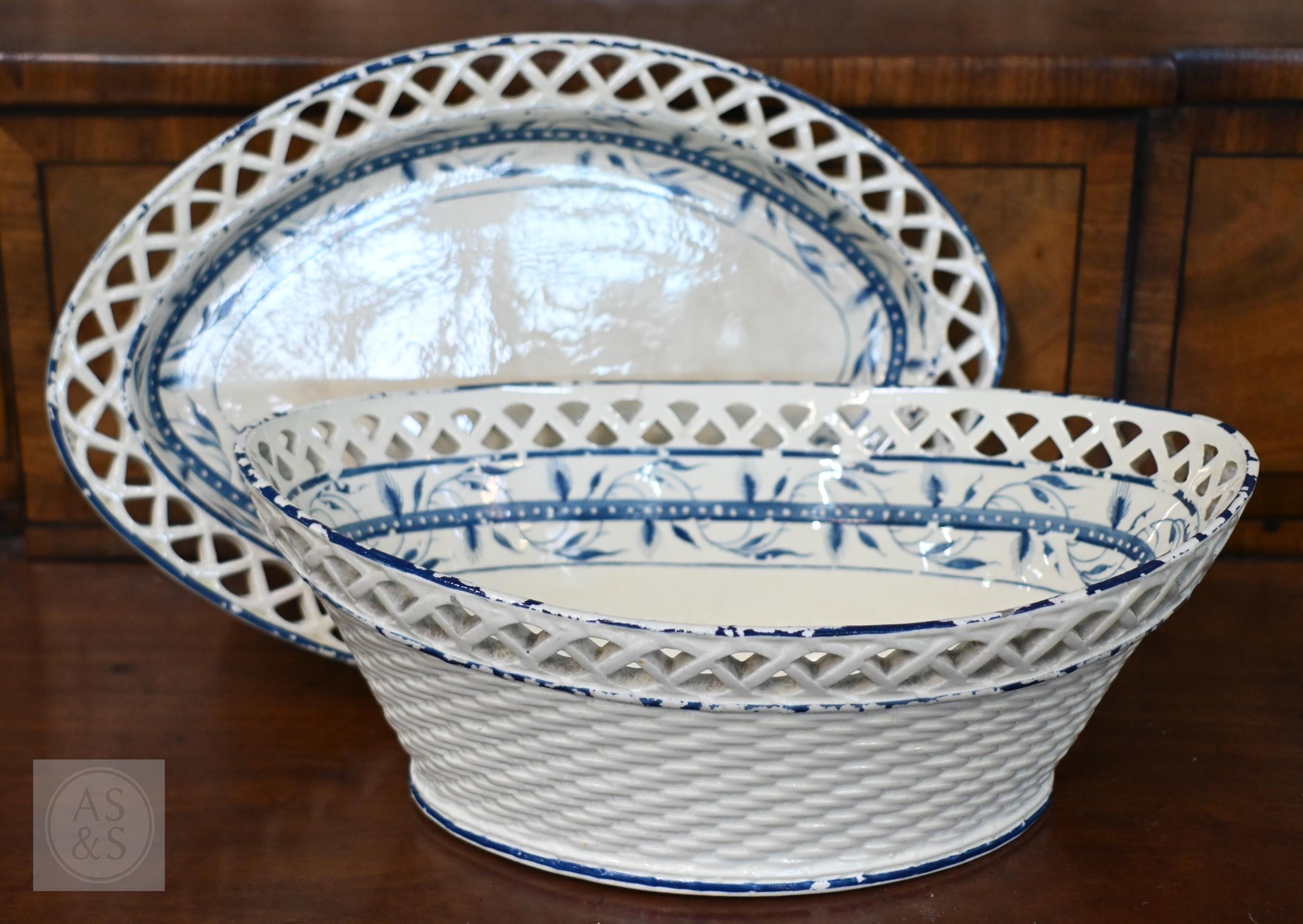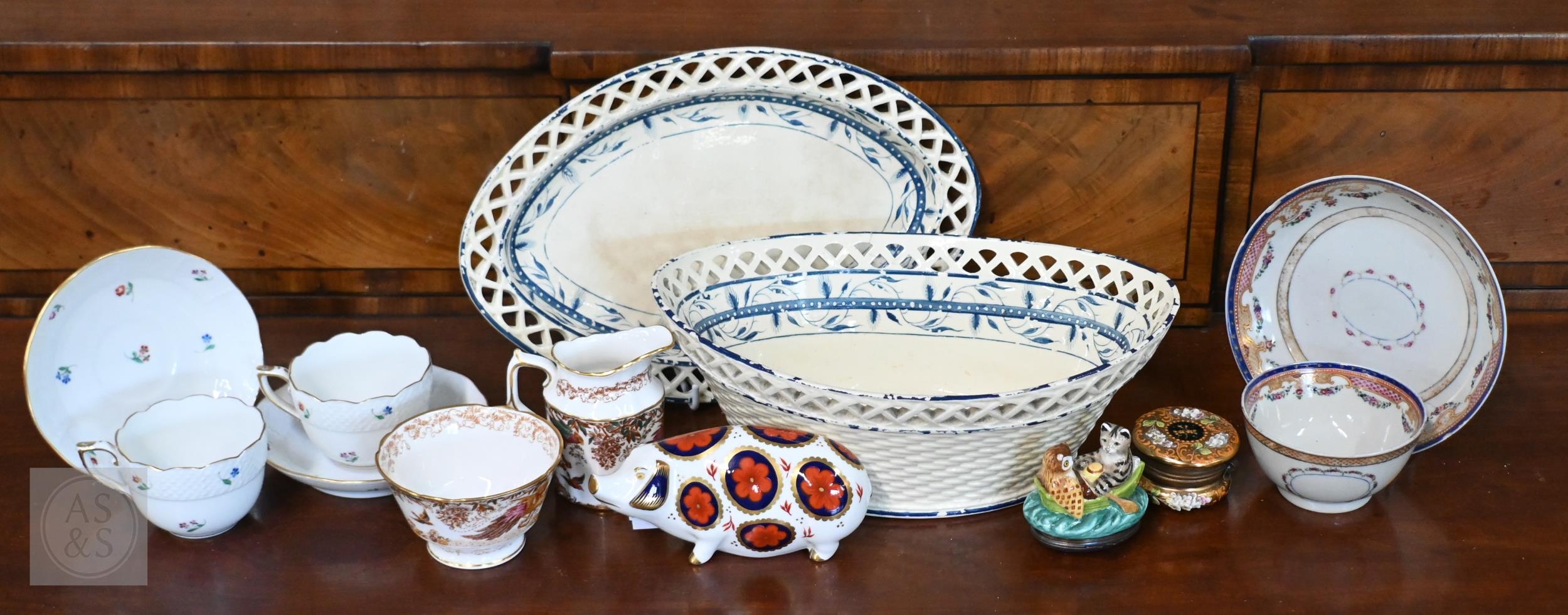 A Georgian creamware eliptical basket on stand with blue and white barley decoration, pierced rims and basket-work moulding, 27 x 18 cm overall, to/w a tea bowl and saucer, a pair of Herend coffee cups and saucers painted with Deutscheblumen, a Royal Crown Derby 'Olde Avesbury' cream and sugar pair and a pig paperweight, a Halcyon Days 'Owl & the Pussycat' box and a Venetian green and gilt glass box with hinged top (box)