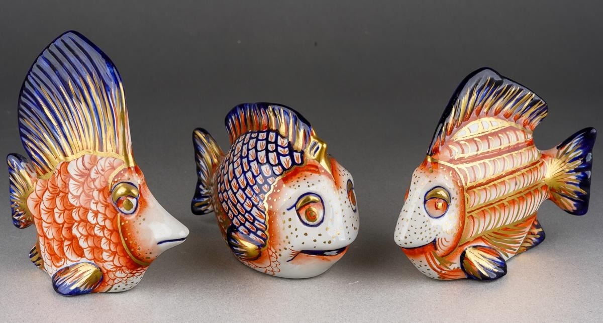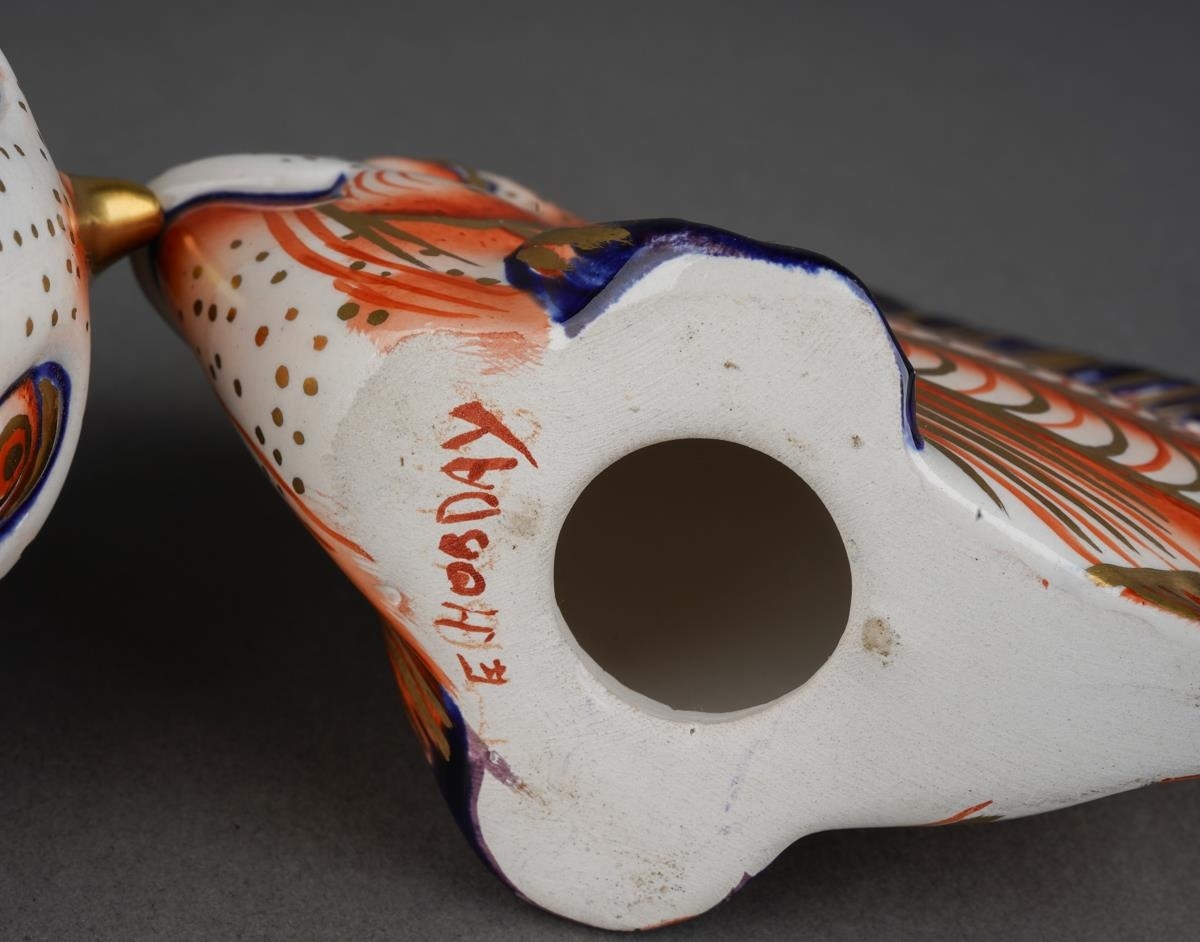 Three late 20th / 21st century novelty Imari palette ceramic fishes, all signed E. Hobday to the bases, height of tallest 9.5cm approx, height of smallest 6cm approx (3)