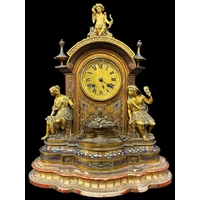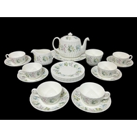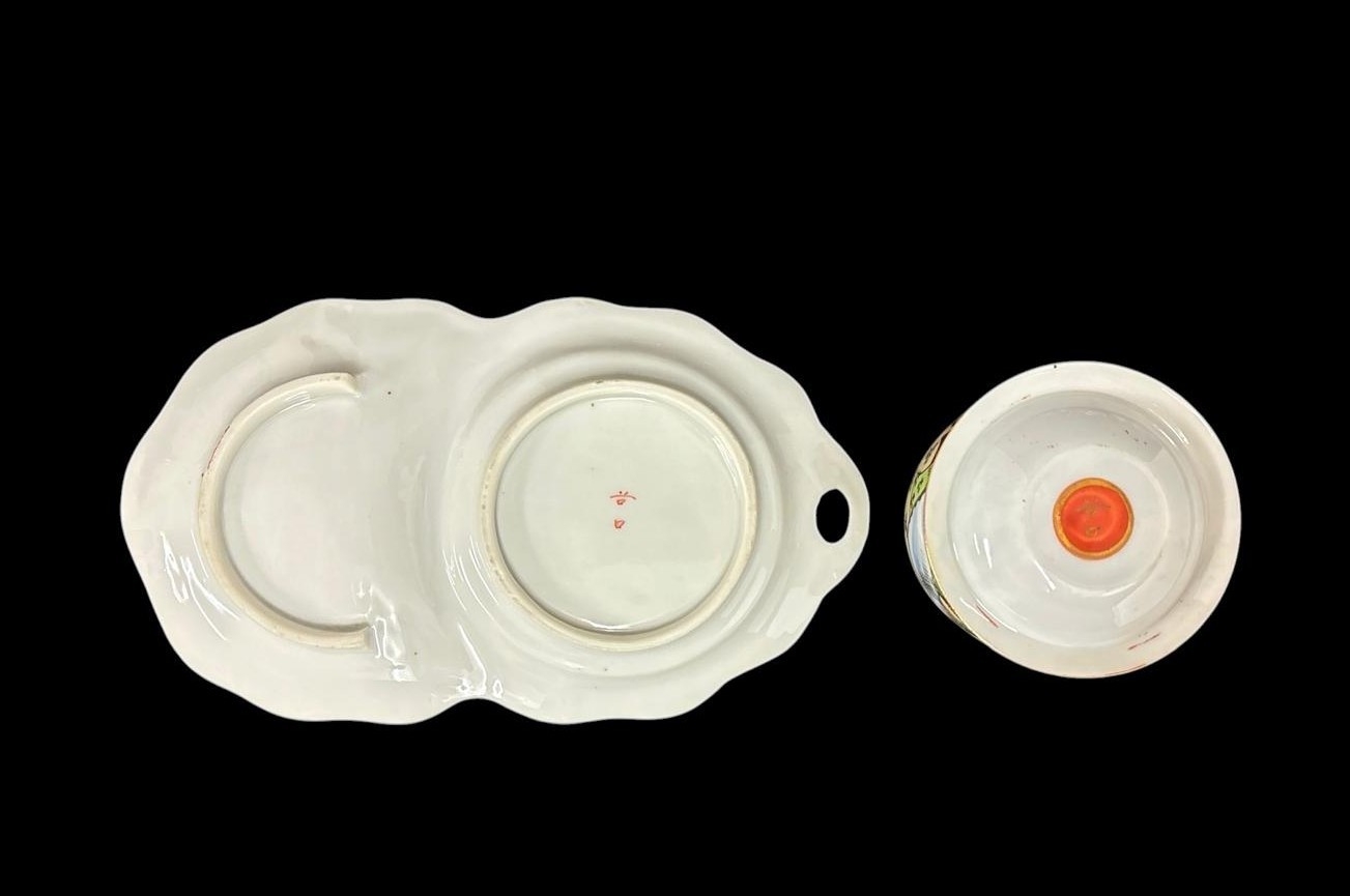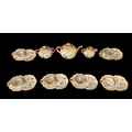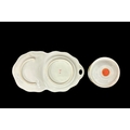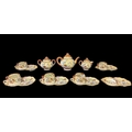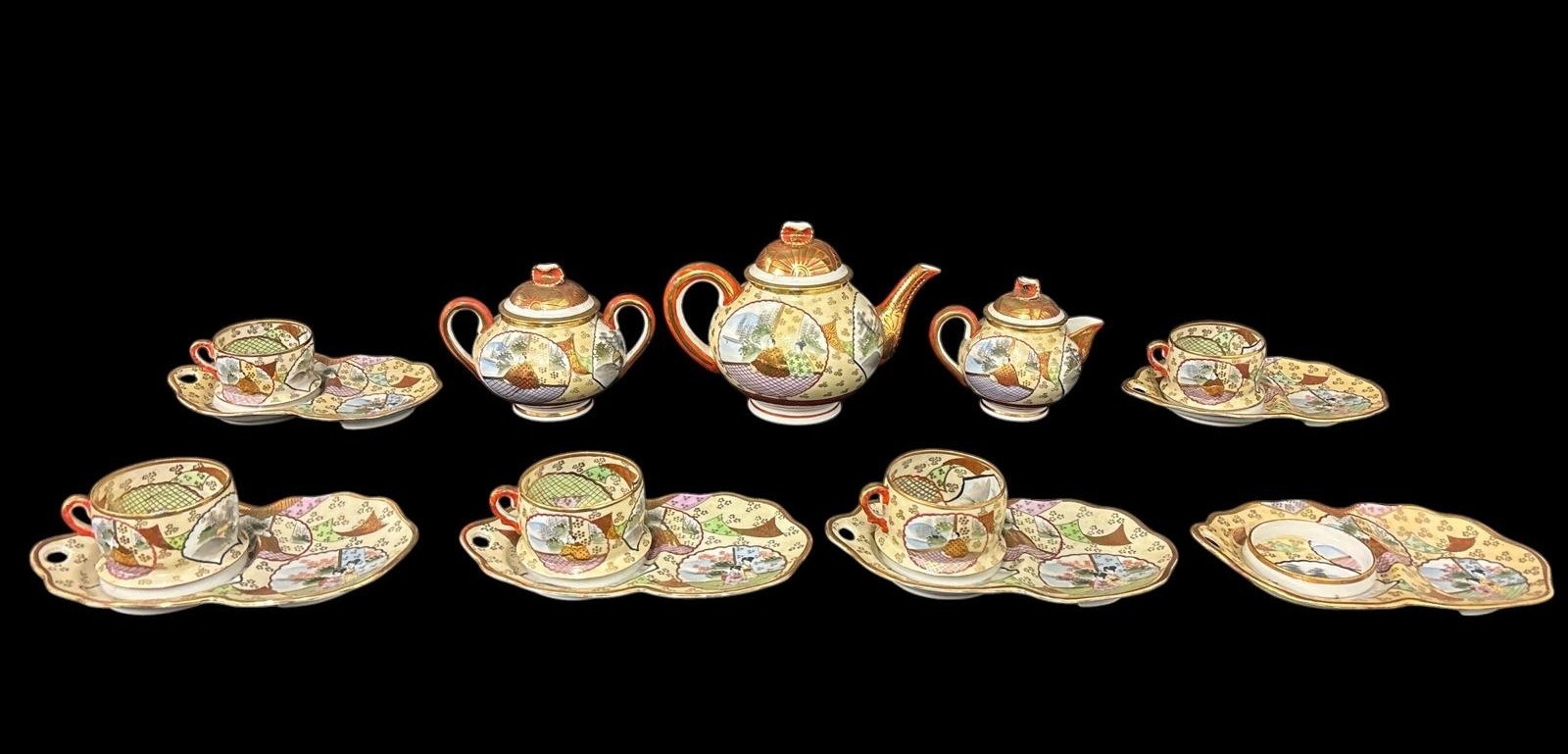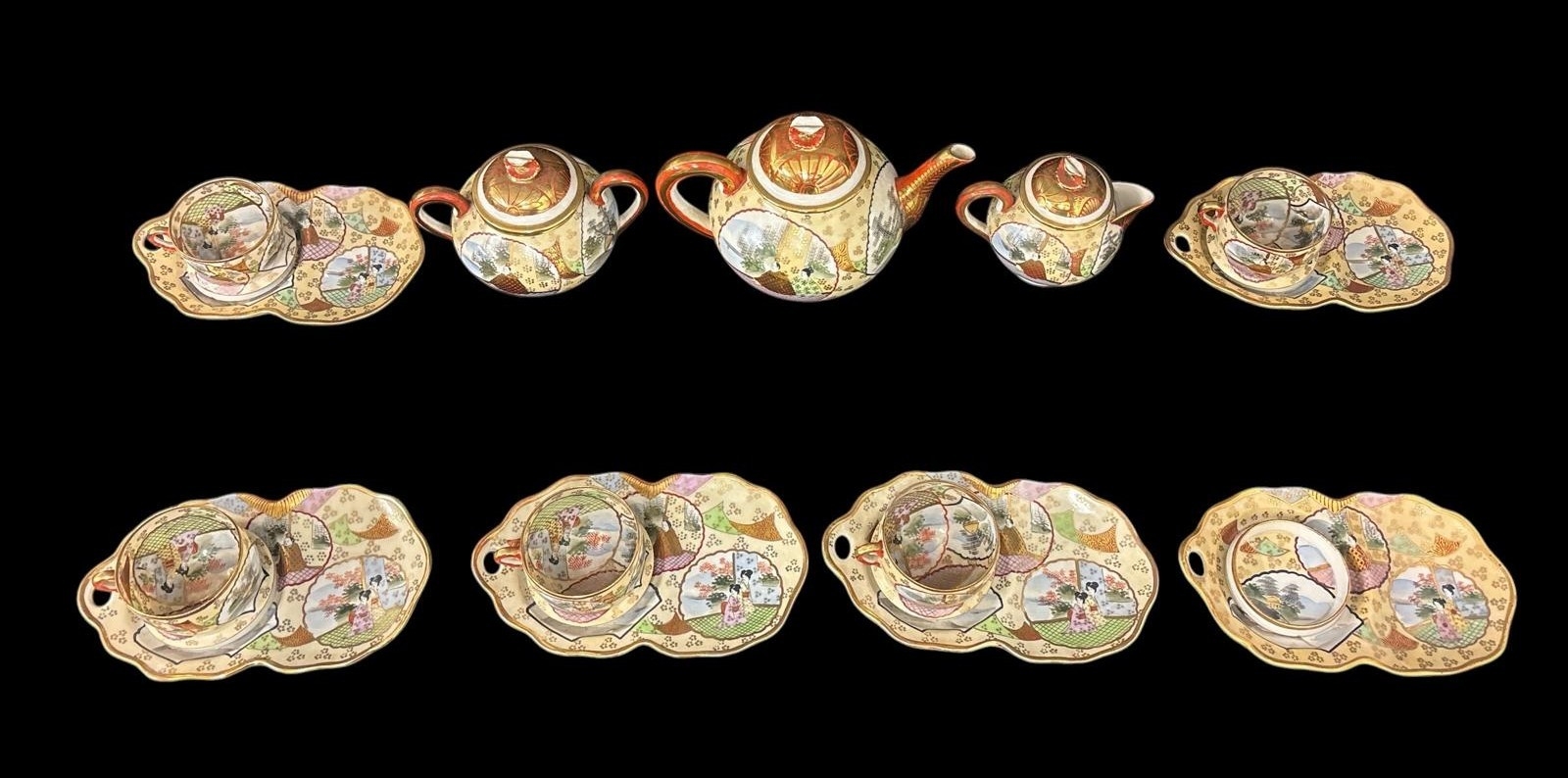 A VINTAGE JAPANESE KUTANI PART TEA SERVICE featuring gilt and red bordered vignettes on an ivory toned background comprising a teapot, lidded sugar bowl and creamer, six shaped saucers with inset servers grasp and side dish, five cups, with hallmarks to base c.1930s (14)