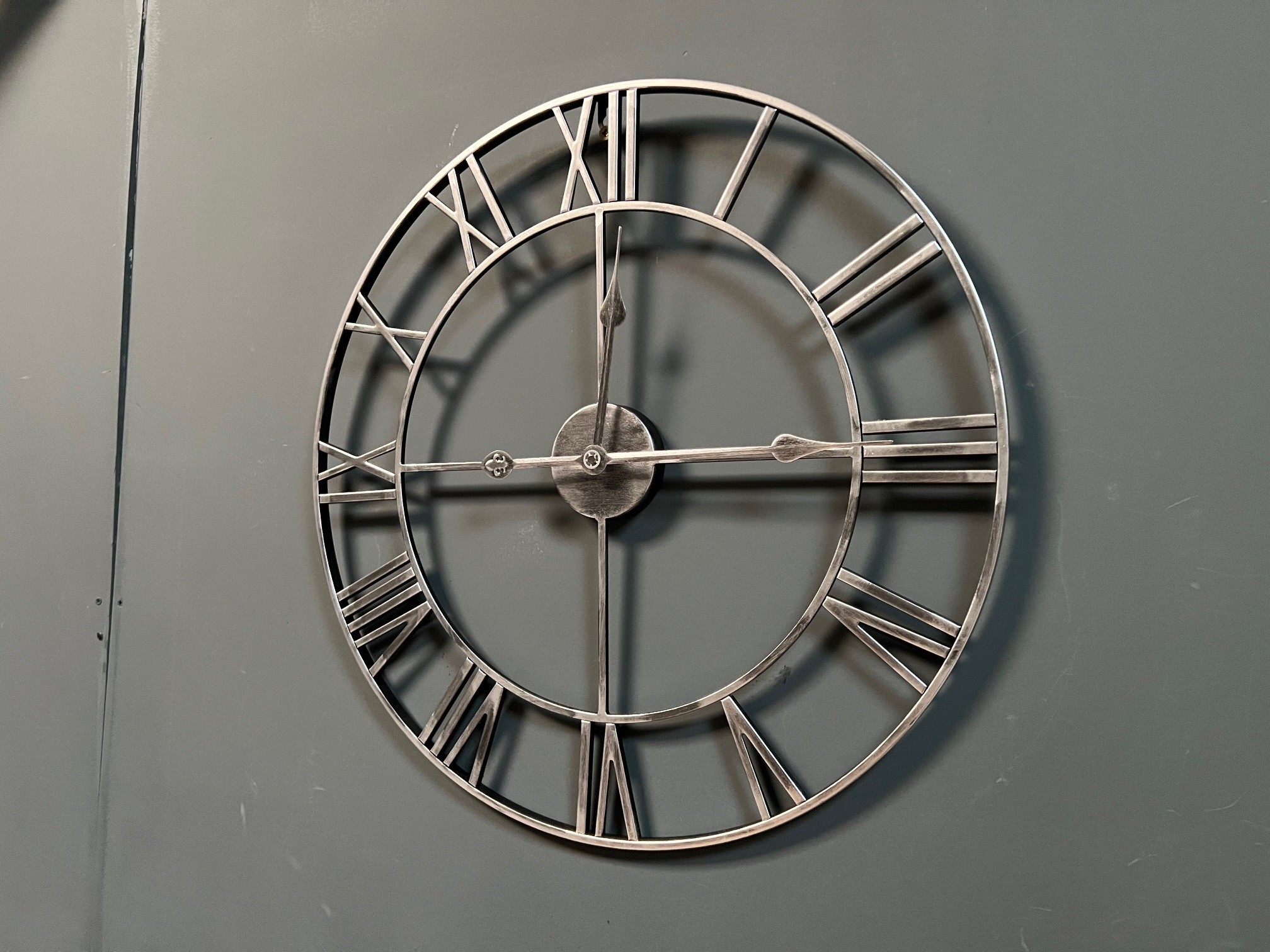 NEW BOXED LARGE SILVER IRON SKELETON ROMAN NUMERAL CLOCK