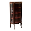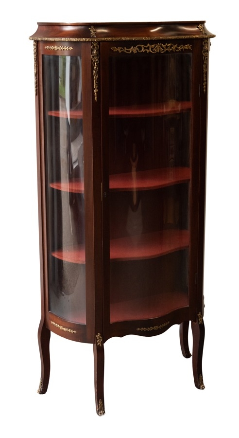 20TH CENTURY MAHOGANY FRENCH-STYLE SERPENTINE FRONTED VITRINE with russet baise shelved interior, chetal mounted, on short cabriole legs, 56" high (142cm)