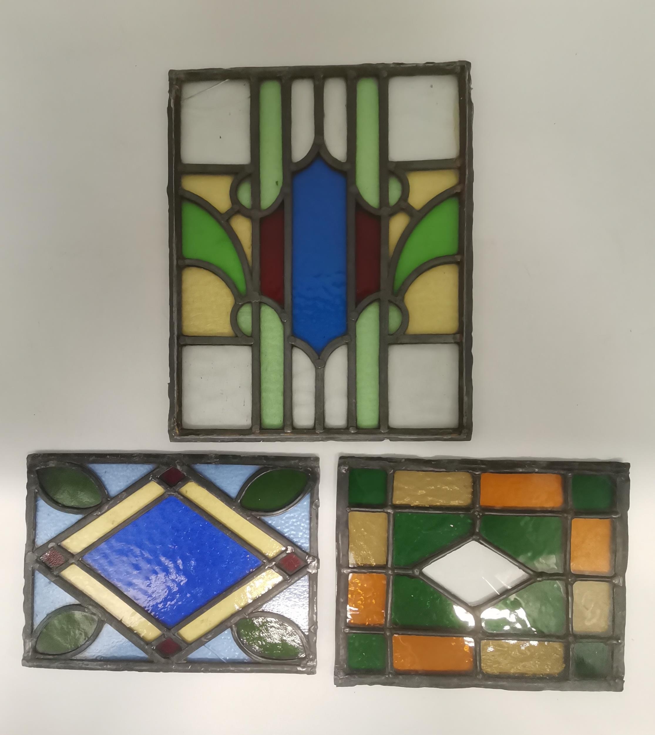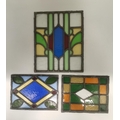 Three leaded stained glass window panes, with assorted lozenge and shaped pattern designs. (3) Largest (a/f) approx. 37.5cm by 30.5cm