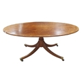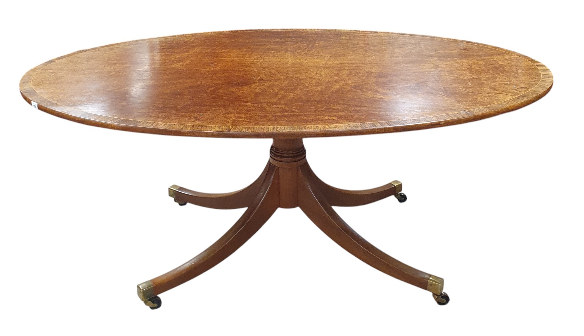 A lovely Regency style Oval Mahogany and Inlaid Supper Table, of large proportions on quatrefoil base with brass castors. 182 x 117 x H 73 cm approx.