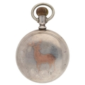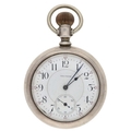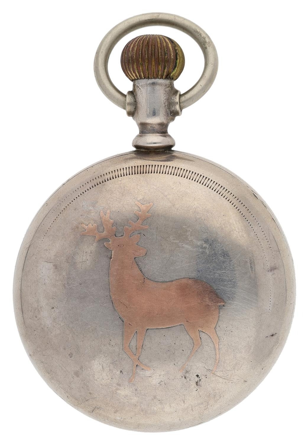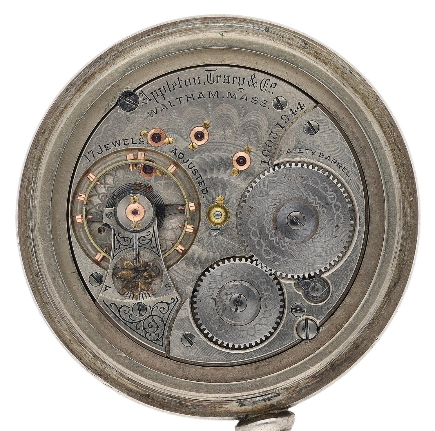 American Waltham 'Appleton Tracy & Co.' lever set pocket watch for repair, serial no. 10031944, circa 1900, signed 17 jewel adjusted movement with safety barrel, compensated balance and regulator, signed dial with Arabic numerals, minute markers with red five minute divisions and subsidiary seconds, blued steel hands, within a Fahys 925/1000 screw case, the case back depicting a stag, 182.8gm, 58mm (movement at fault)
