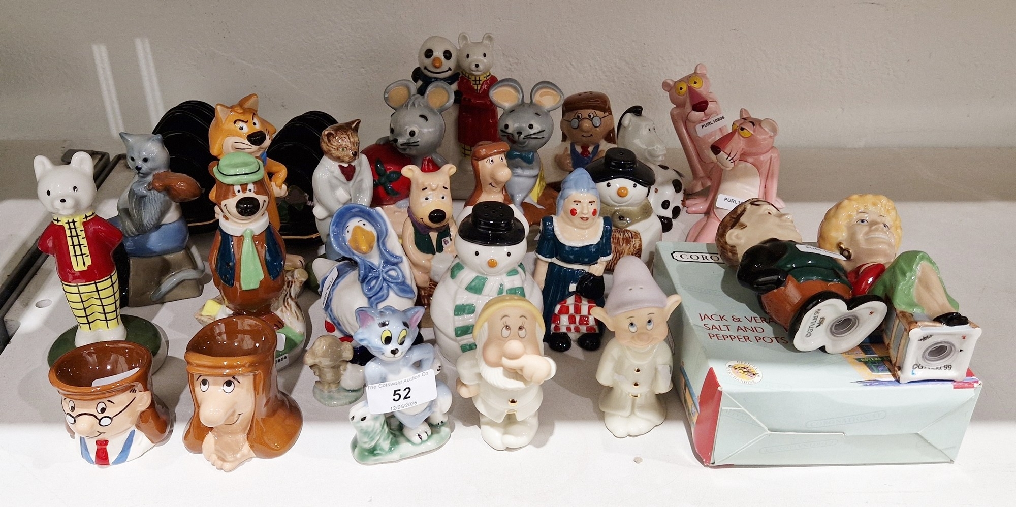Group of Wade bone china character figures including Yogi Bear, Mr Jinx, Rupert no.2, The City Gent, Katkins, Pixie, Dixie, two figures of Pink Panther, a Jack and Vera set of salt and pepper pots, two Tetley tea character eggcups, two Andy Capp toastracks and other items