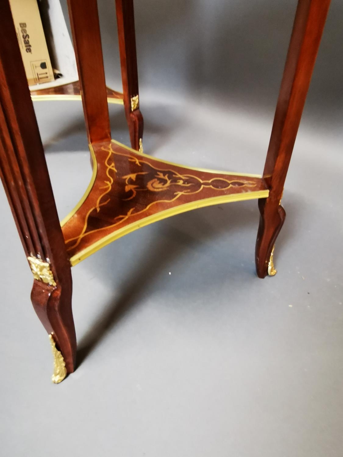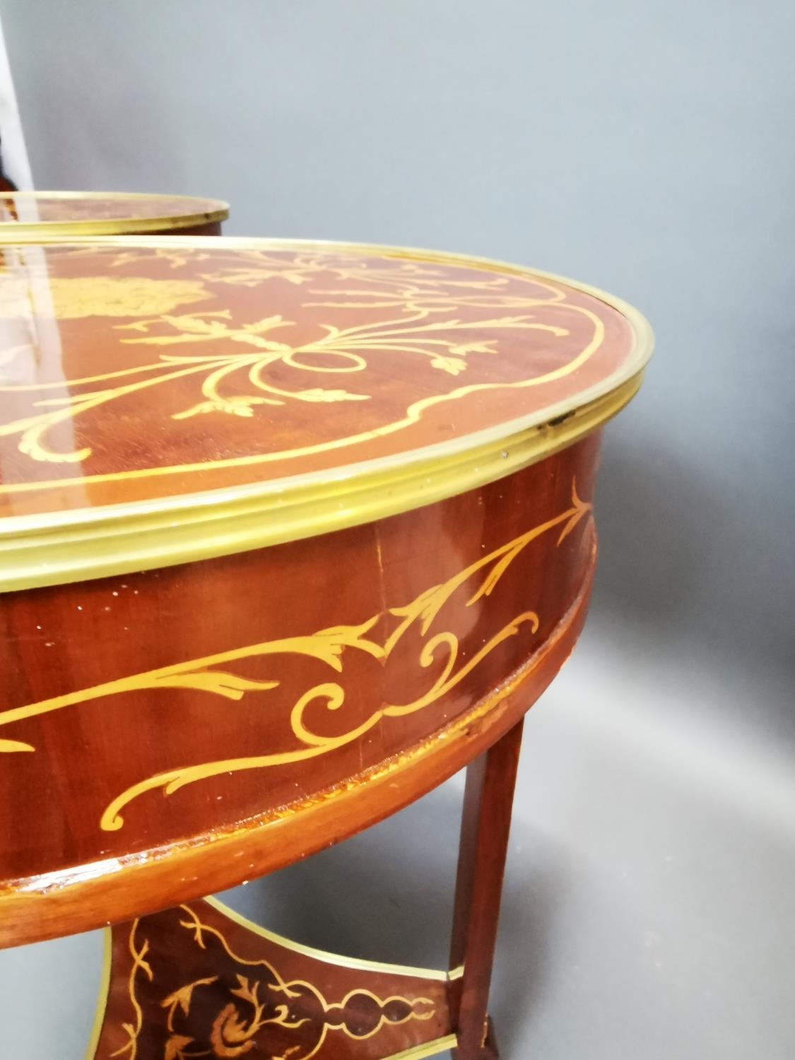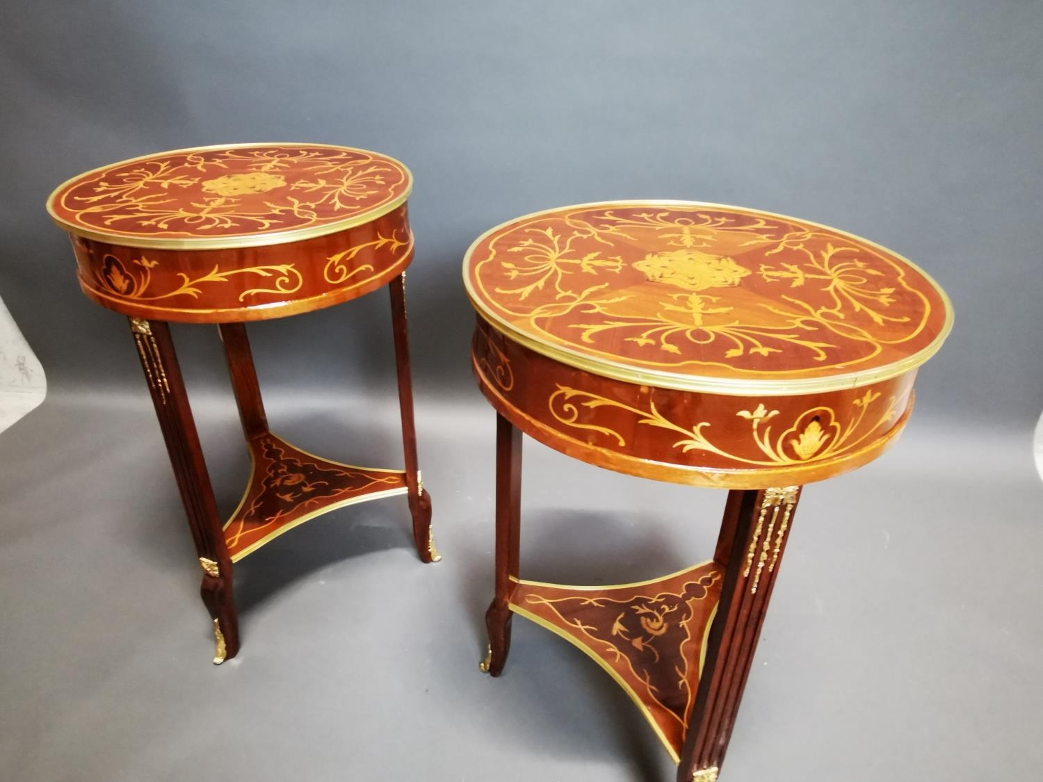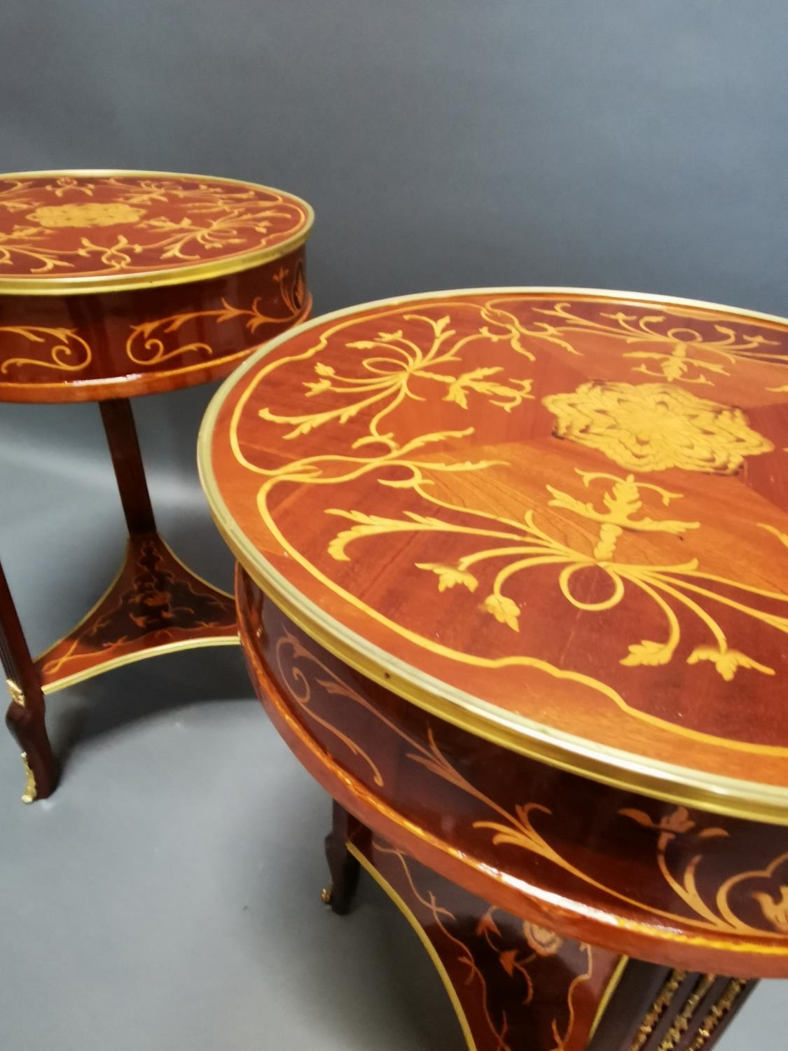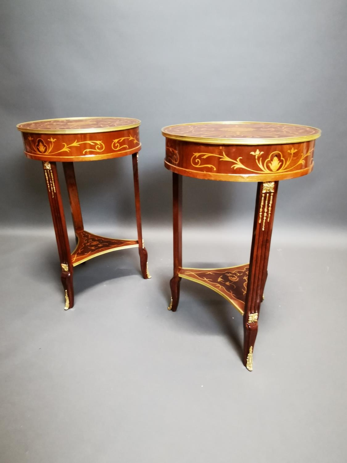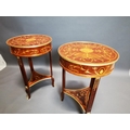 Pair of decorative inlaid kingwood and ormolu mounted wine tables in the French style {80 cm H x 53 cm Dia.}.