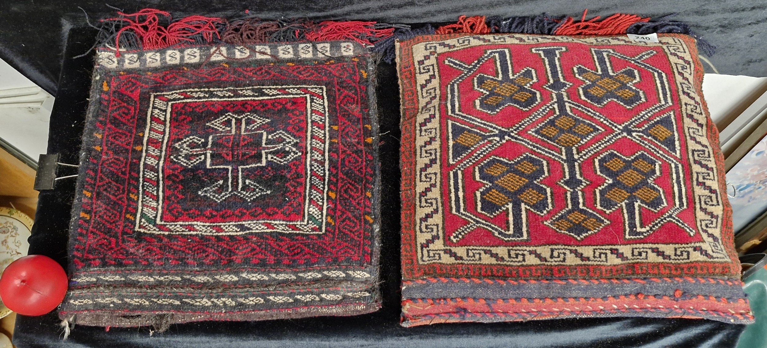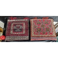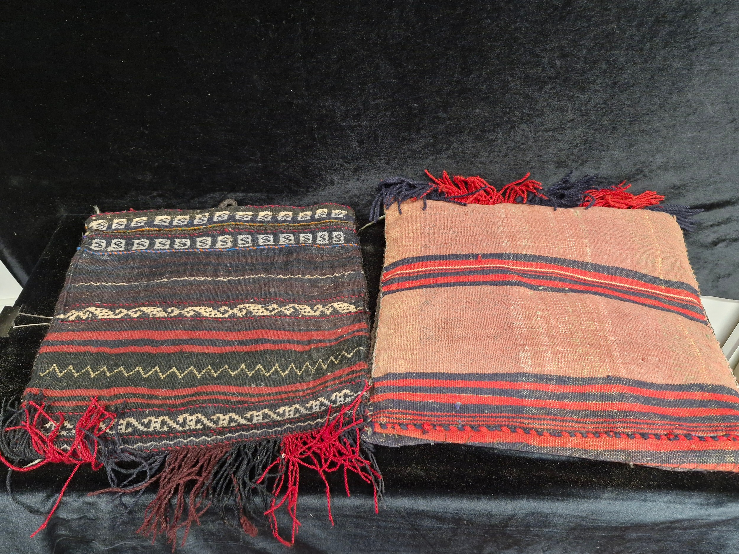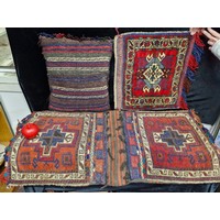 A fascinating hand knotted antique Moroccan camel saddle blanket repurposed into two cushion covers.