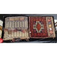 A fascinating hand knotted antique Moroccan camel saddle bla...