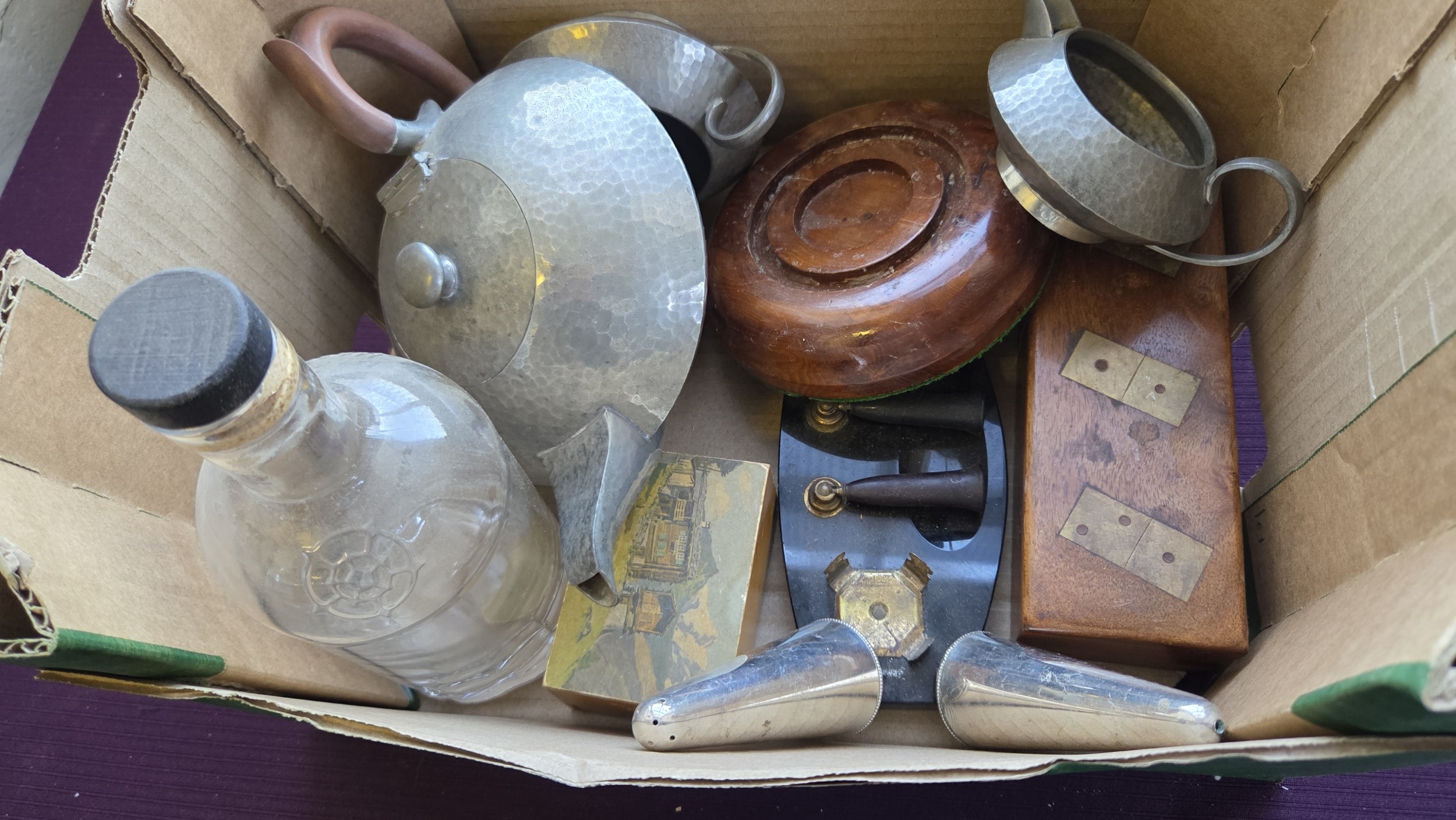 An Assortment of Decorative Collectables and Vintage Items including Arts and Crafts Style Metalware and a Glass Decanter