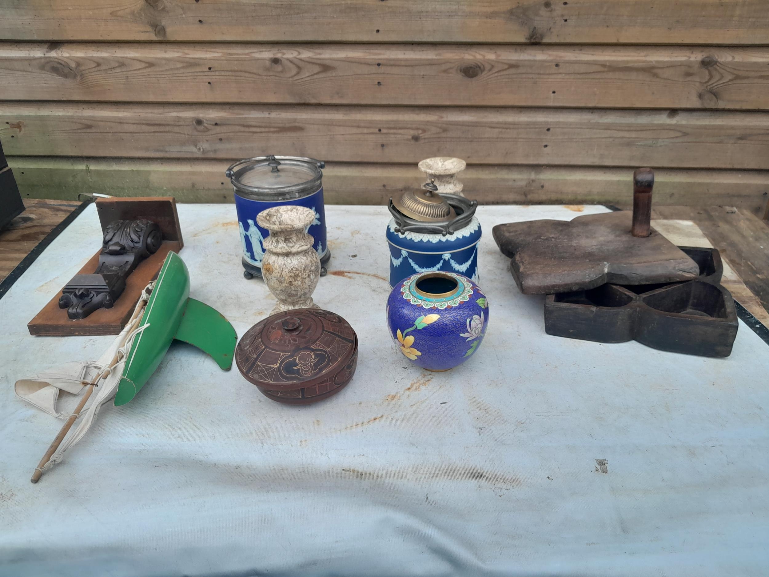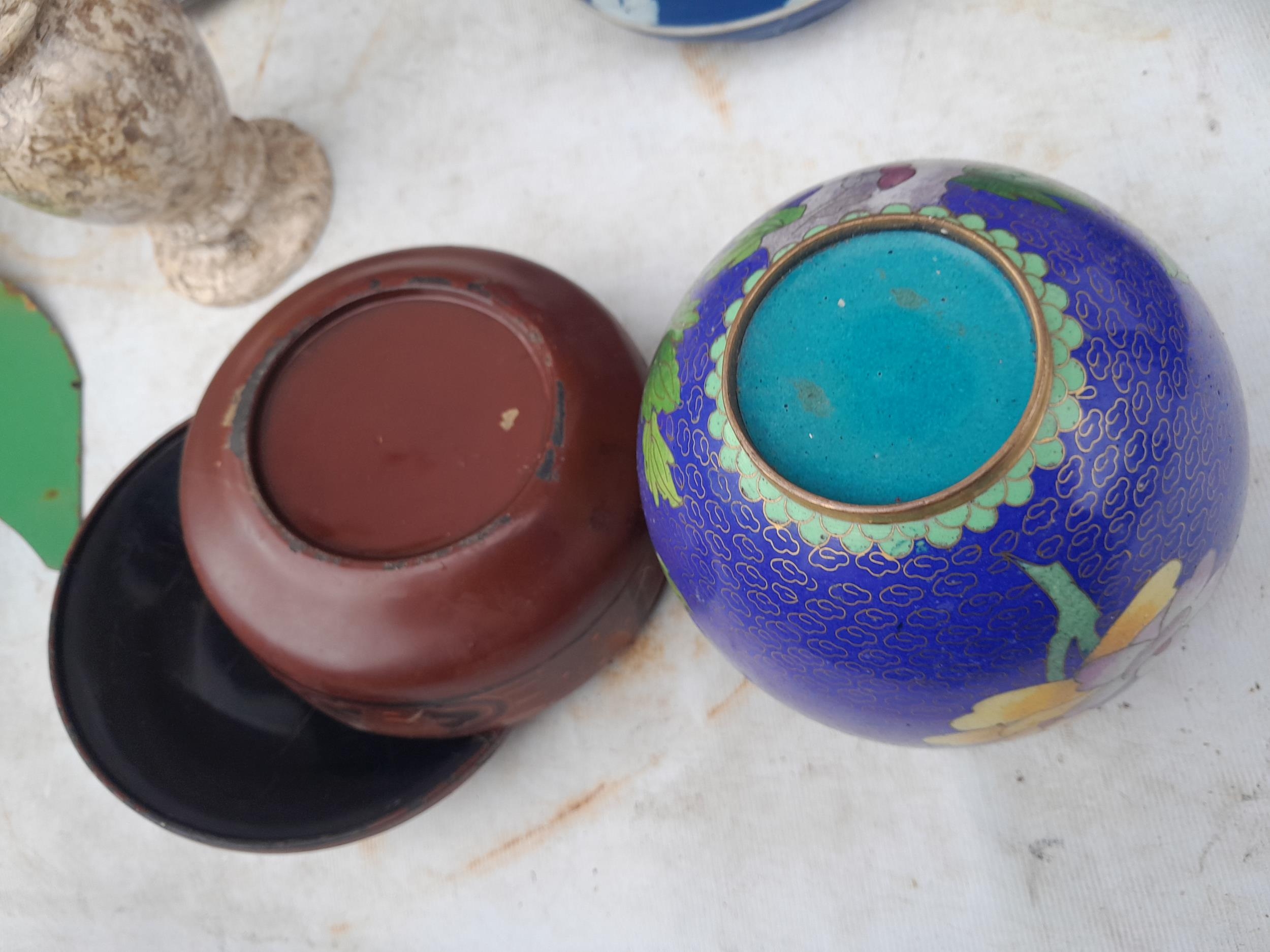 Box of oddments : decorative china, cloisonne bowl, wooden ware, lacquerware etc.
