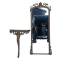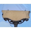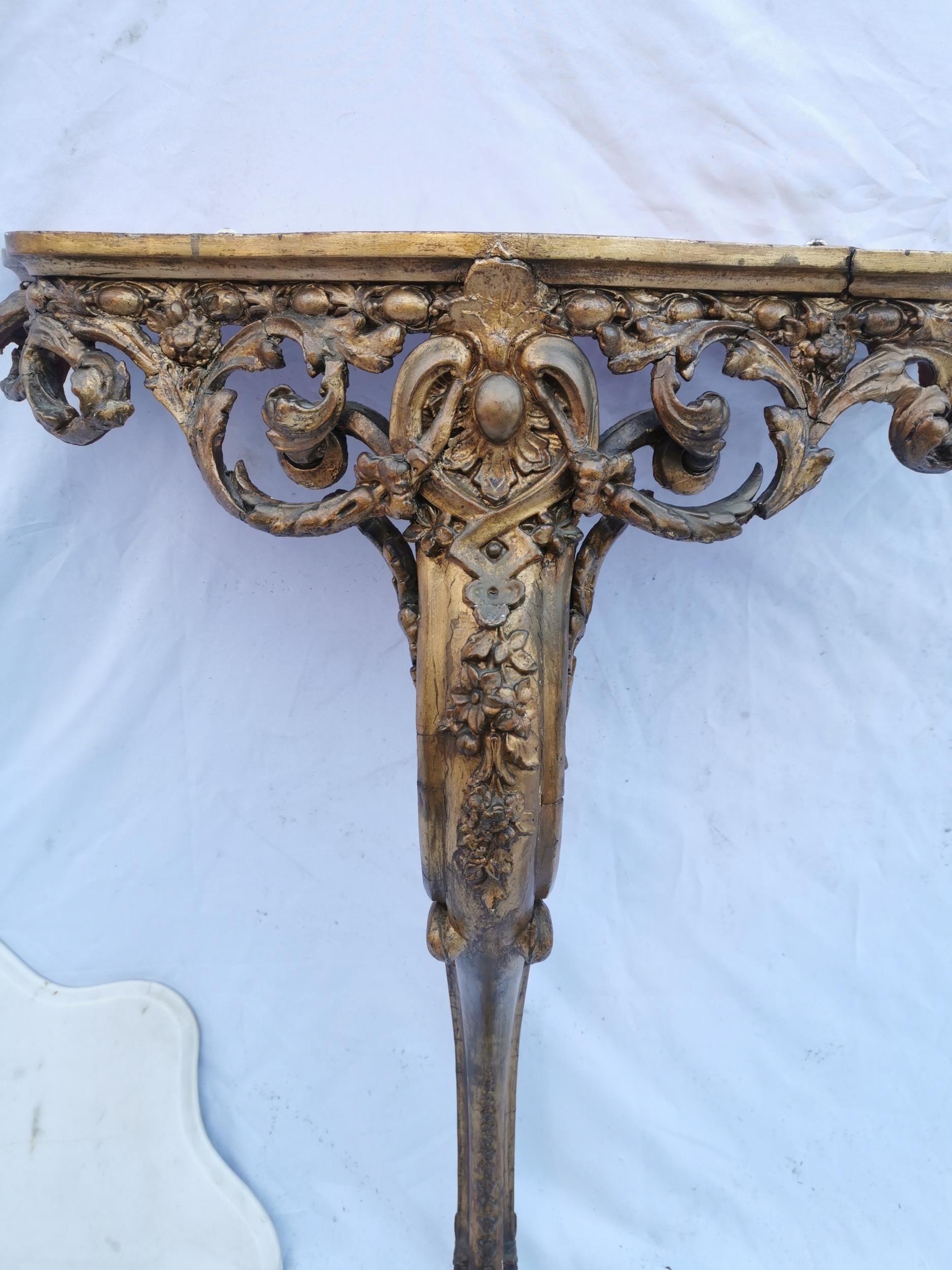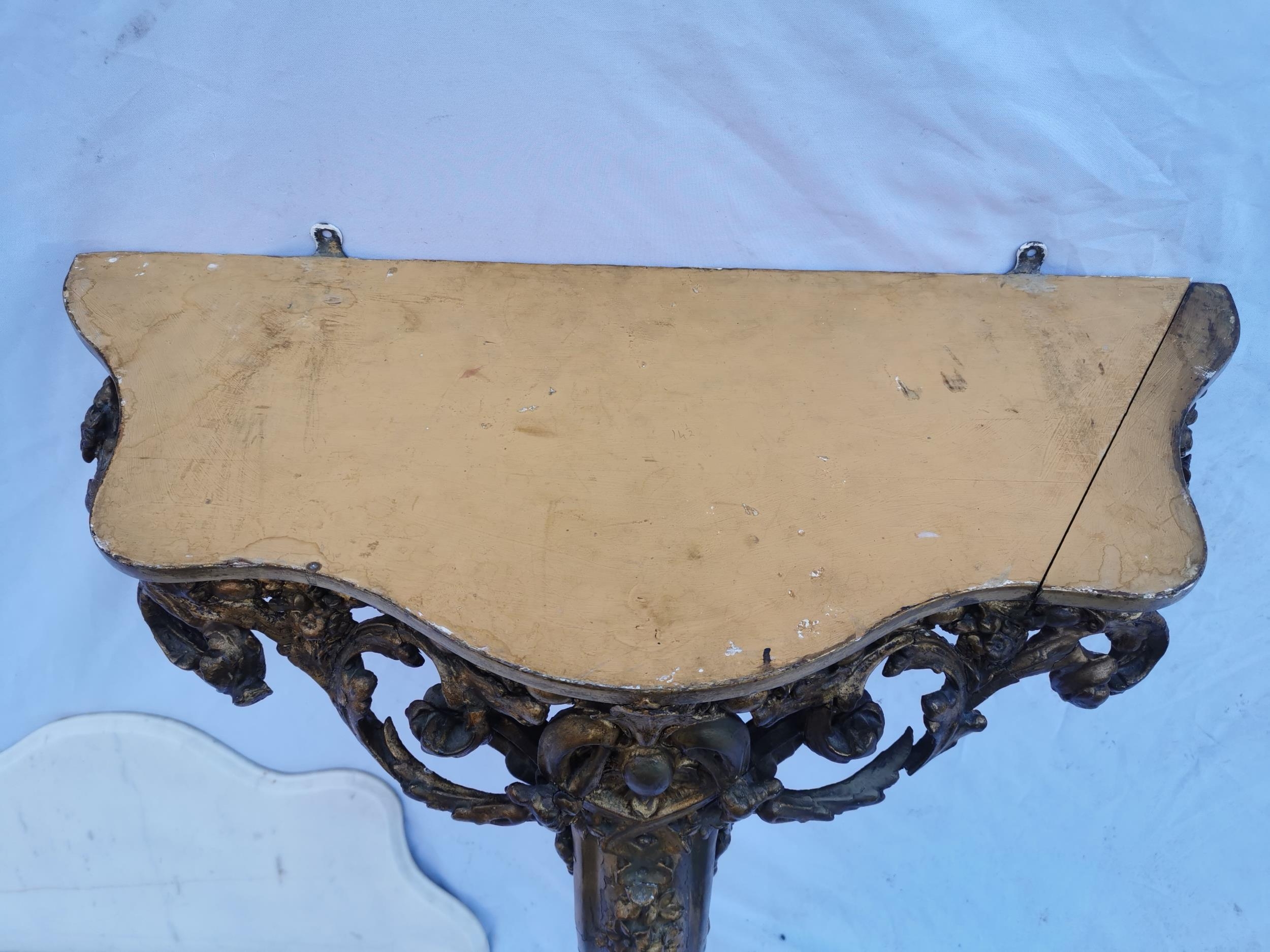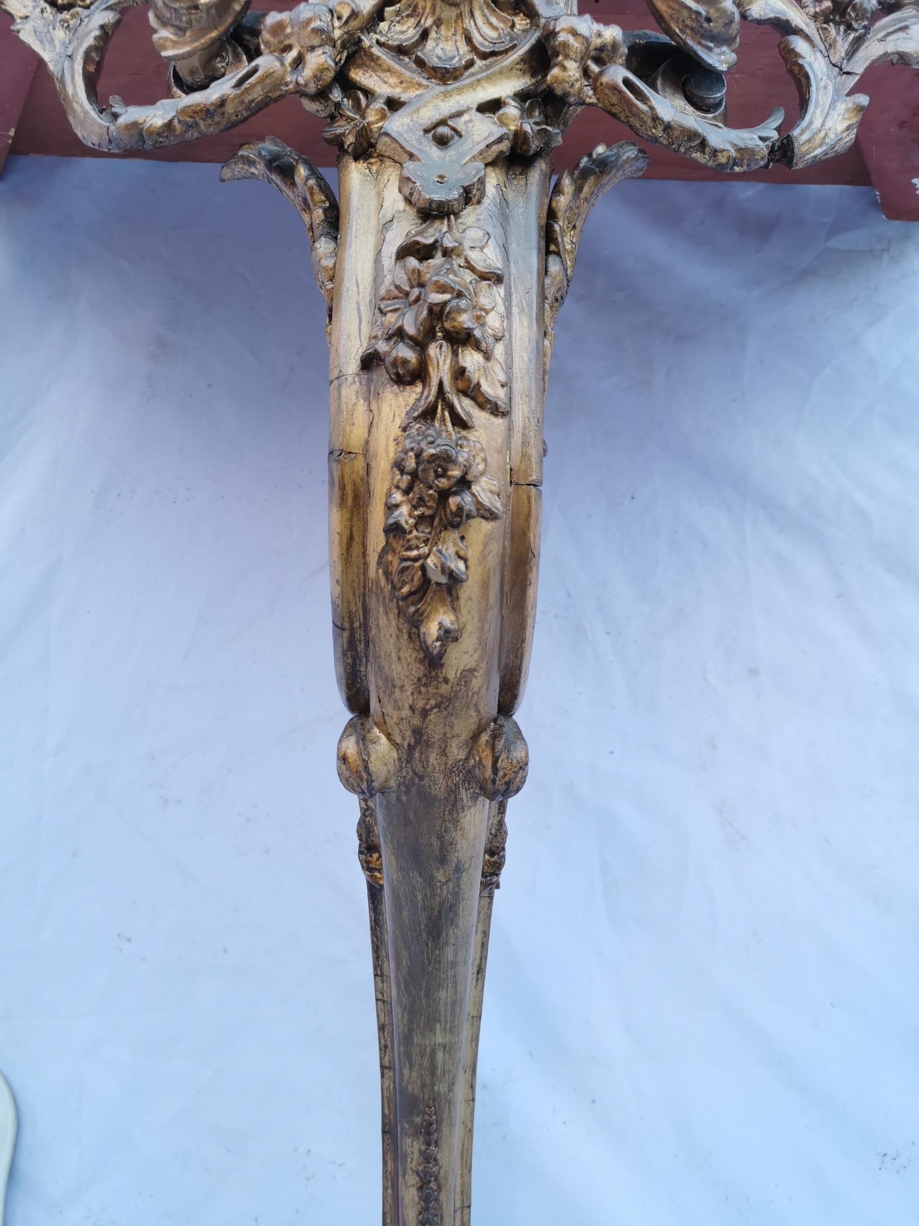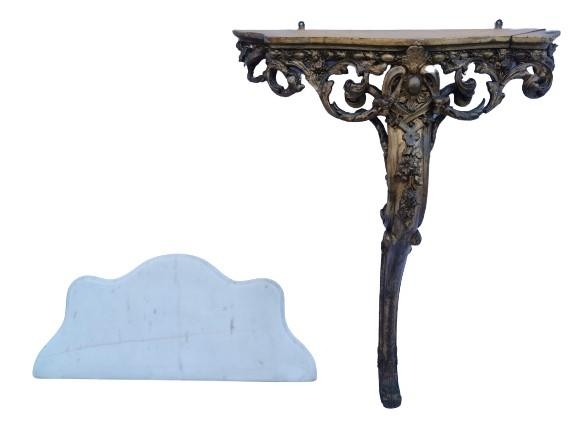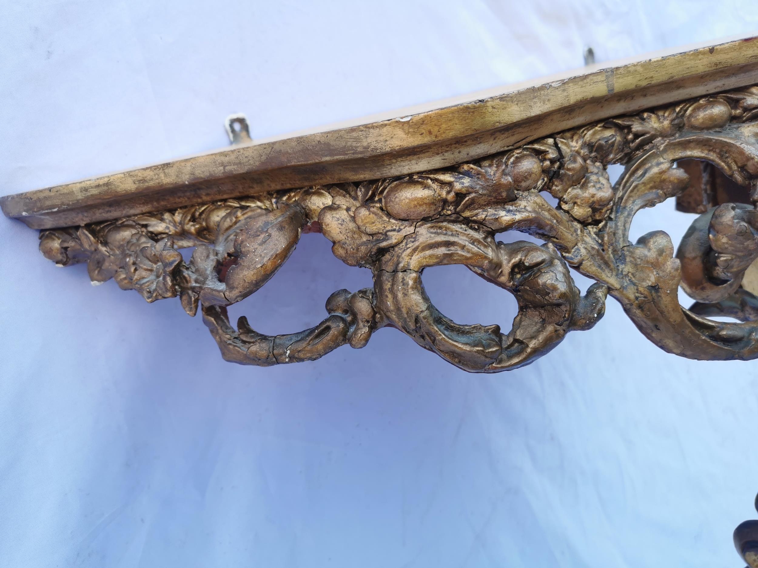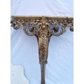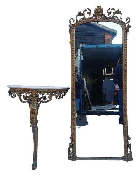 A 19th century giltwood and marble console table and mirror, the table with shaped white marble top, on a single carved foot, surmounted with a tall single plate giltwood mirror with cartouche and acanthus border and scrolled foliate finial, the table 89.5 cm high, the mirror 179 cm high x 67 cm wide